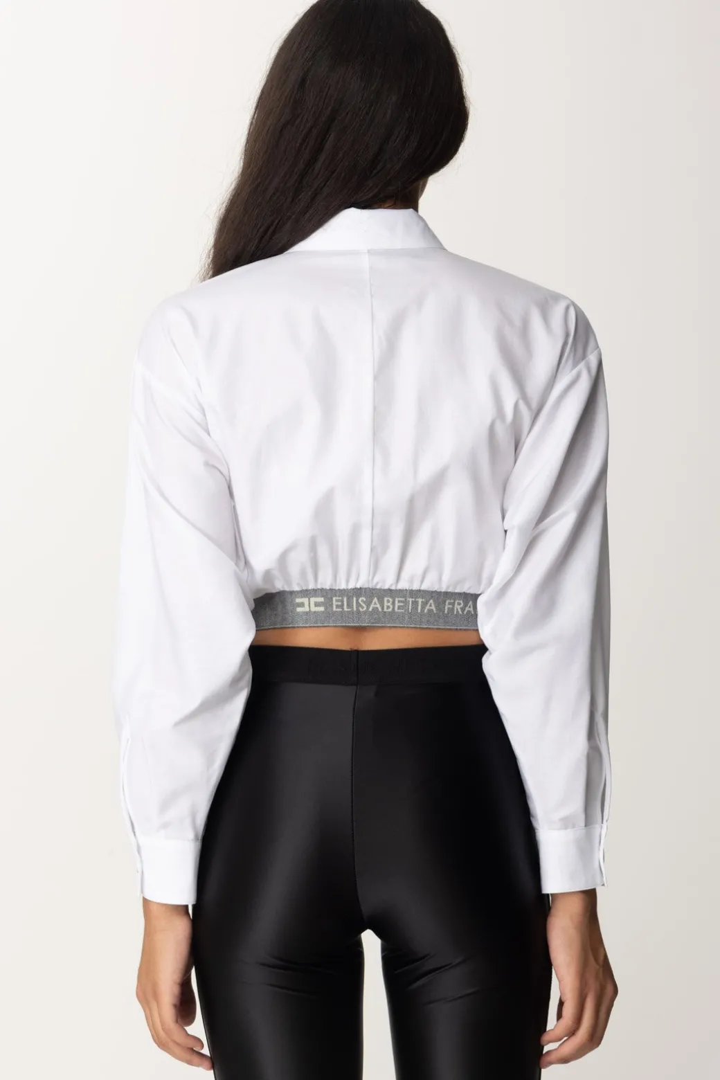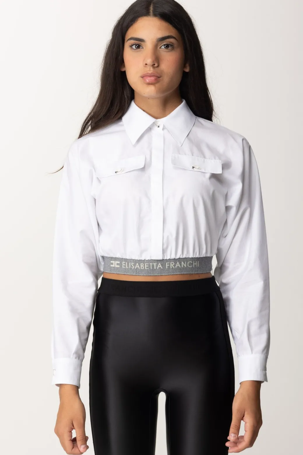 Sfiziosa ed iper femminile camicia Elisabetta Franchi: il taglio crop è reso ancora più interessante dalla presenza di un fascione con logo lettering in lana, oltre che da piccole arricciature che movimentano la linearità del capo. Manica baloon e taschine sul petto, un top versatile e ricercato, tra i must di stagione.