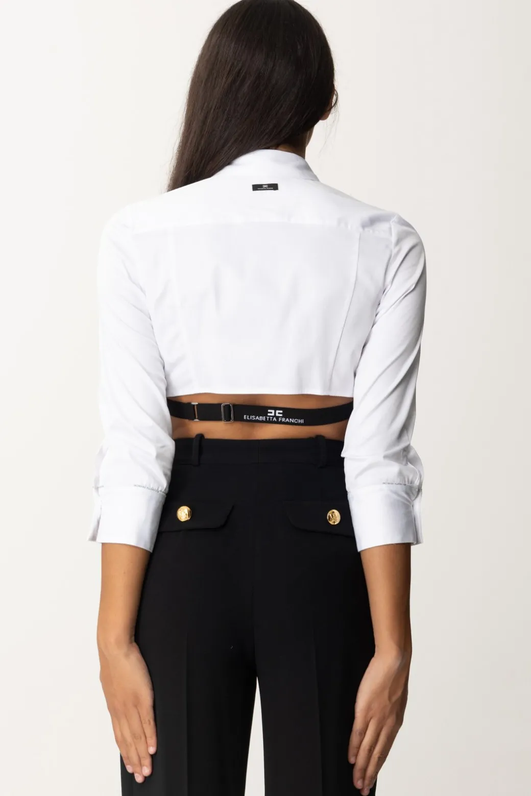 Una camicia Elisabetta Franchi che di classico non ha proprio nulla, e non solo per il tagglio crop! Un originale plastron con profili logati che ritornano anche ai polsini e l’elastico regolabile sul retro, che aggiunge un ornamento cool ai tuoi look. Ideale da indossare con denim e bottom casual, ma anche per dare un twist ai tuoi bottom più classici per un effetto glamour chic.