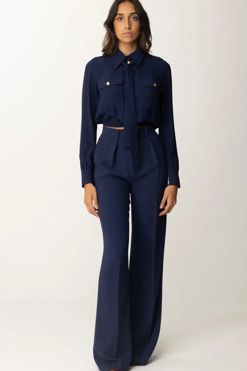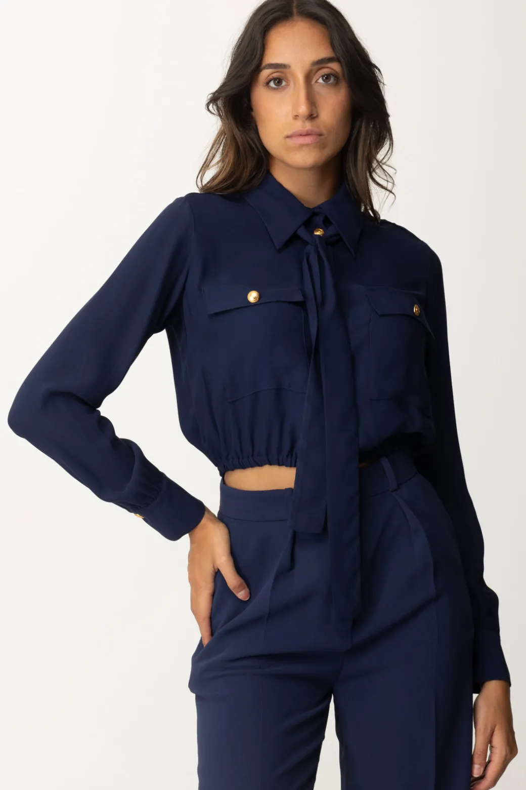 Camicia Elisabetta Franchi dal taglio crop caratterizzato dal punto vita elasticizzato, che aggiunge una nota casual a questo top. Coletto corredato da foulard da annodare a piacimento, un capo a metà strada tra il versatile e il bon ton per completare i tuoi outfit più svariati.