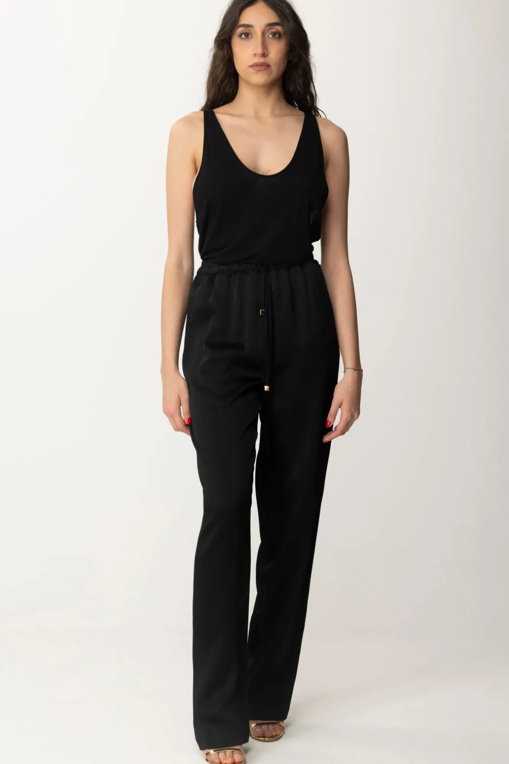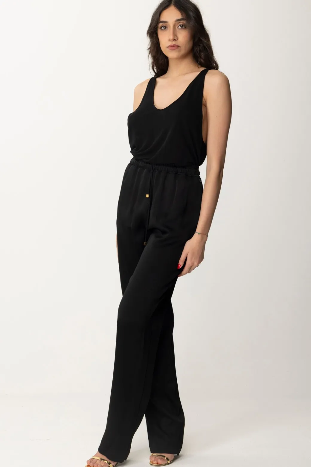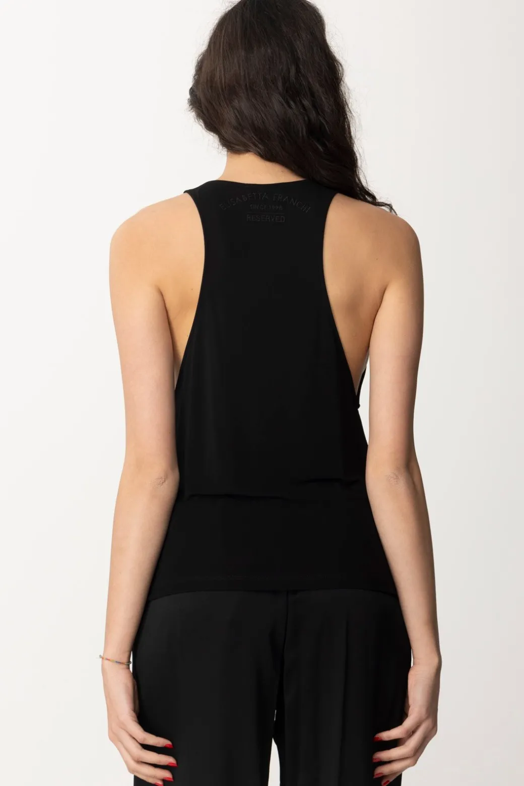 Versatilità come parola d’ordine, questa canotta Elisabetta Franchi in jersey crepe leggero è il tuo passe-par-tout da tenere nel guardaroba pronto all’uso: come sottogiacca, come top sulle tue gonne e pantaloni più flashy, sui tuoi jeans più casuale e così via. Scollatura profonda e taglio olimpionico, logo ricamato in tinta sul retro come ultima nota di stile.