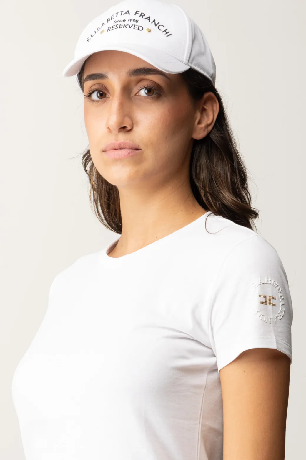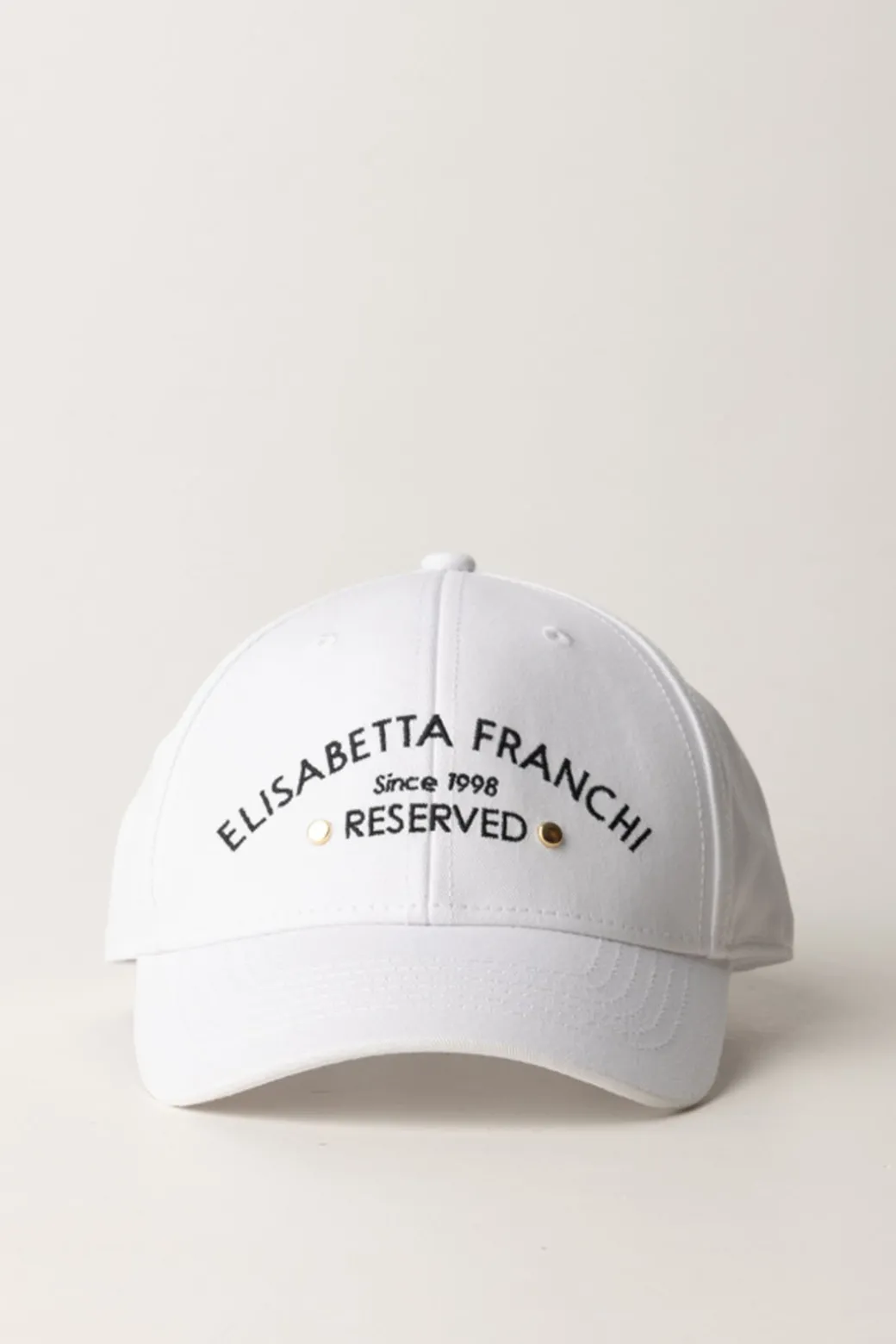 Cappello da baseball Elisabetta Franchi impreziosito dal logo lettering a contrasto ricamato sul davanti e due piccole borchie gold. Un accessorio trendy e versatile, perfetto per aggiungere un tocco sportivo ai tuoi outfit.