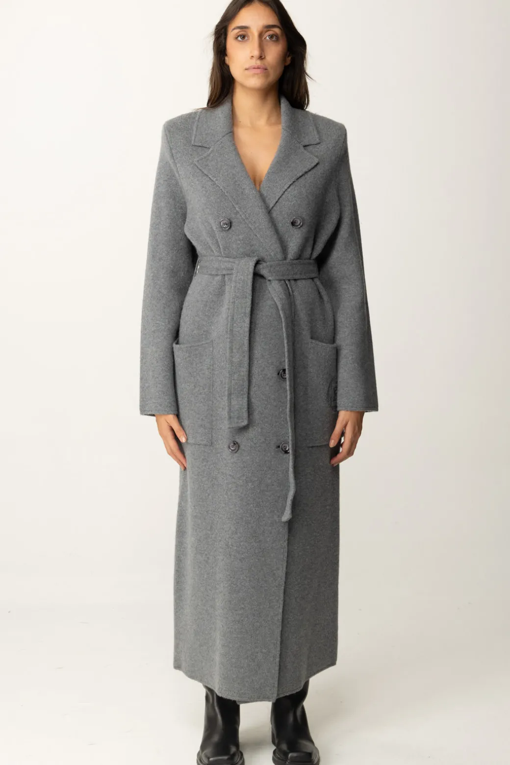 Cappotto Elisabetta Franchi realizzato in morbida maglia misto lana e cachemire con un design essenziale e sofisticato, completato da una cintura in vita per esaltare la silhouette, maxi tasche laterali con stemma ricamato e ampi revers. Un capo versatile da portare con stivali alti o mocassini per un look elegante e funzionale durante le giornate invernali.
