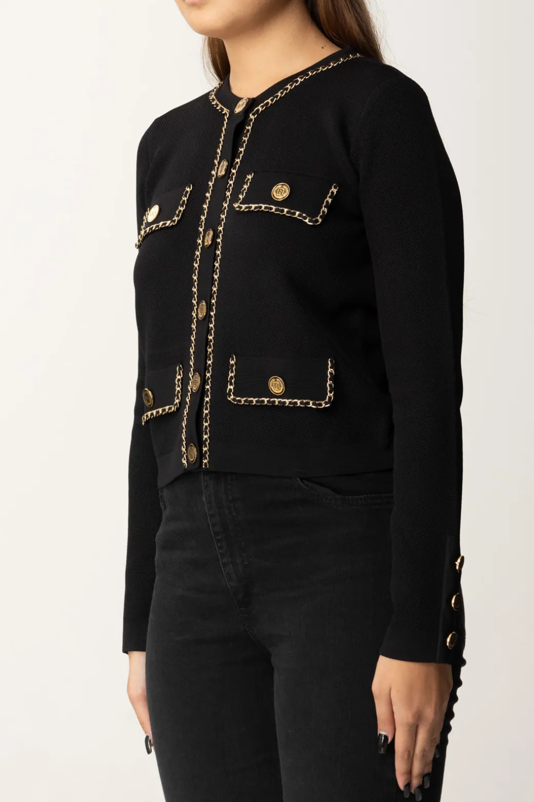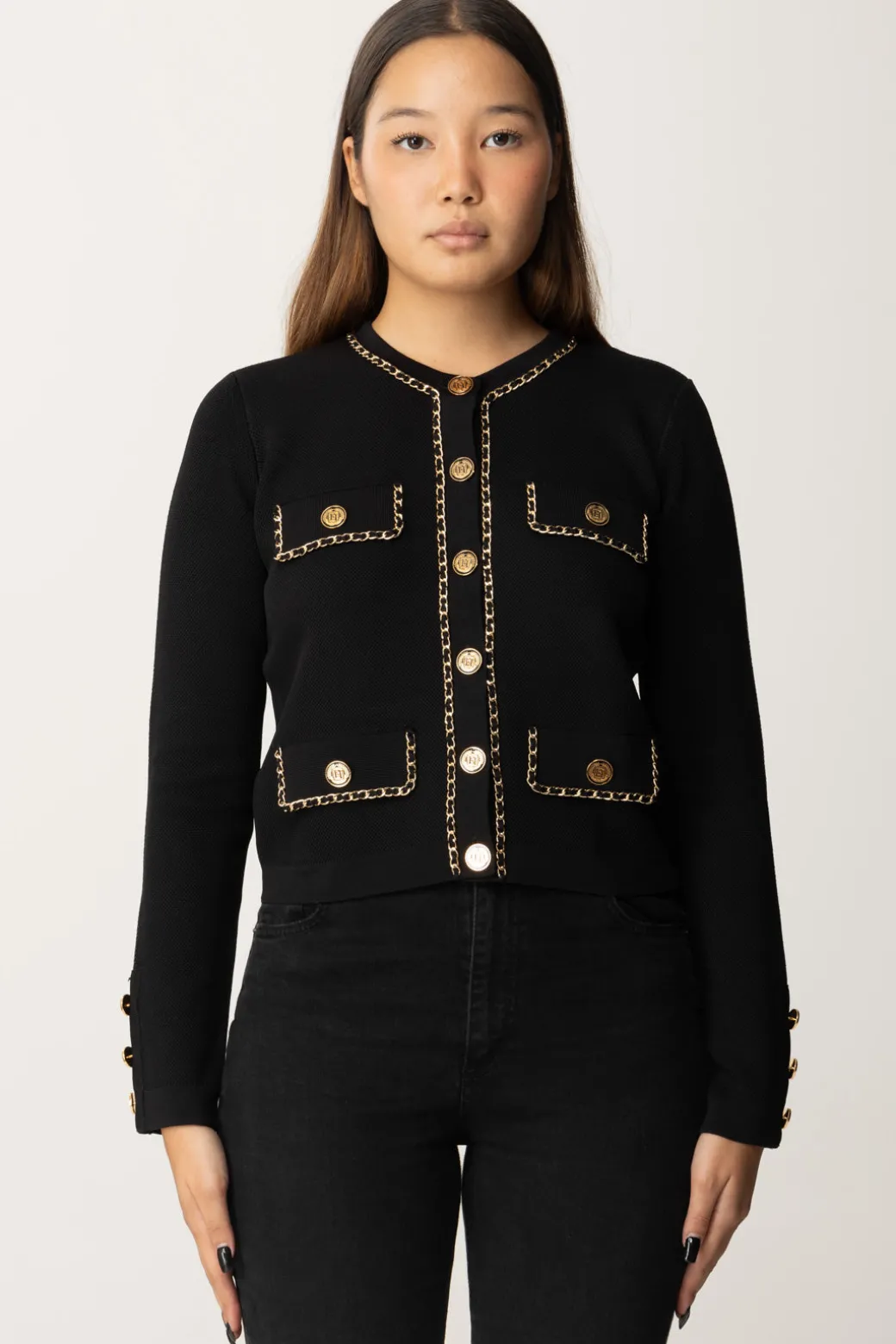 Grazioso e bon-ton cardigan in viscosa Elisabetta Franchi, dal taglio cropped, abbellito dal’applicazione di catenelle dorate lungo i profili e sulle pattine delle tasche frontali. Un capo delizioso, da indossare sia in combinazione con altri top, che come top a sè, per apportare una nota di femminilità ai tuoi look con semplicità.