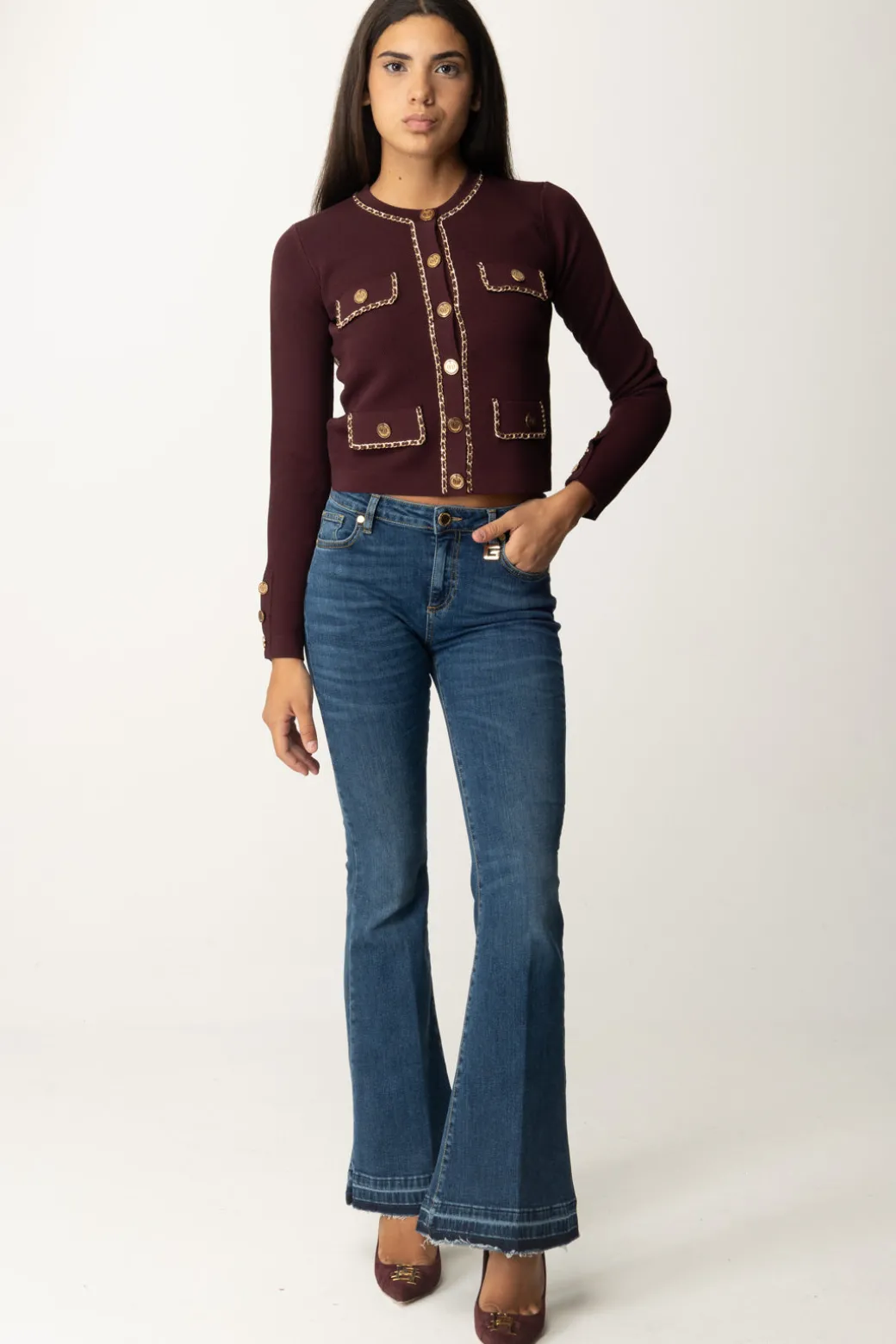 Grazioso e bon-ton cardigan in viscosa Elisabetta Franchi, dal taglio cropped, abbellito dal’applicazione di catenelle dorate lungo i profili e sulle pattine delle tasche frontali. Un capo delizioso, da indossare sia in combinazione con altri top, che come top a sè, per apportare una nota di femminilità ai tuoi look con semplicità.