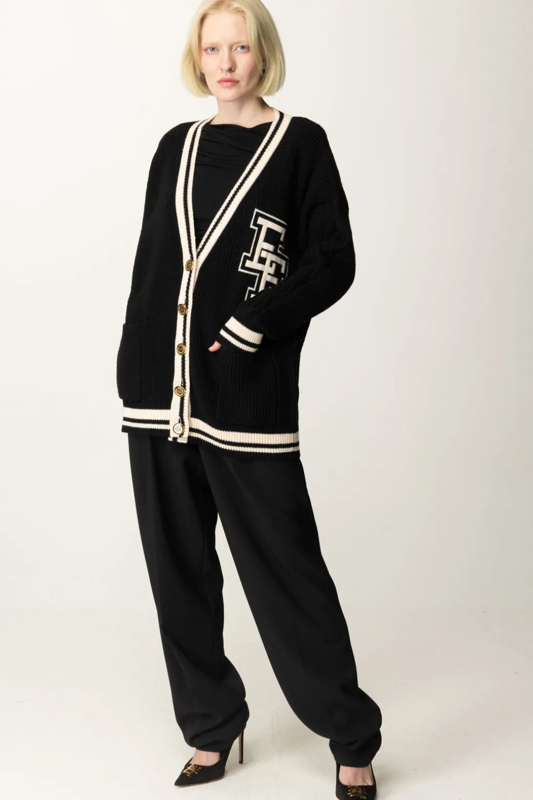 Cardigan in lana a maniche lunghe con finiture in contrasto colore. È caratterizzato da spalla scesa, abbottonatura monopetto bassa e maxi lettere jacquard stile college.