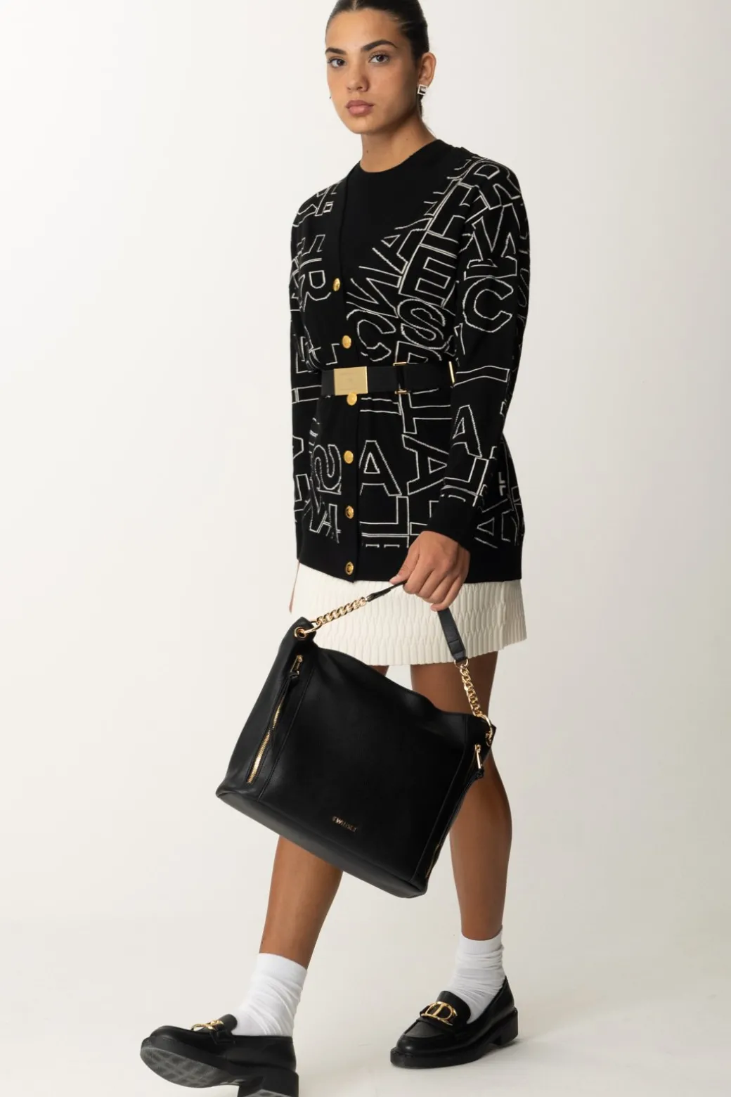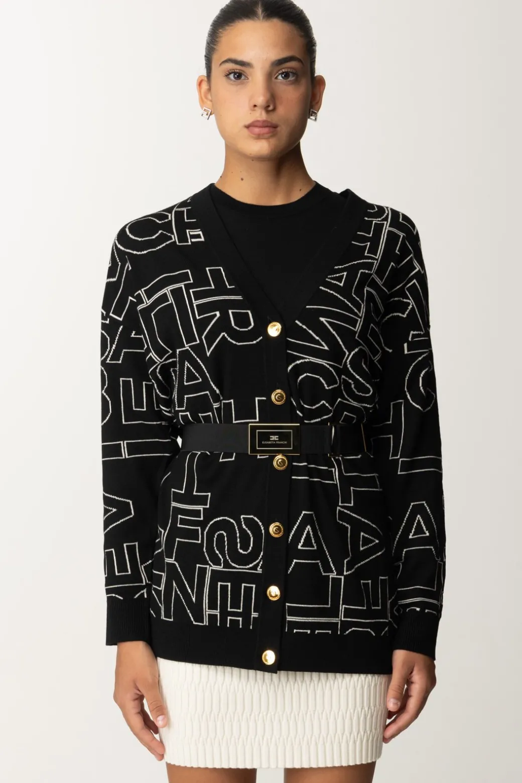 Questo cardigan Elisabetta Franchi conquista i cuori di tutte le amanti della moda e dello stile cozy-chic! Realizzato in misto lana, impreziosito da lettering all over a contrasto e illuminato dalla cintura in vita con placca logata in oro che richiama la chiusura con bottoni. Confortevole e stiloso, abbinalo a jeans skinny e stivaletti.