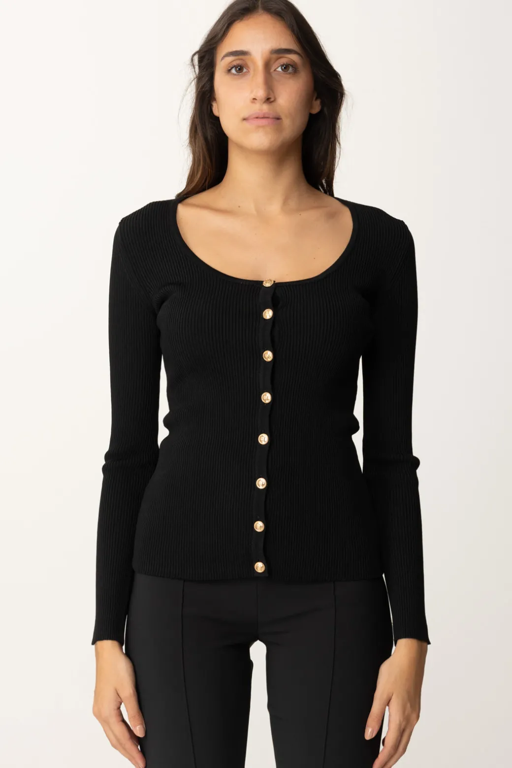 Un cardigan Elisabetta Franchi in misto viscosa, con scollo a madonna e un design semplice e raffinato, con dettagli a costine e bottoni dorati. Perfetto per look casual o da ufficio, è un capo versatile che si abbina facilmente a gonne o pantaloni.