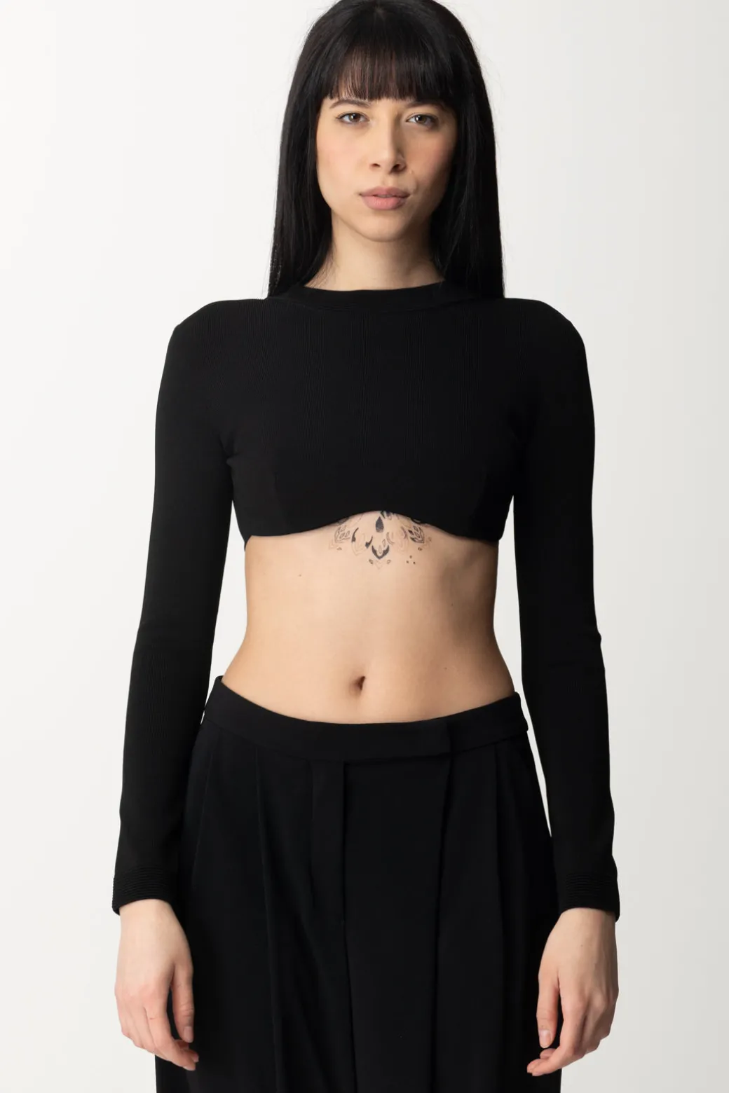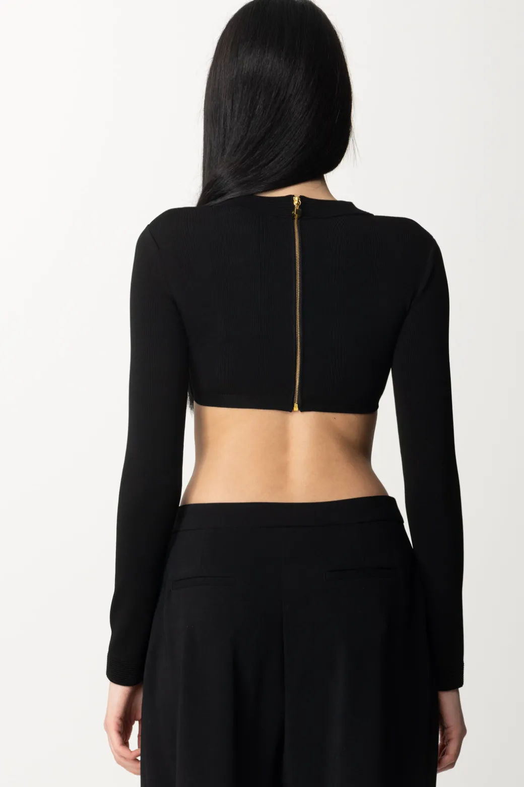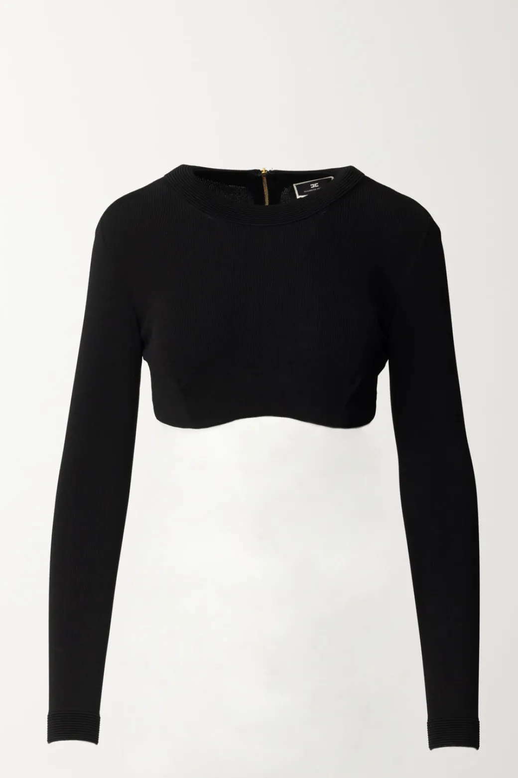 Top Crop Elisabetta Franchi in viscosa lucida che abbraccia la silhouette femminile con finiture a tubetti e sostegno interno per coppe. Il taglio al seno aggiunge un tocco di sensualità senza rinunciare allo stile sofisticato.