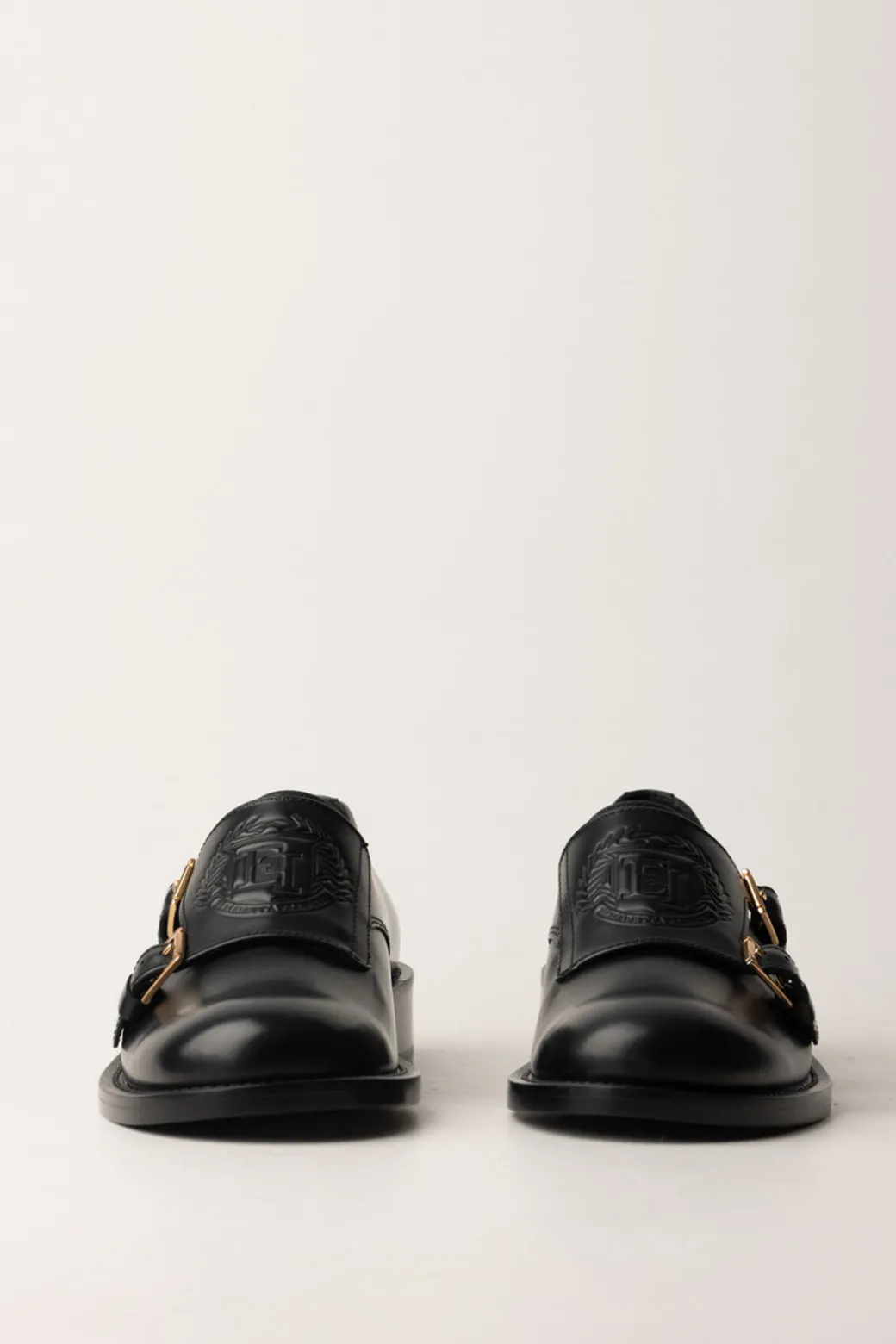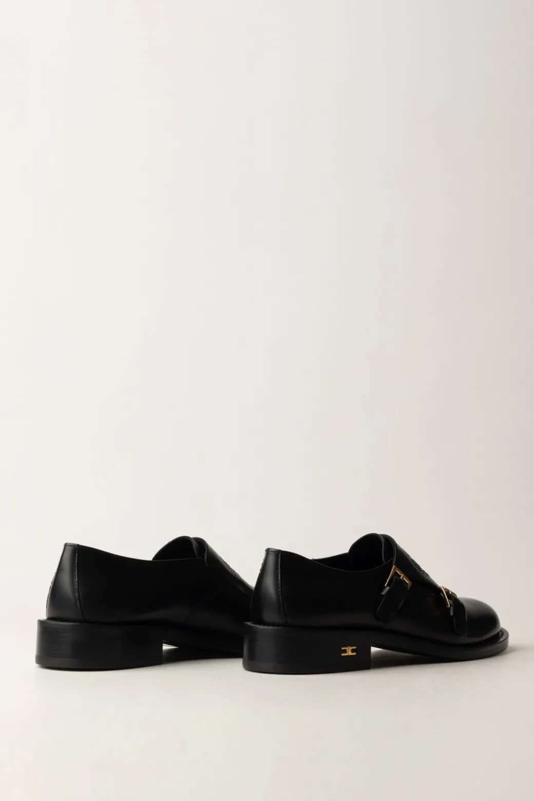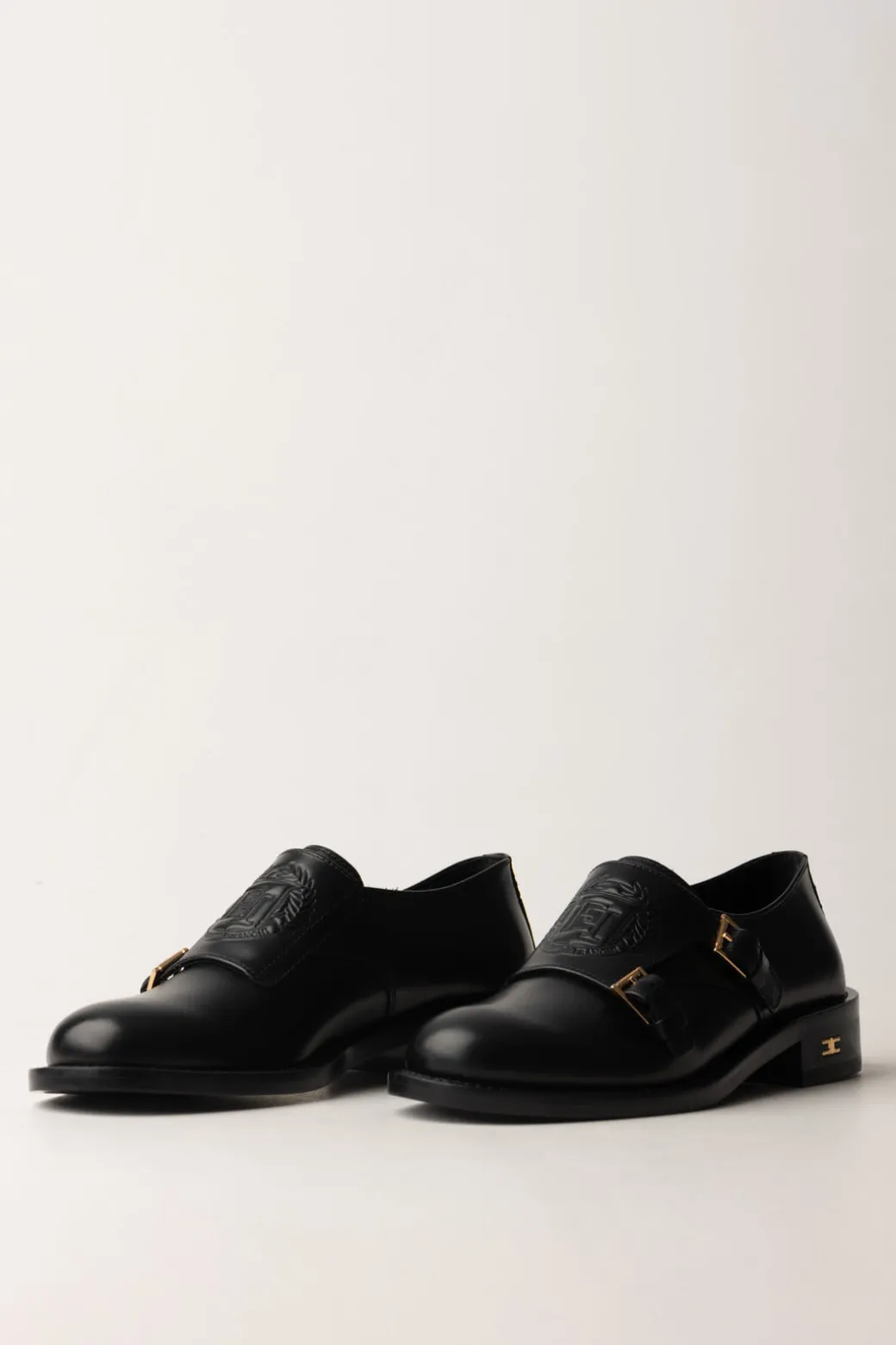Derby Elisabetta Franchi in vitello spazzolato, con punta arrotondata e patta con stemma logo embossed. Le fibbie in metallo gold aggiungono un tocco di classe a questo classico intramontabile. Perfetti con pantaloni sartoriali e una camicia in lino per un look elegante da ufficio o con jeans e un blazer per un outfit raffinato e informale.