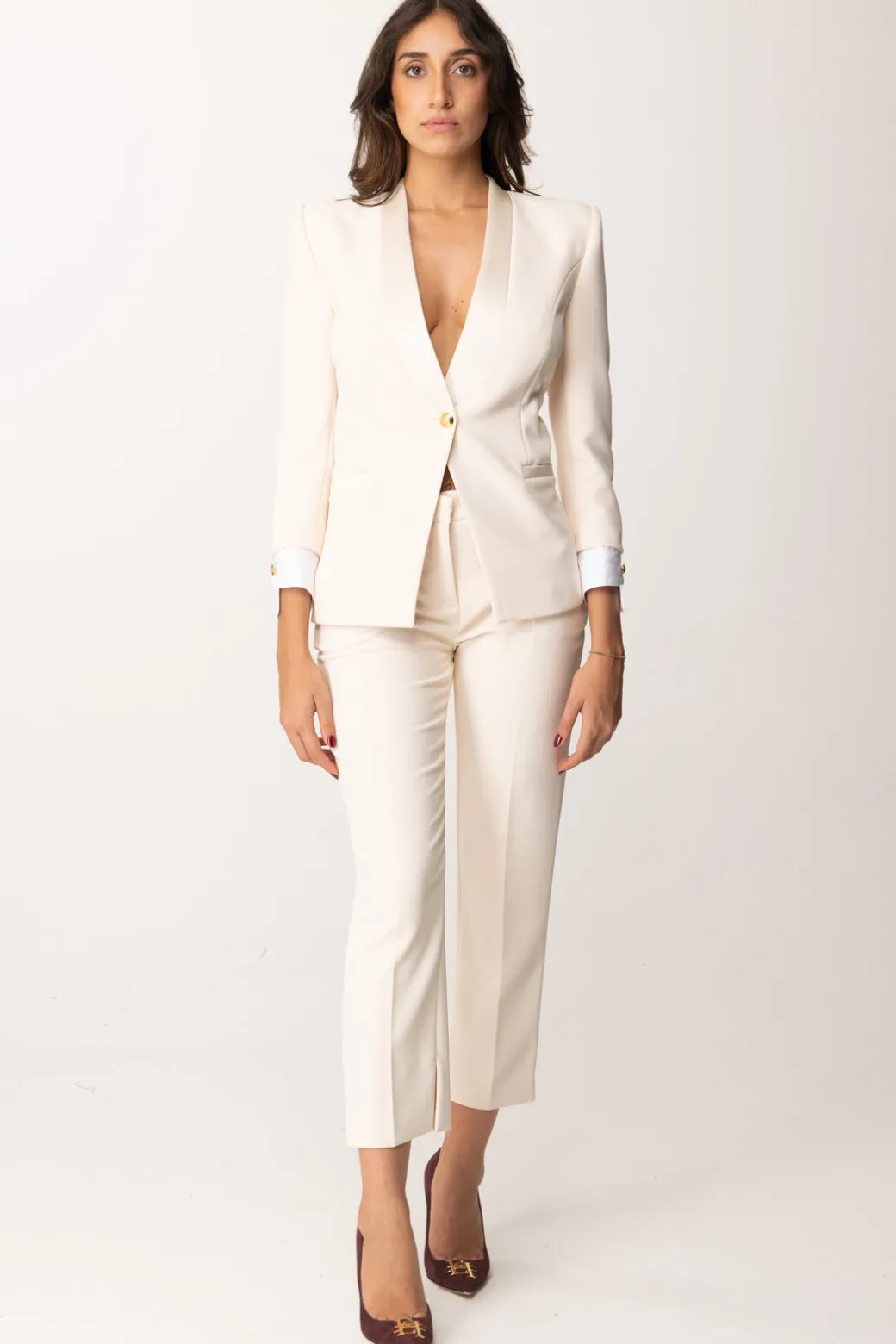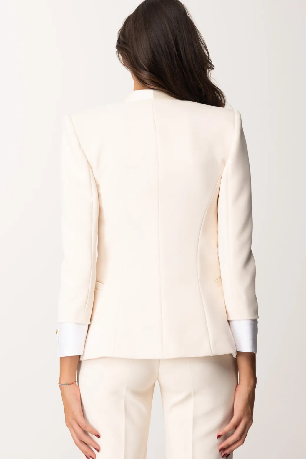 Allure sofisticata per questa giacca Elisabetta Franchi in crepe stertch e vestibilità slim, che presenta dettagli in raso – il rever sciallato, le tasche a filetto – e maniche a tre quarti corredate da polsini in cotone. Chiusura monopetto con bottone gold, un capo che renderà i tuoi outfit chic ancora più chic!