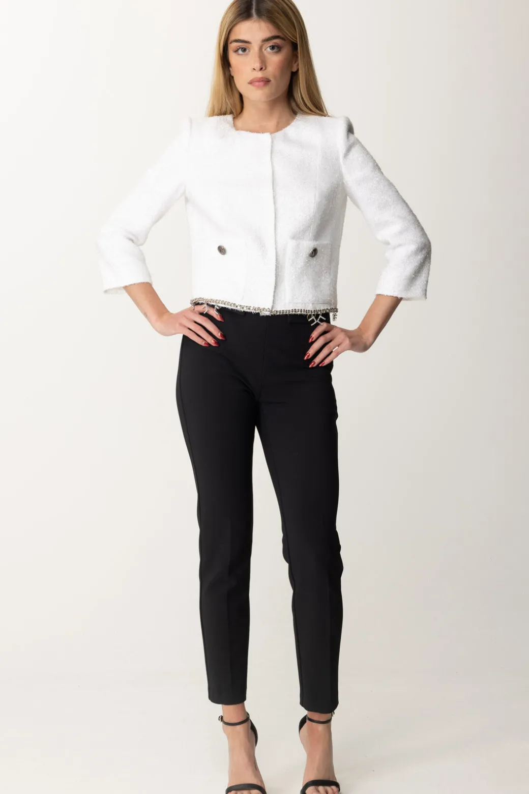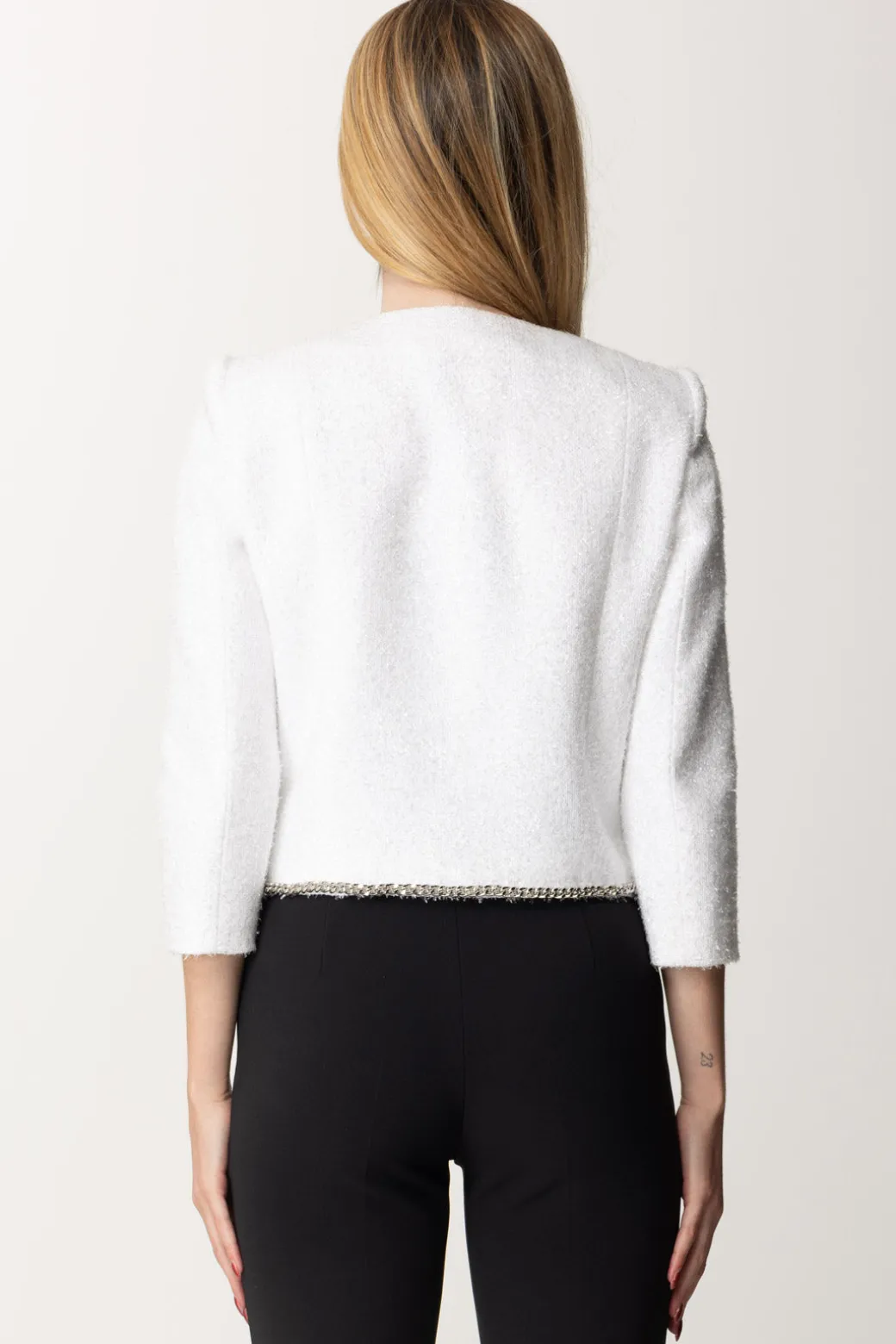 Appariscente e originale giacca corta Elisabetta Franchi che rende protagonista il tweed lurex per avvicinarsi al trend metal della stagione in modo tutto suo. Taglio corto, maniche a tre quarti e girocollo, l’orlo inferiore è completato da una catena in metallo da cui tintinnano i charms logo in strass del brand: un dettaglio che aggiunge una nota luxury, e sicuramente di carattere, ai tuoi outfit.