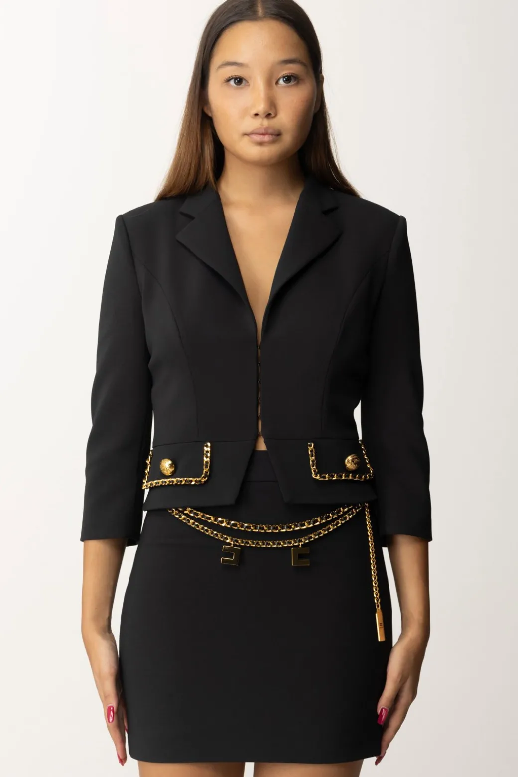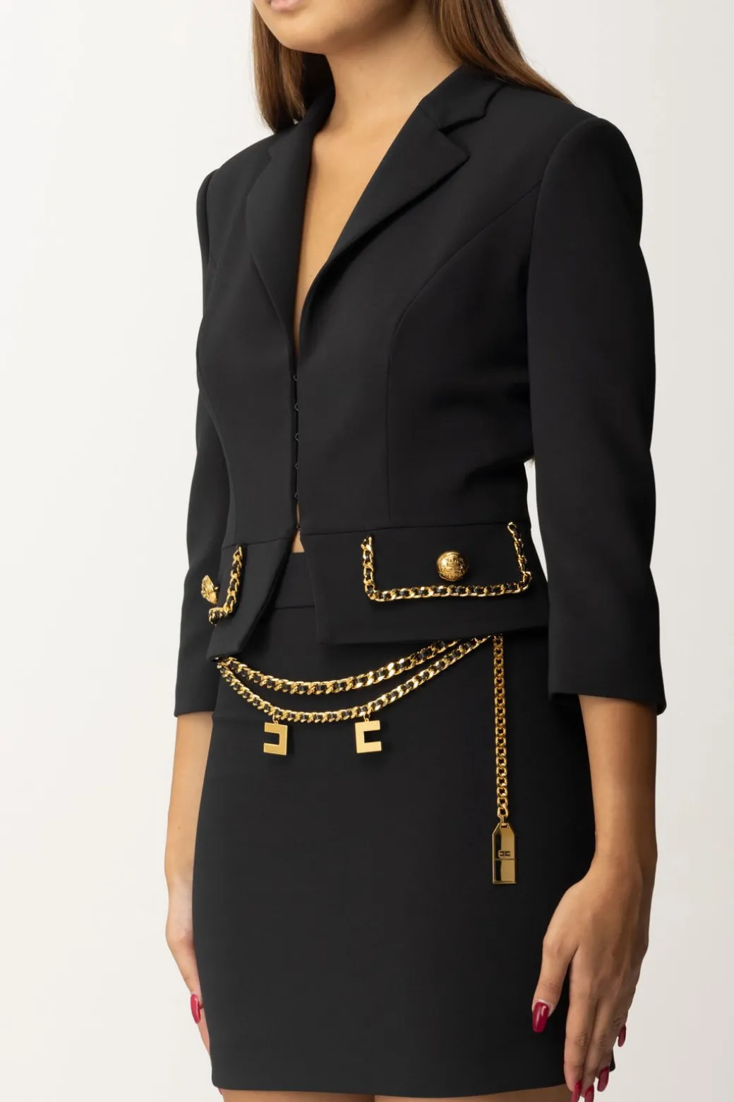 Giacca Elisabetta Franchi dall’allure sofisticato, realizzata in crêpe stretch con maniche a 3/4 e chiusura monopetto. La baschina è illuminata dettagli in catena gold con un effetto pelle che aggiunge un tocco edgy. Da abbinare a pantaloni a vita alta o jeans per look casual o eleganti.