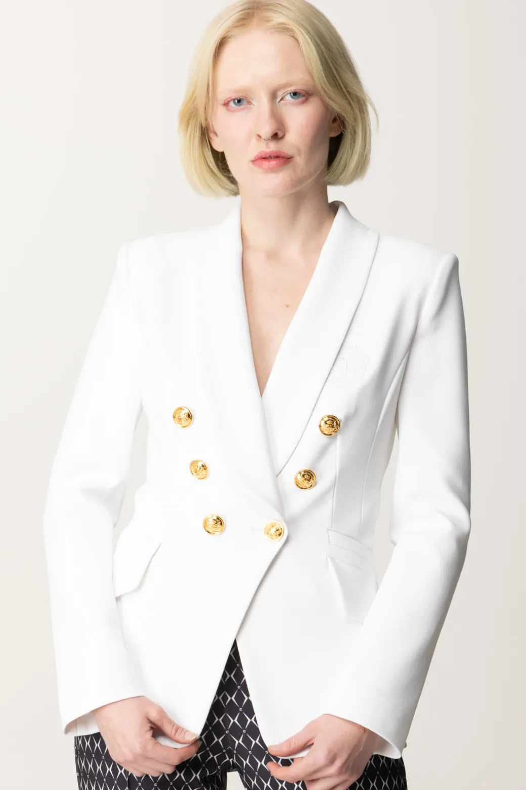 Giacca Elisabetta Franchi doppiopetto realizzata in doppio crêpe e impreziosita da bottoni gold, tasche frontali con patta e uno stemma logato ricamato su un lato. Un classico intramontabile che esprime eleganza e raffinatezza.