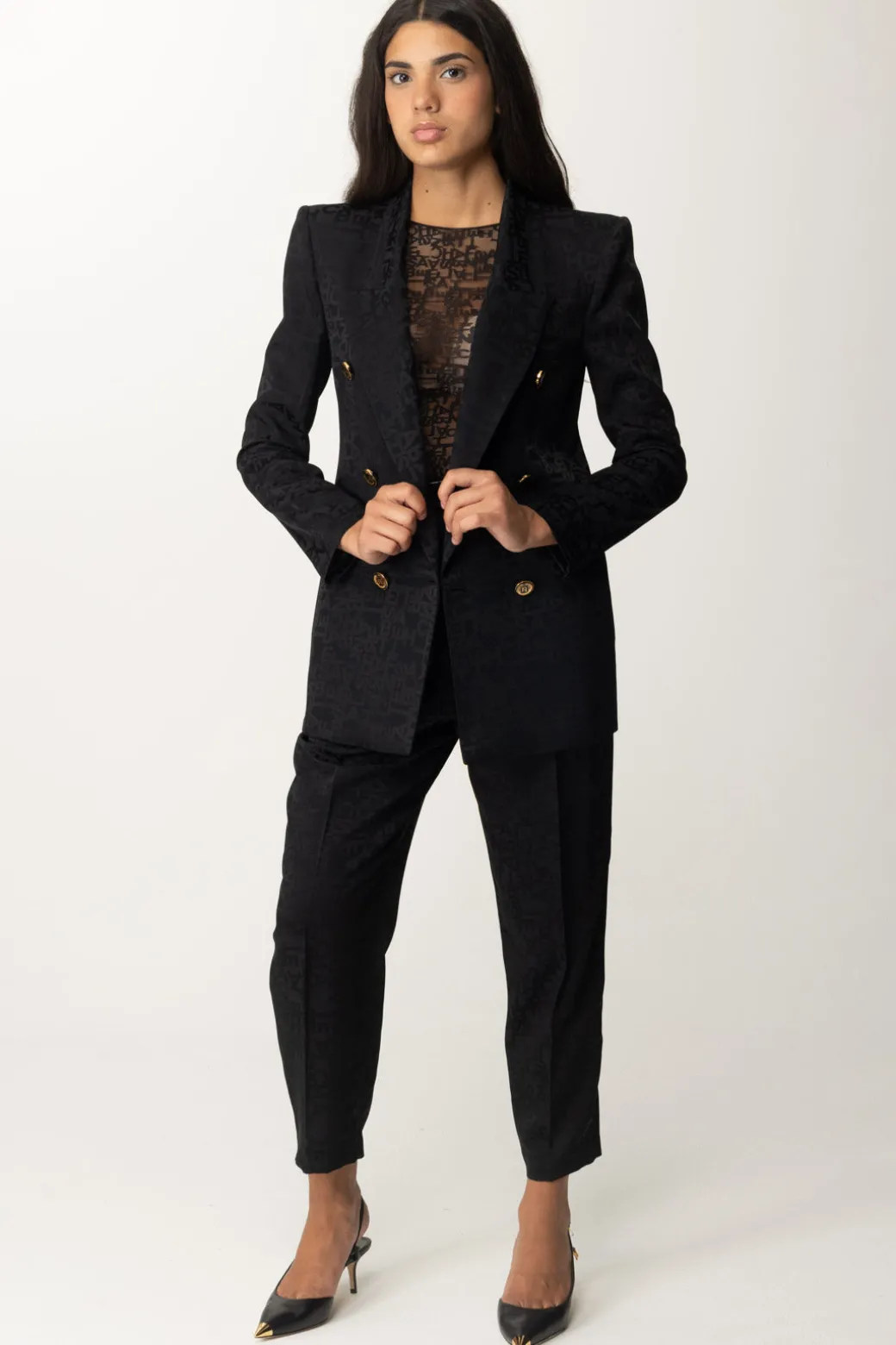 Sofisticata e strutturata: questa giacca Elisabetta Franchi dal design doppiopetto in crêpe jacquard, è impreziosits dal tessuto in lettering, revers a lancia e spalle definite. Tutti questi dettagli la rendono perfetta per un look di classe e moderno.