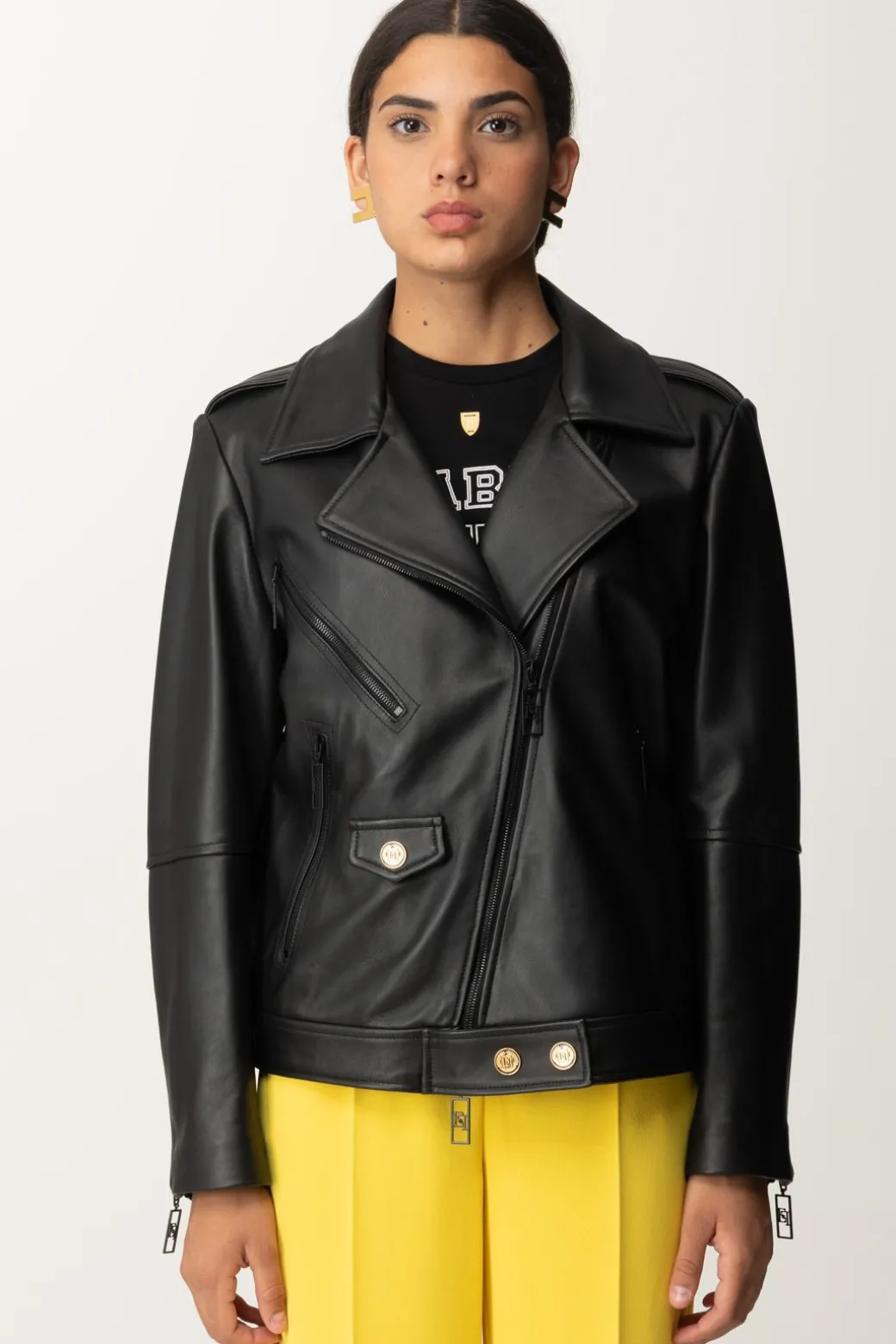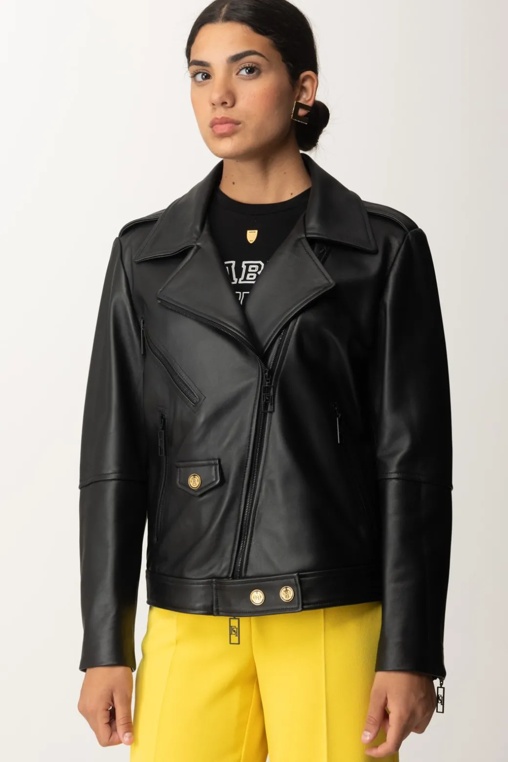 Giacca in pelle Elisabetta Franchi che sottolinea il suo aspetto vintage con l’effetto used e la vestibilità oversize, che la lascia cadere morbida sui tuoi outfit. non mancano i dettagli di stile: bottoni in metallo dorato con logo stemma in linea con la collezione e le zip ai polsini, al petto e alla chiusura obliqua.