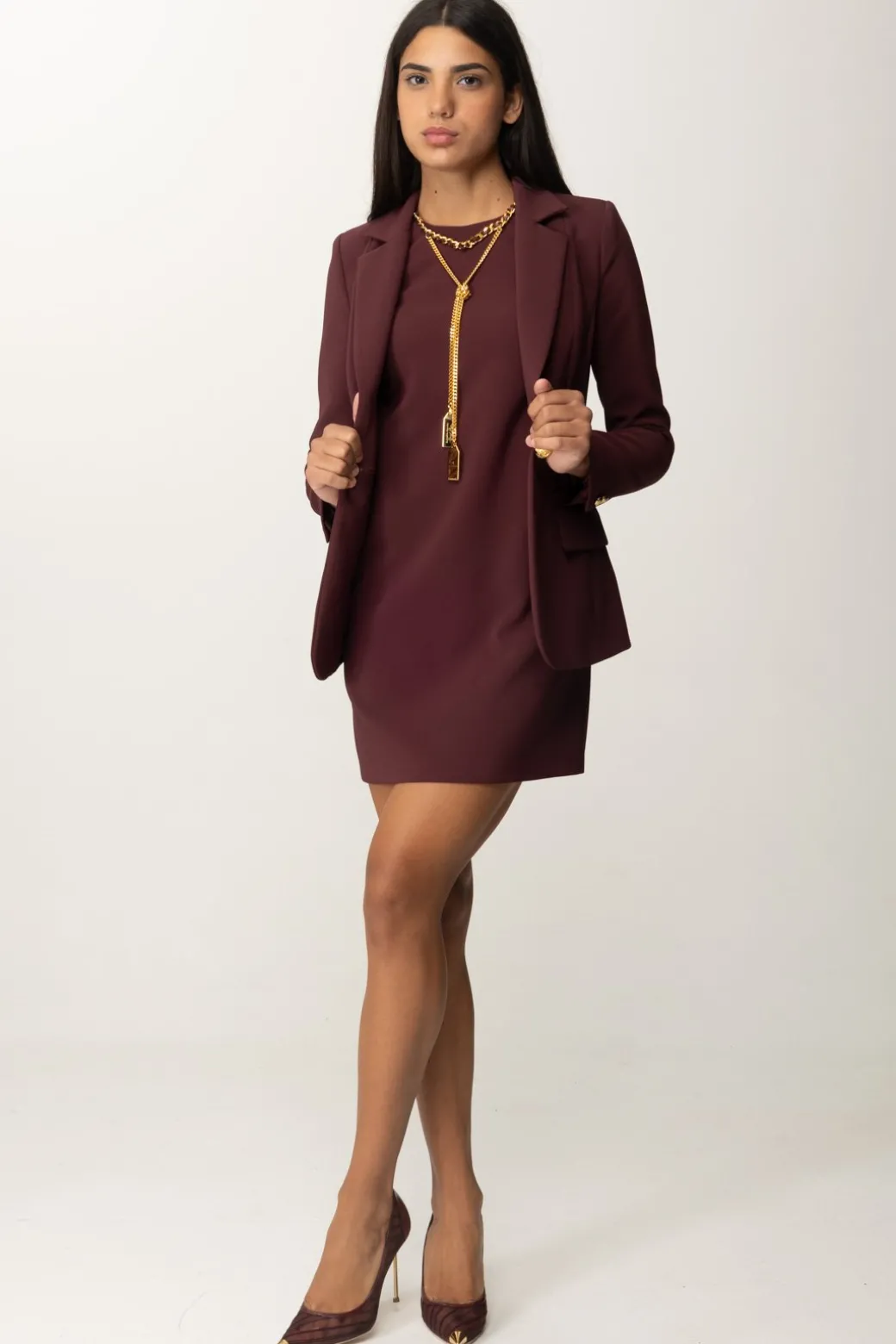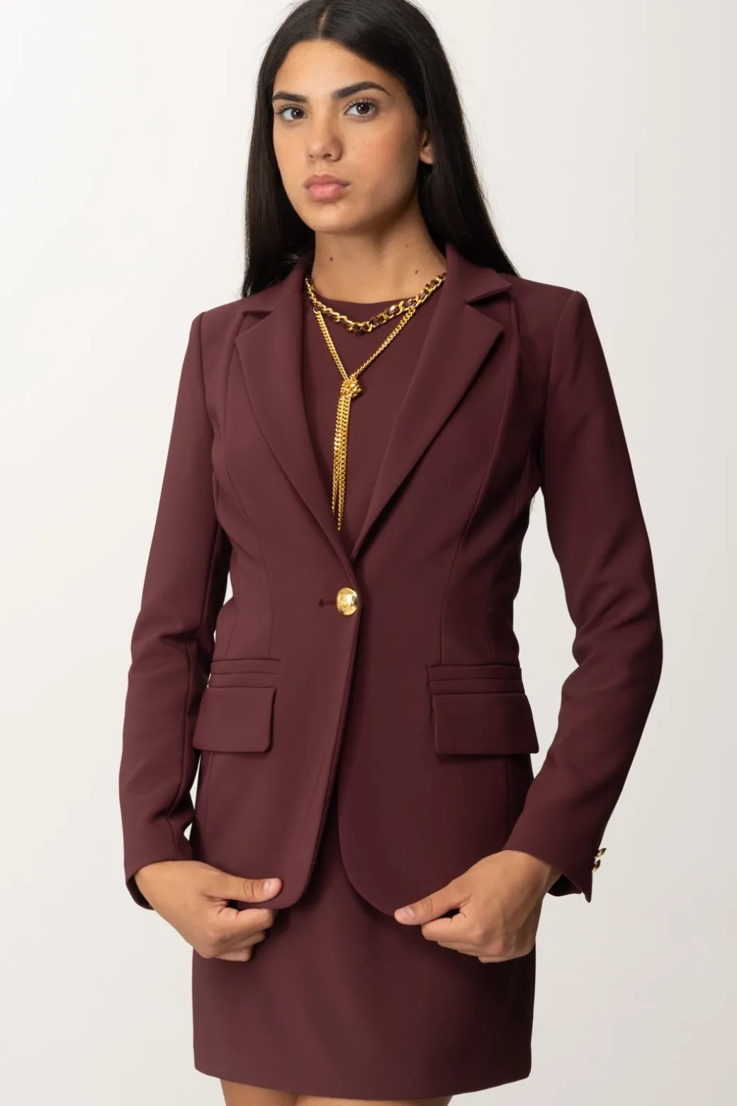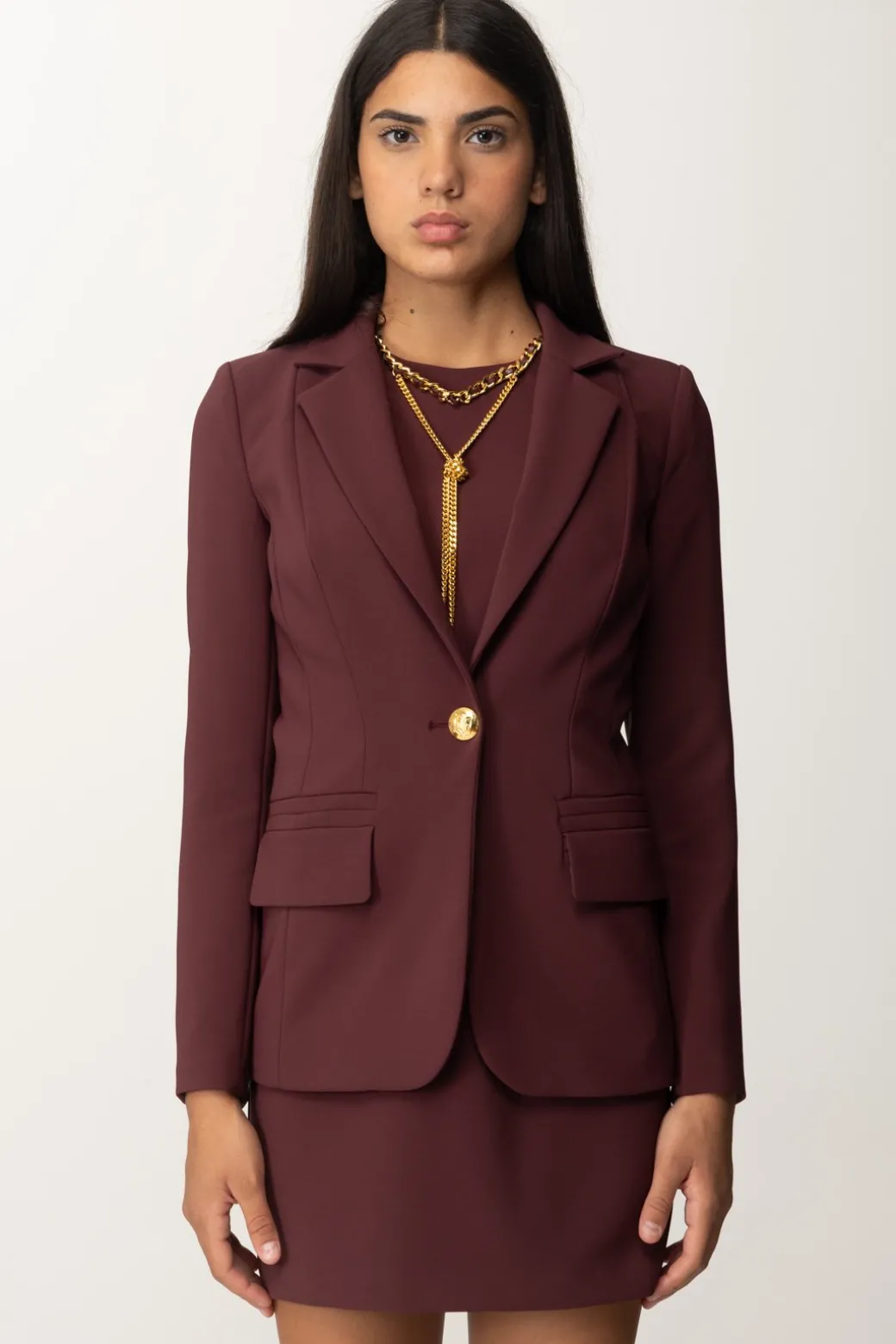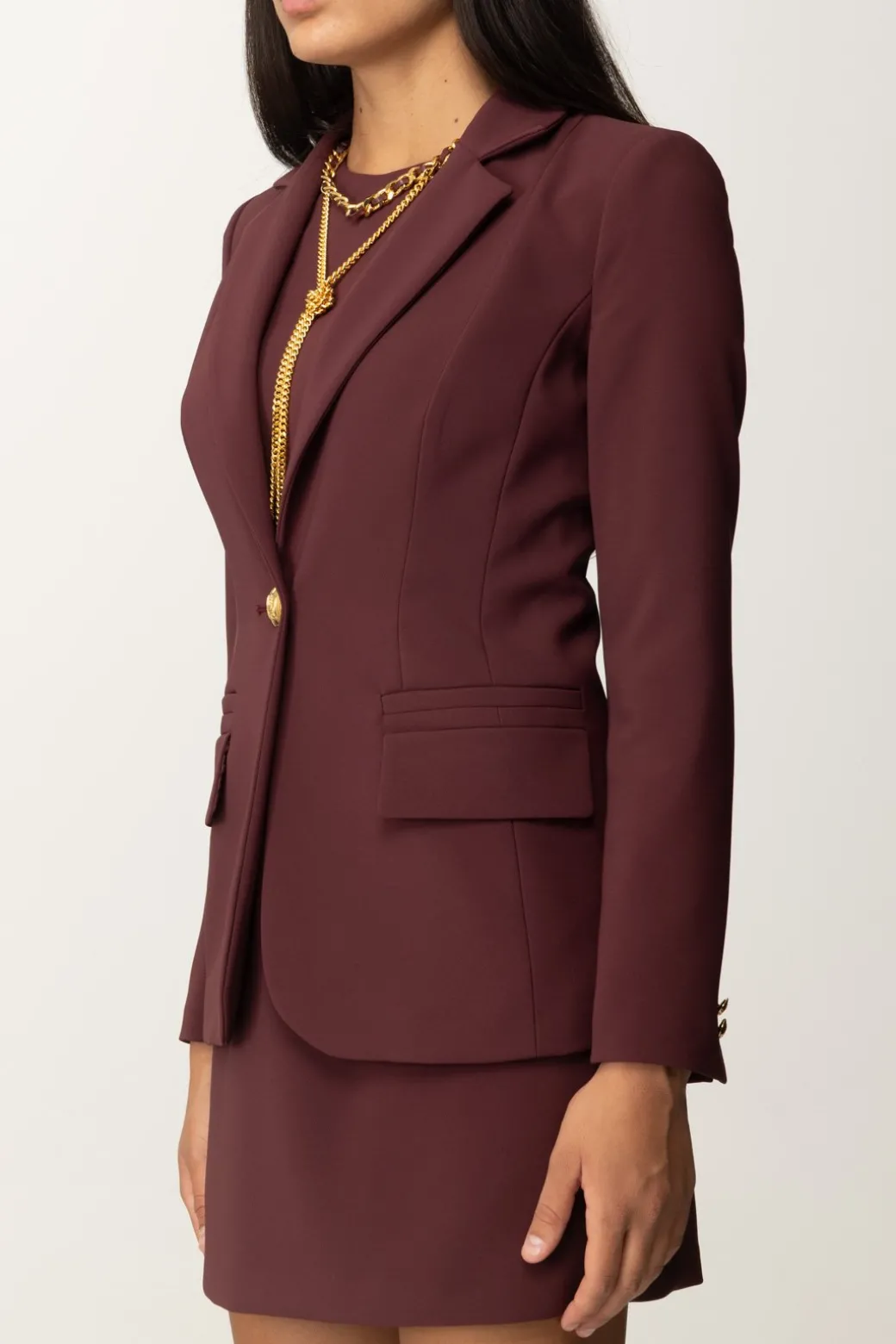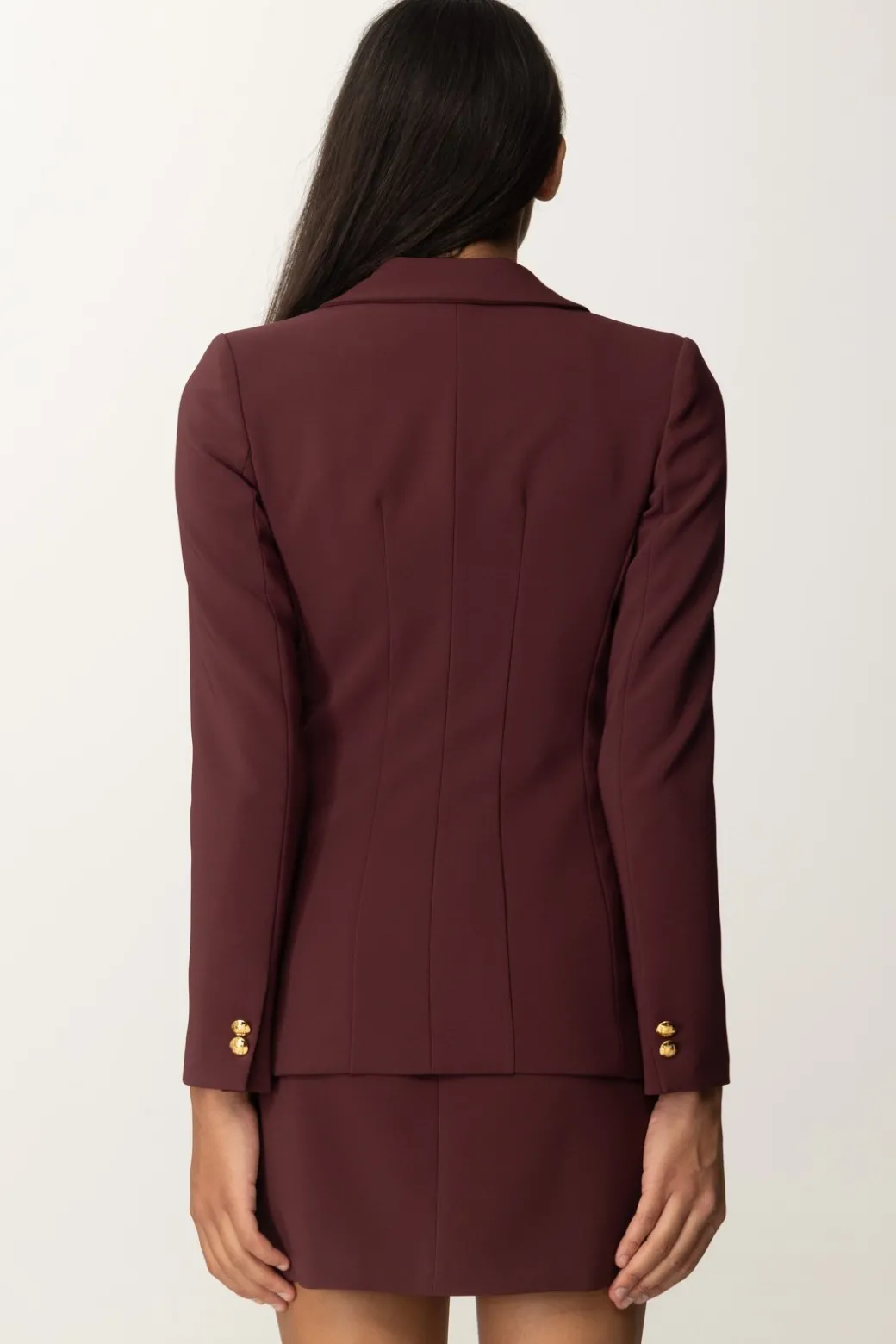 Giacca Elisabetta Franchi in crepe stretch, con cuciture che seguono le linee naturali della tua silhouette e chiusura monopetto con bottone dorato e colletto a lancia: un capo semplice e versatile, che basta per far fare level up a tutti i tuoi outfit.