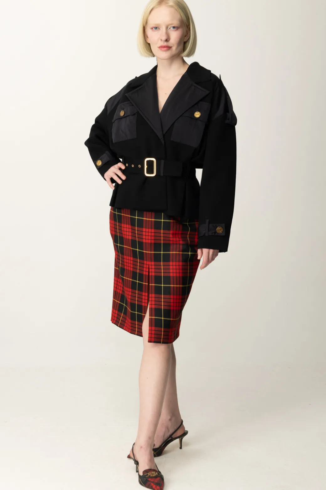 Tasche applicate in nylon, bottoni dorati con logo e cintura in vita con fibbia decorativa: un insieme di particolari concorrono al carattere distintivo di questo giubbotto Elisabetta Franchi tricot. Il design strutturato e il colletto oversize aggiungono un tocco di carattere, che completa alla perfezione il gusto aviator di questo capo.