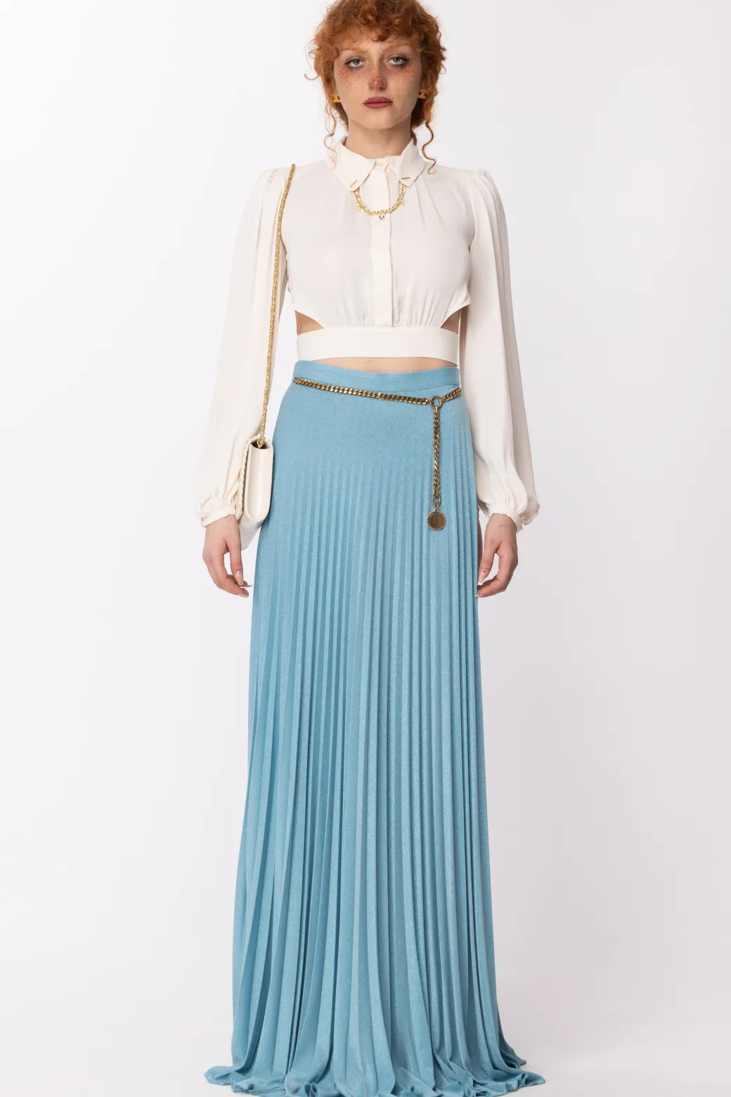 Maxi gonna Elisabetta Franchi realizzata con un tessuto in lurex dal finish lucido e dal design plissettato. In vita è impreziosita da un cinturino in catena con charm moneta e spacco laterale. Mini top o bluse eleganti completeranno il perfetto outfit d’occasione!