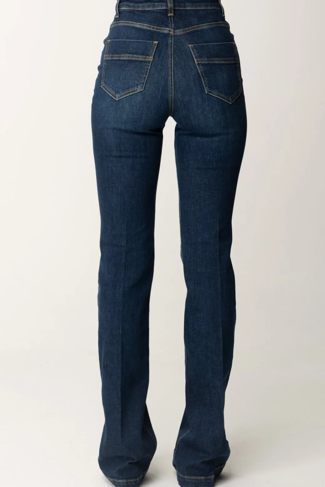 Jeans Elisabetta Franchi modello a zampa, realizzati in cotone stretch a vita regular. A renderli speciali sono i dettagli eleganti che li caratterizzano, ovvero la zio frontale in oro e le nervature centrali che delinano la figura con stile. Indossali con una blusa leggera e tacchi alti per un look boho chic.