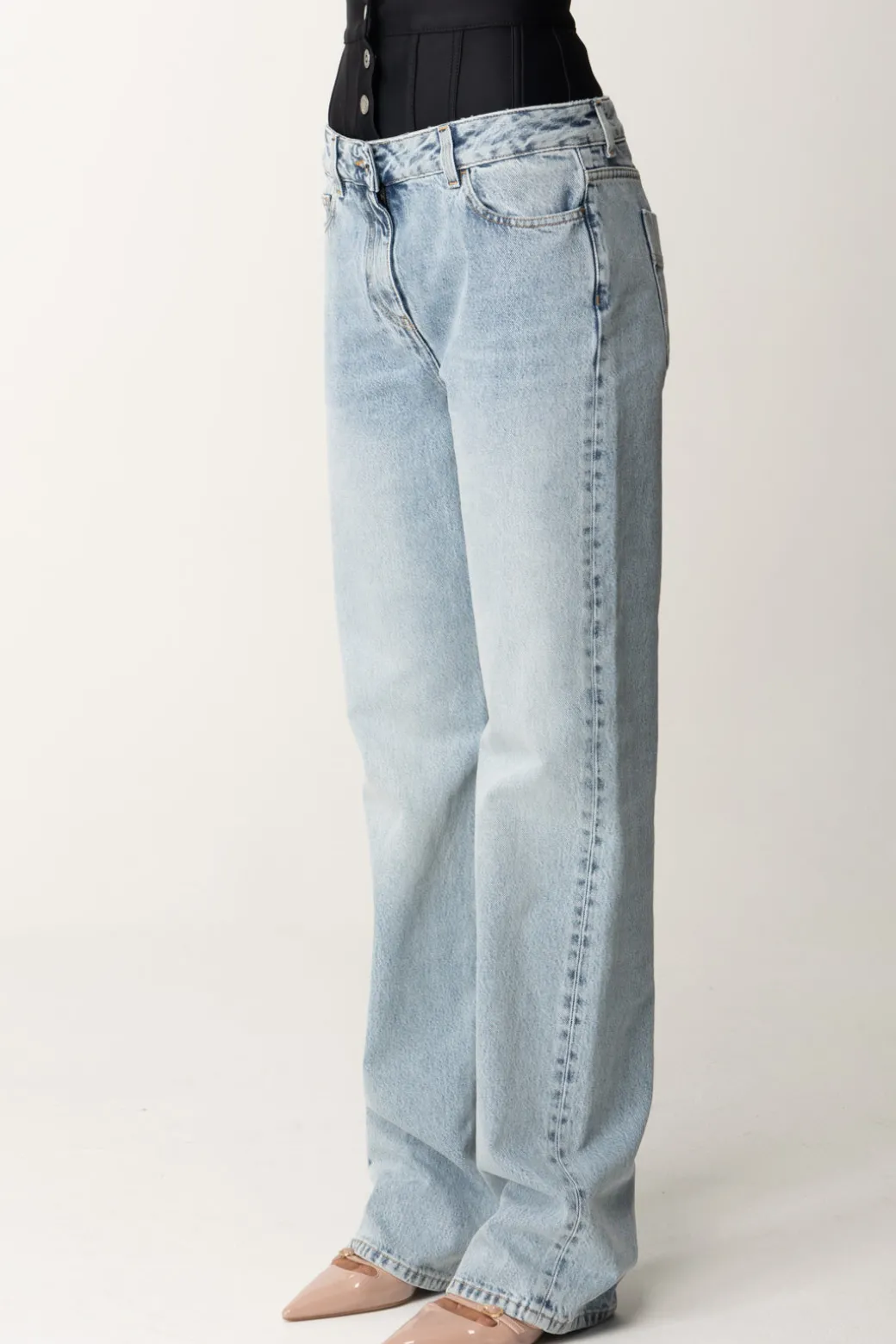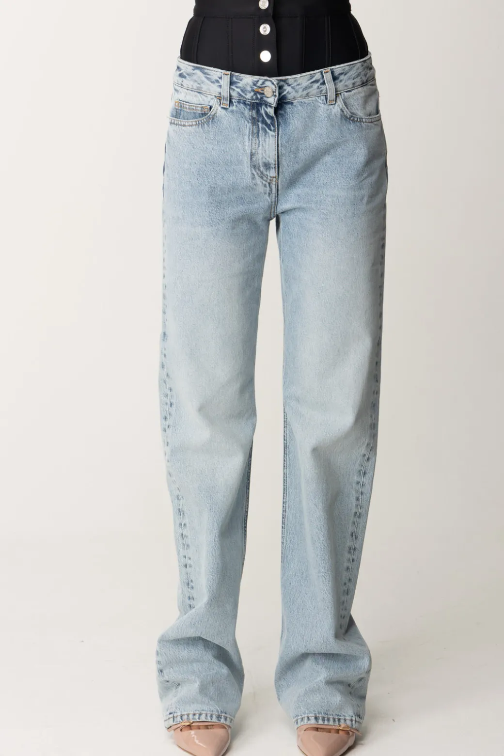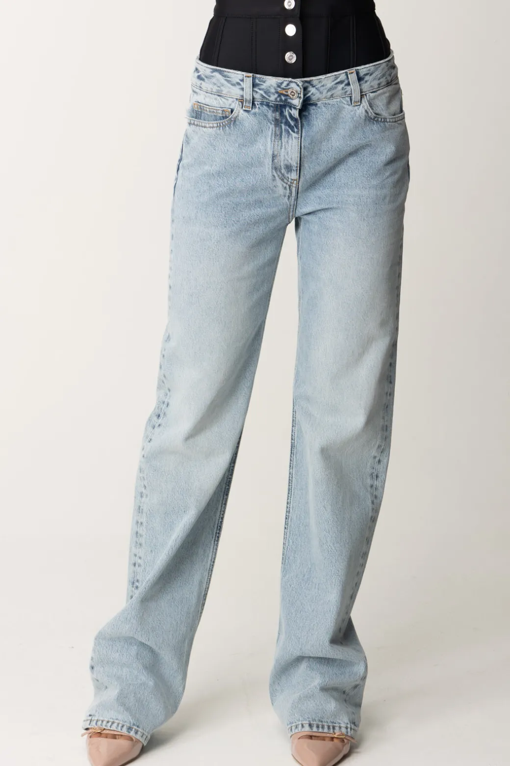 Un tocco audace per un capo evergreen: sono i Jeans Elisabetta Franchi a gamba dritta e a vita bassa, caratterizzati da corsetto in neoprene con bottoni in metallo silver che evidenziano la linea conferendo uno stile unico. Abbinali a una camicia aderente o crop top.