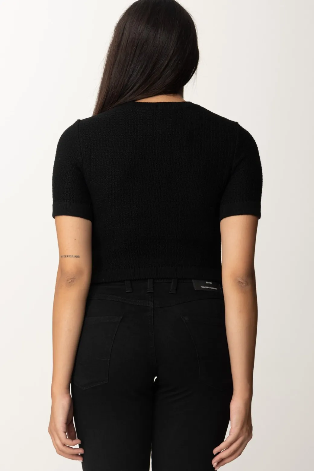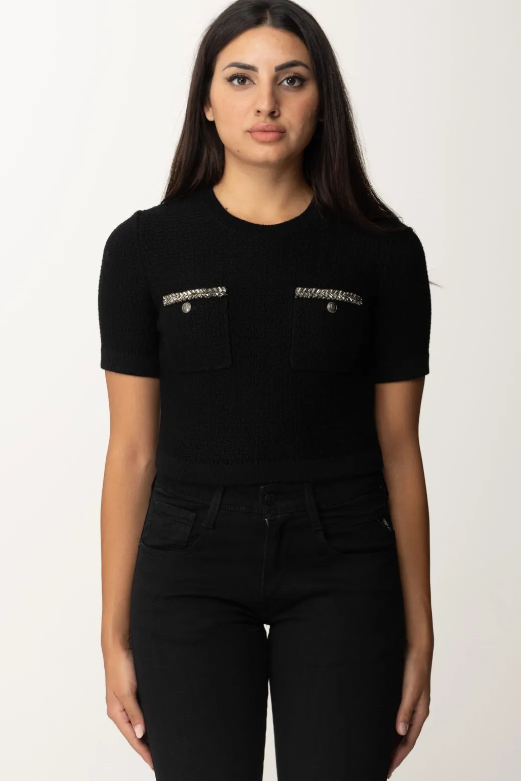 Sofisticata e femminile maglia Elisabetta Franchi a maniche corte, realizzata in morbide lana bouclé ed impreziosita dal ricamo dei taschini sul petto, corredato da bottoni in metallo argentato. Fit aderente e taglio crop, darà valore ai tuoi abbinamenti con bottom a vita alta: dal pantalone palazzo, alla gonna a tubino, ad un bel denim skinny.