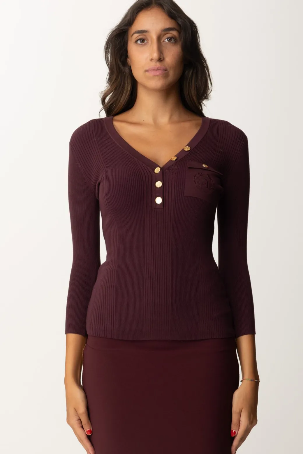 Maglia Elisabetta Franchi realizzata in viscosa e seta a costine con maniche a 3/4, scollo a V e taschina laterale impreziosita dal ricamo logo e bottone gold che richiama quelli sullo scollo. Ha un fit super slim che esalta la silhouette rendendosi elegante e raffinata. Abbinala a pantaloni a sigaretta e décolleté per un look sofisticato da ufficio.