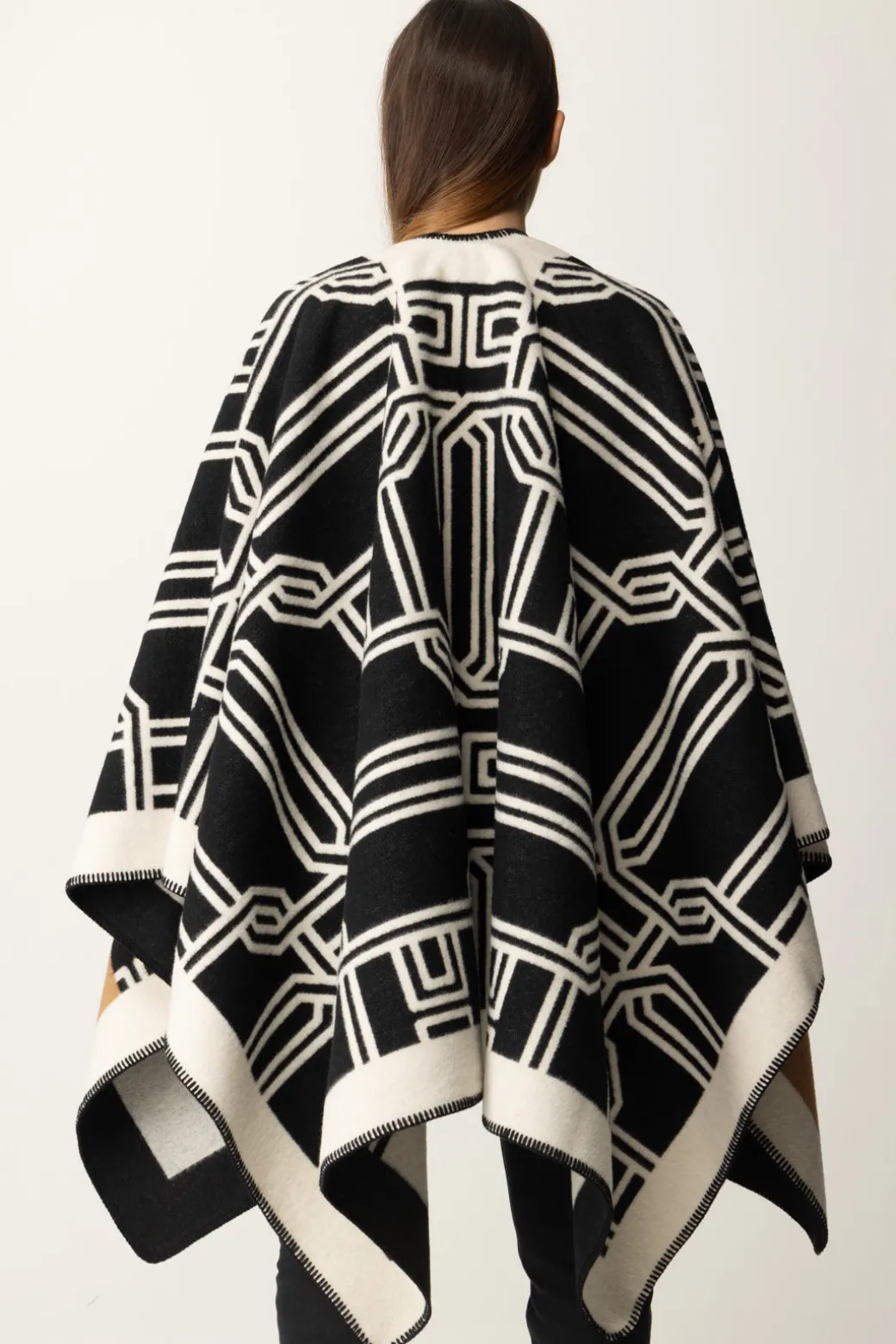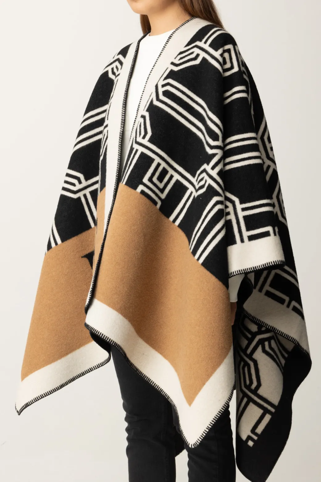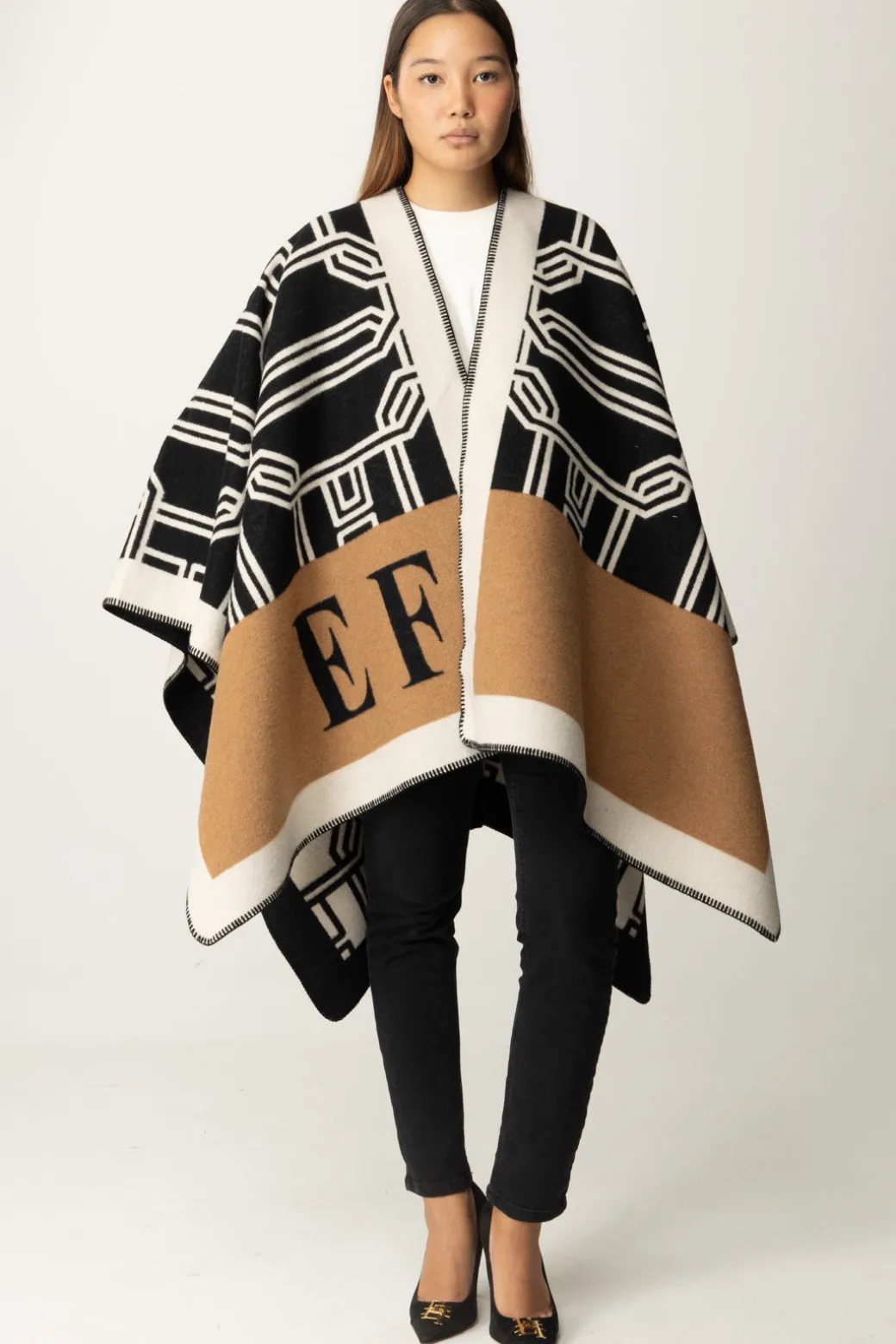 Una mantella Elisabetta Franchi che trasforma ogni outfit aggiungendo un tocco cozy-chic. Il motivo color block e macro lettering la rendono perfetta per una giornata invernale dove vuoi un look semplice ma con un fascino trendy. Indossala sopra un outfit total white per un risultato elegante e senza tempo.
