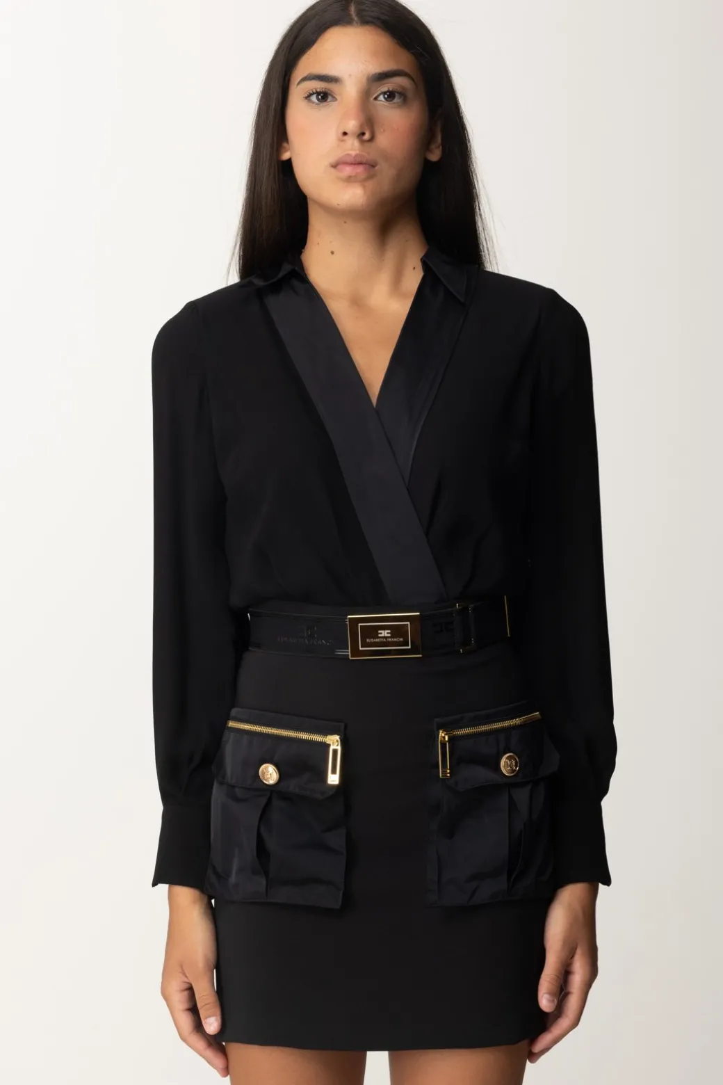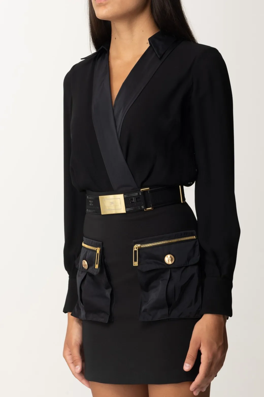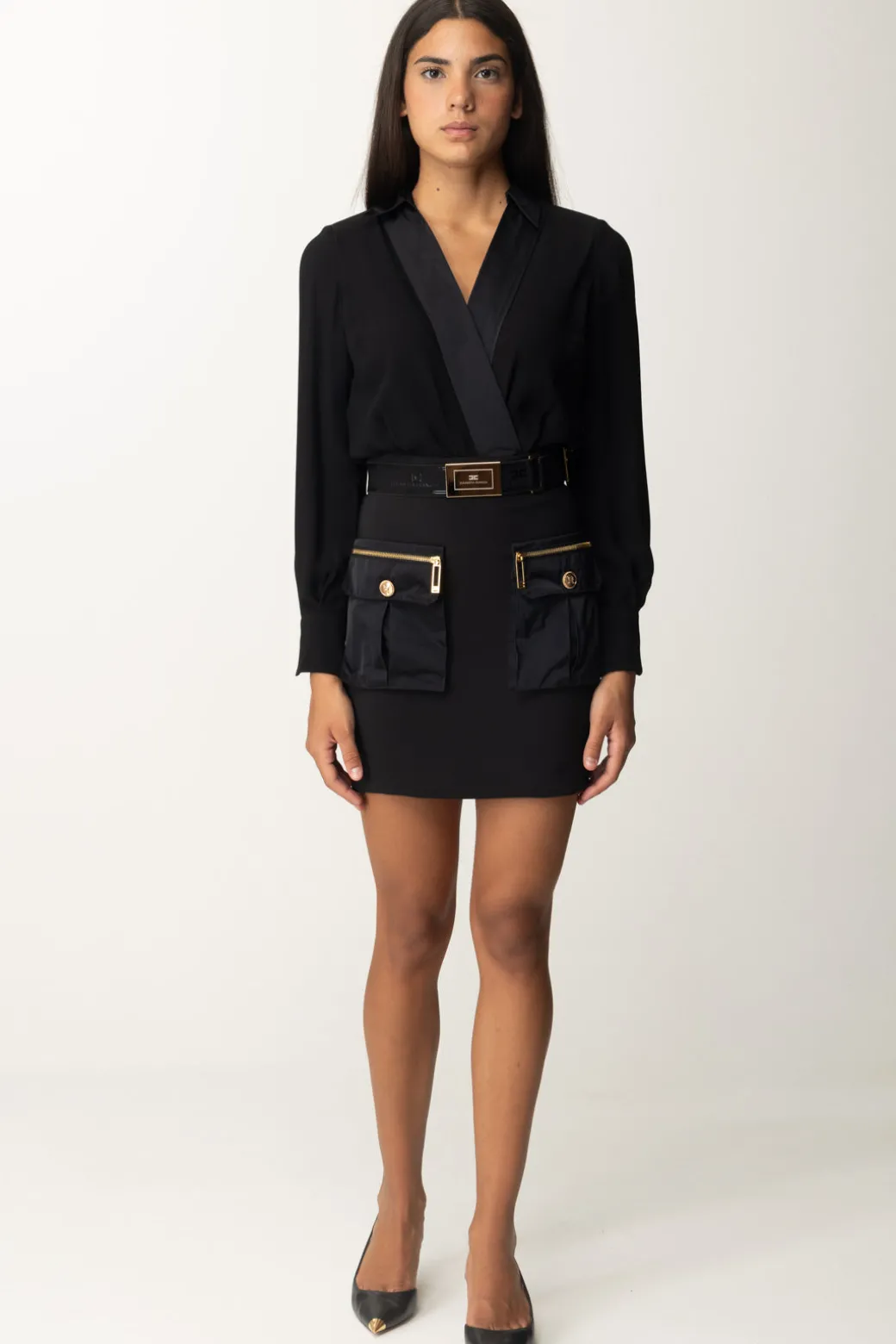Cosa ci è rimasto del trend “cargo”? Ancora perfettamente in voga, ed ecco due tasconi in nylon in stile utility a caratterizzare questo abito mini Elisabetta Franchi. Top a camicia con scollo a incrocio e cintura al punto vita con placca dorata e logata, un insieme originale e femminile, da accessoriare a piacimento per renderlo perfetto from day to night.