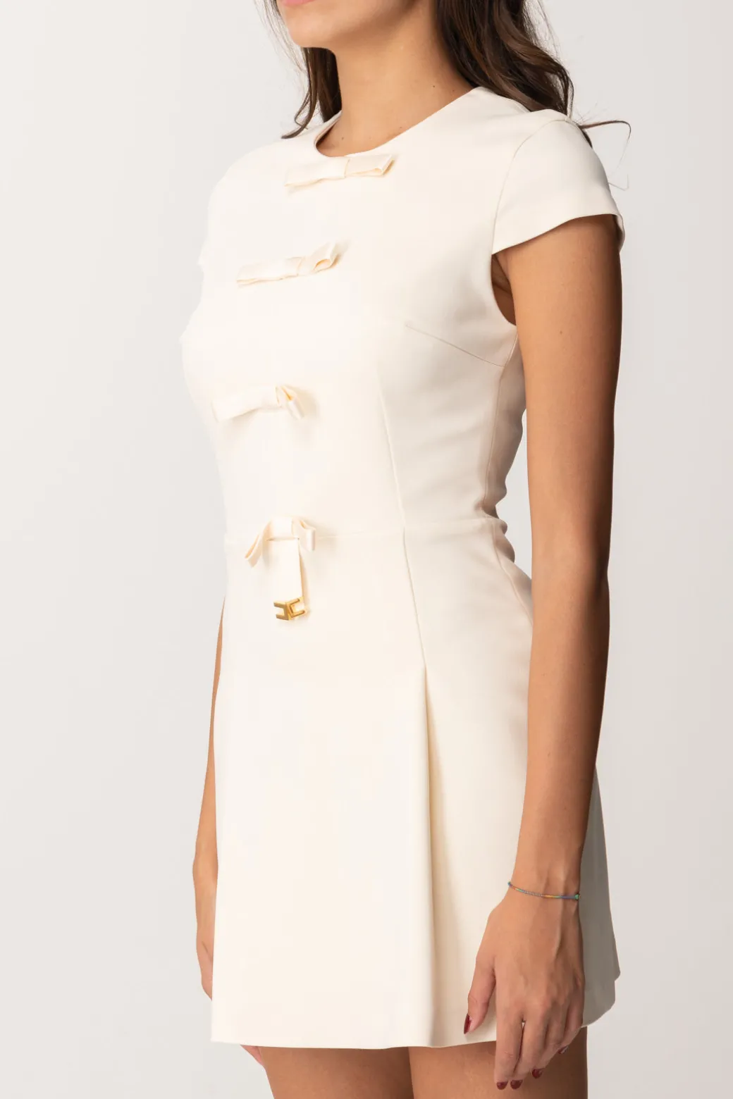 Fiocchetti in raso come piccoli appunti di stile: questo mini abito Elisabetta Franchi ne è pieno! Maniche corte e gonna a pieghe, una silhouette perfetta per una mise impeccabile, che amerai indossare per eventi di stagione sia con ballerine gioiello, che con sandali che stivali over-the-knee.