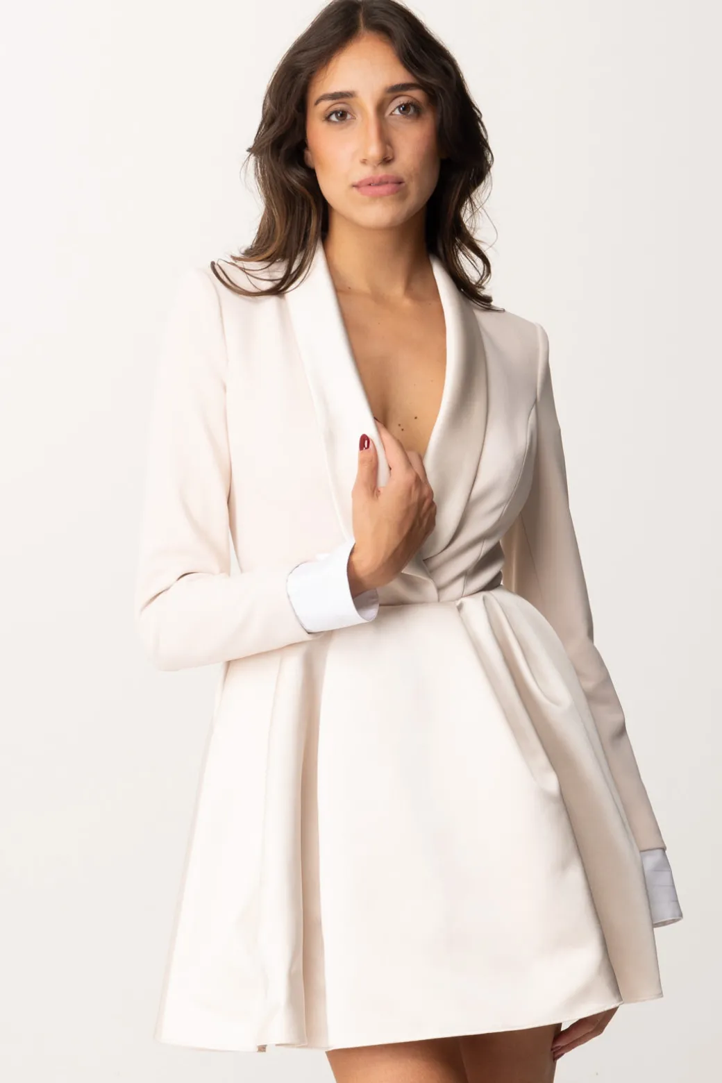 Mini abito Elisabetta Franchi assolutamente elegante e assolutamente originale: la parte alta presenta maniche a tre quarti con polsini a contrasto staccabili e revers in raso, così come in raso è la minigonna a maxi pieghe che completa la tua mise. Un vero cocktail dress, con l’augurio che tu possa indossarlo tante e tante volte!