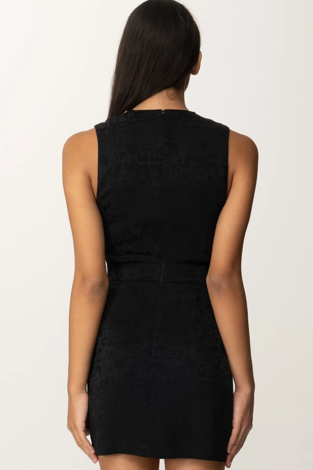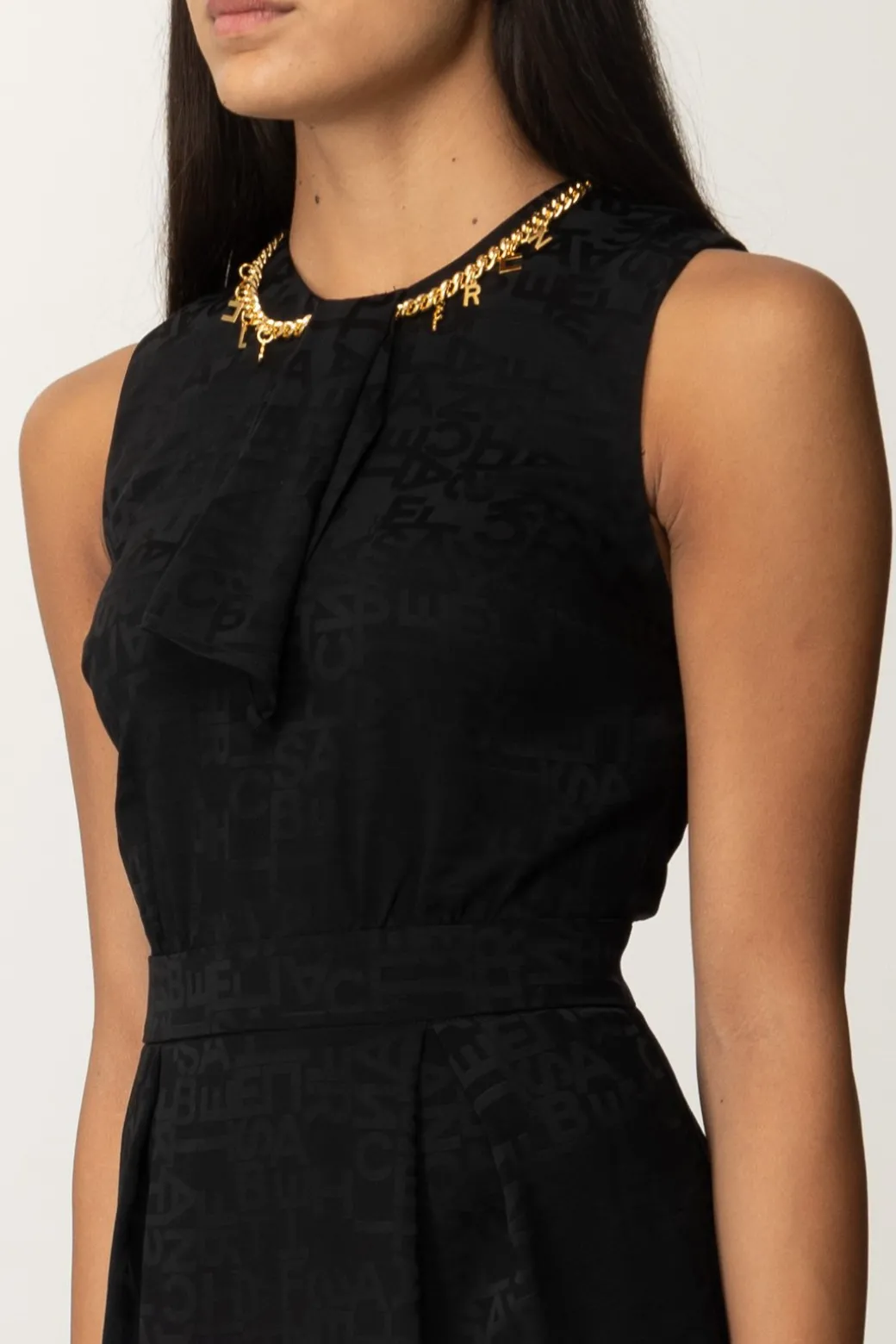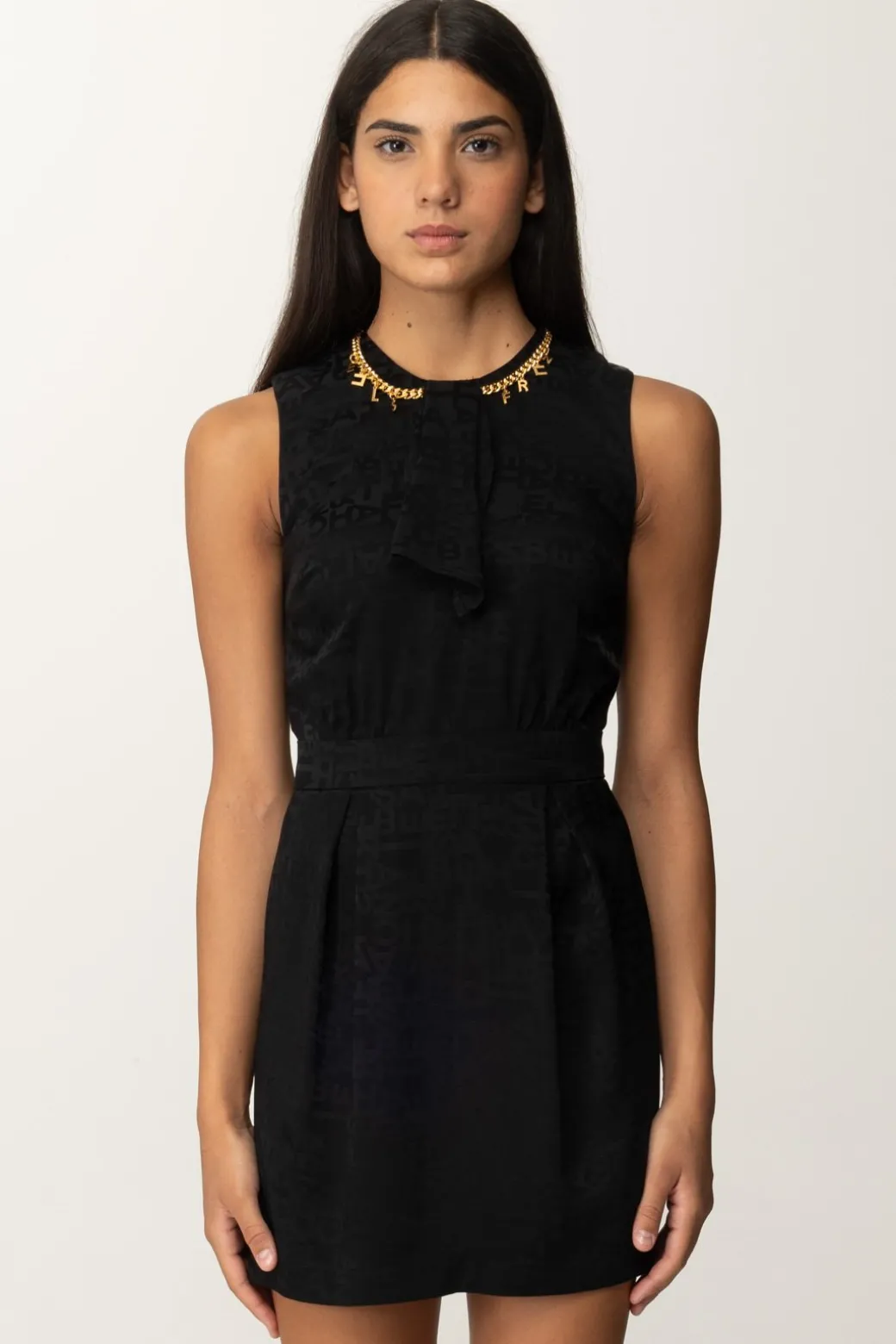 Un giro di luminosi charms applicati ad una catena gold al girocollo è il perfetto tocco finale per questo mini abito Elisabetta Franchi realizzato in crepe, con stampa logo all over. Smanicato, sagomato sul busto, si allarga ai fianchi grazie alle maxi pieghe frontali per una silhouette ricercata ed equilibrata. Glamour e sensuale con degli stivali over-the-knee, impeccabilmente elegante con sandali e decolletes.