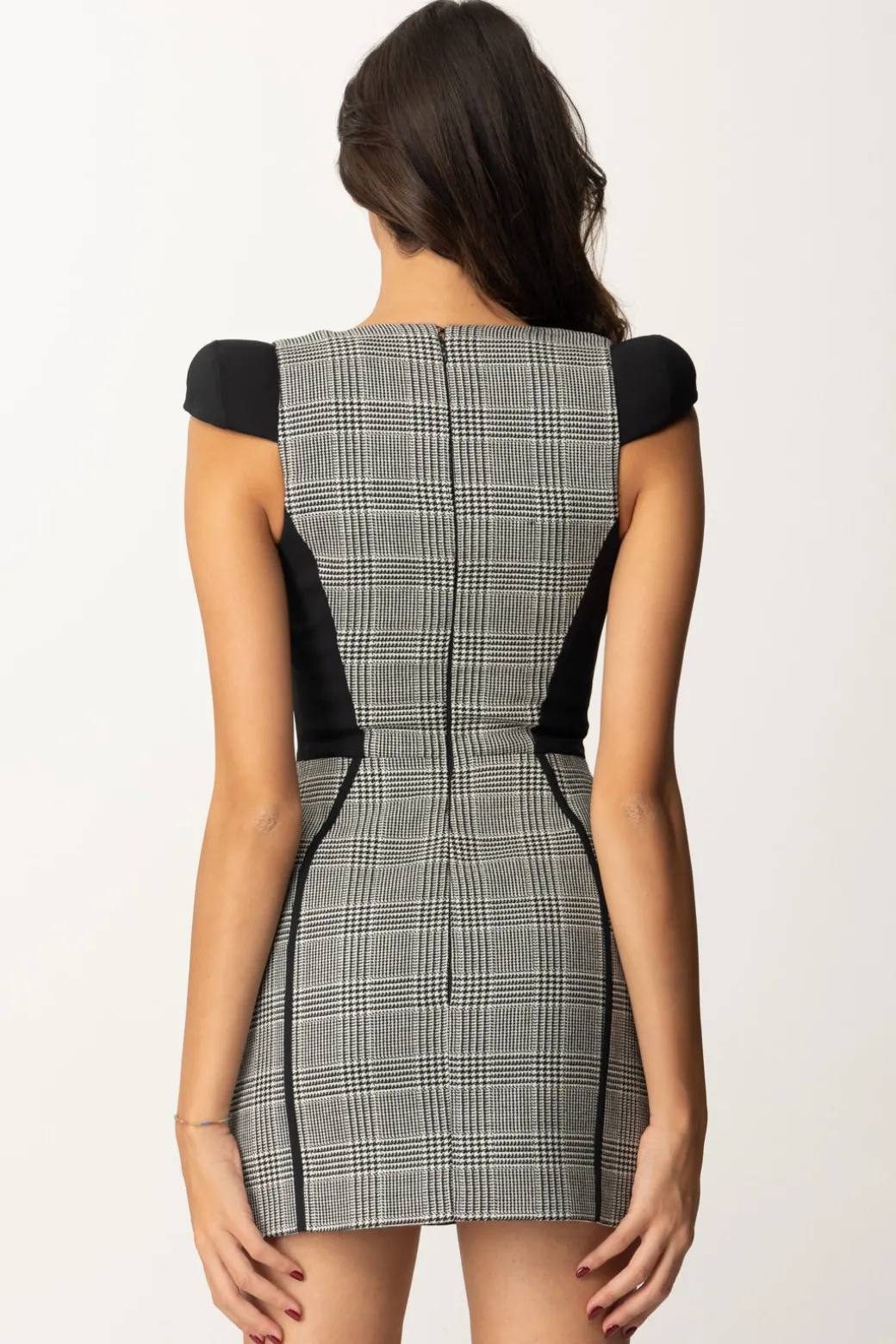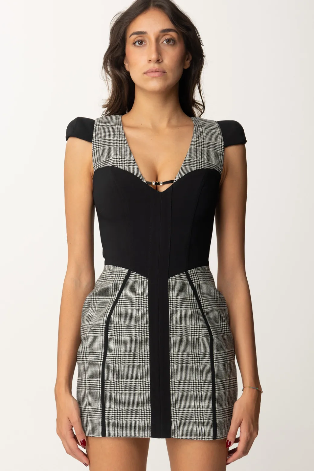 Questo Miniabito Elisabetta Franchi realizzato in fresco lana principe di Galles, presenta un top bustier dallo scollo a cuore, spalline tonde e minigonna slim. Il contrasto dato dai dettagli neri strutturati crea una silhouette accattivante e chic e lo rende perfetto per una serata o un evento formale. Il mix tra eleganza e modernità che cercavi.