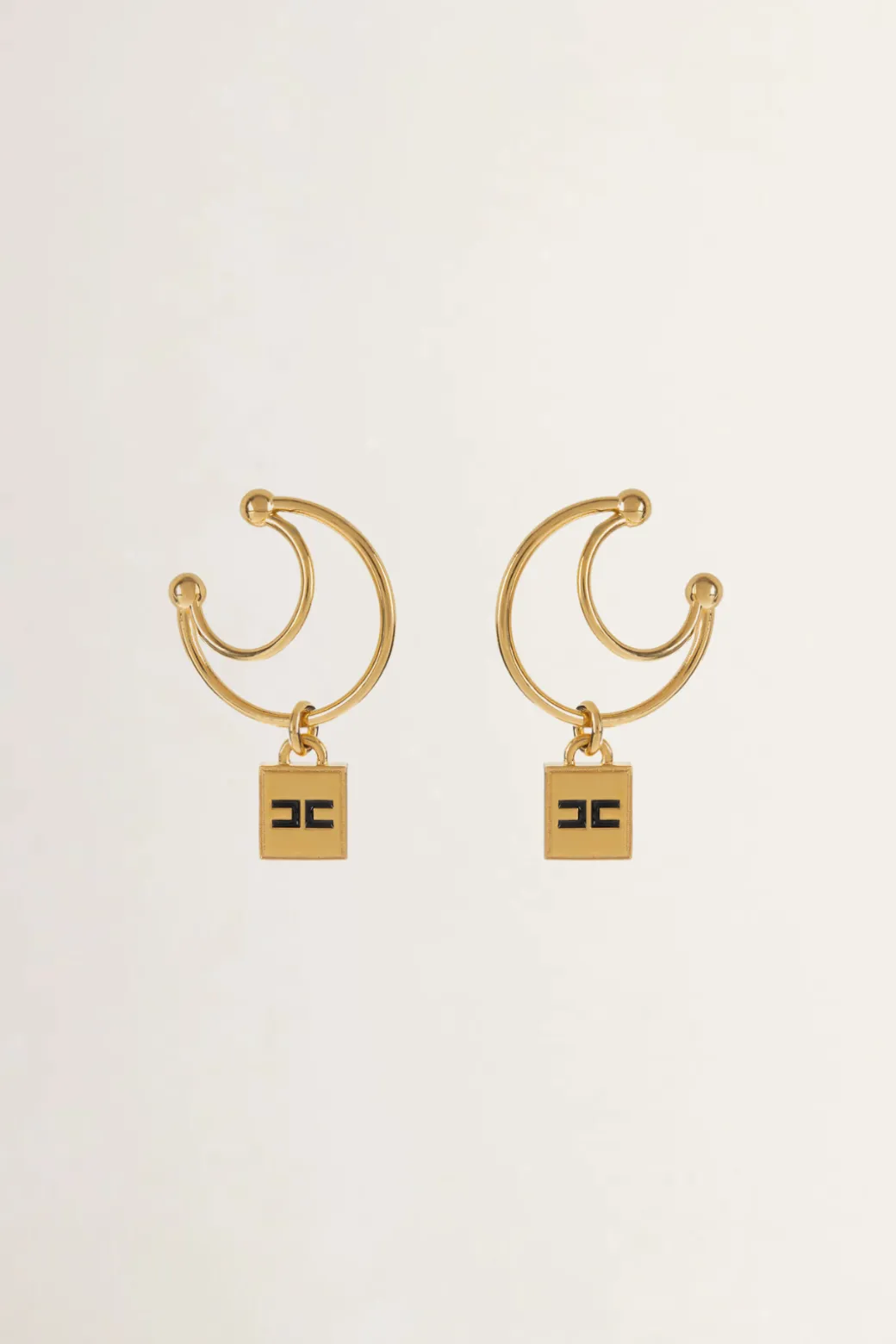 Orecchini Elisabetta Franchi modello earcuff, realizzati in metallo gold e caratterizzati da un design con doppia anella e charms logato smaltato. Minimal ma estremamente chic.
