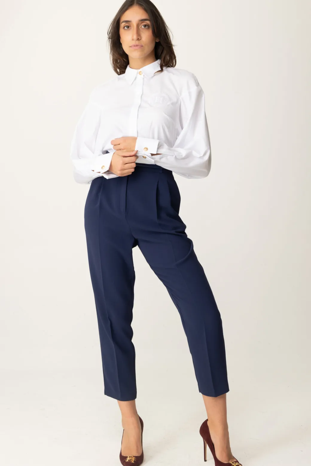 Li puoi indossare con tacchetto e camicetta, li puoi sdrammatizzare con t-shirt e ballerine: questi pantaloni alla caviglia Elisabetta Franchi sono sofisticati e versatili insieme, perfetti per colmare i tuoi dubbi davanti all’armadio. E cos’altro c’è in più? Un cinturino con logo EF formato scudetto e tasca ricamata sul retro.