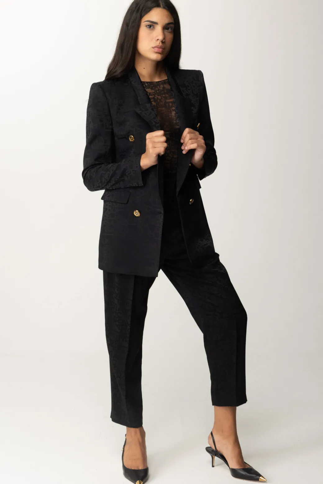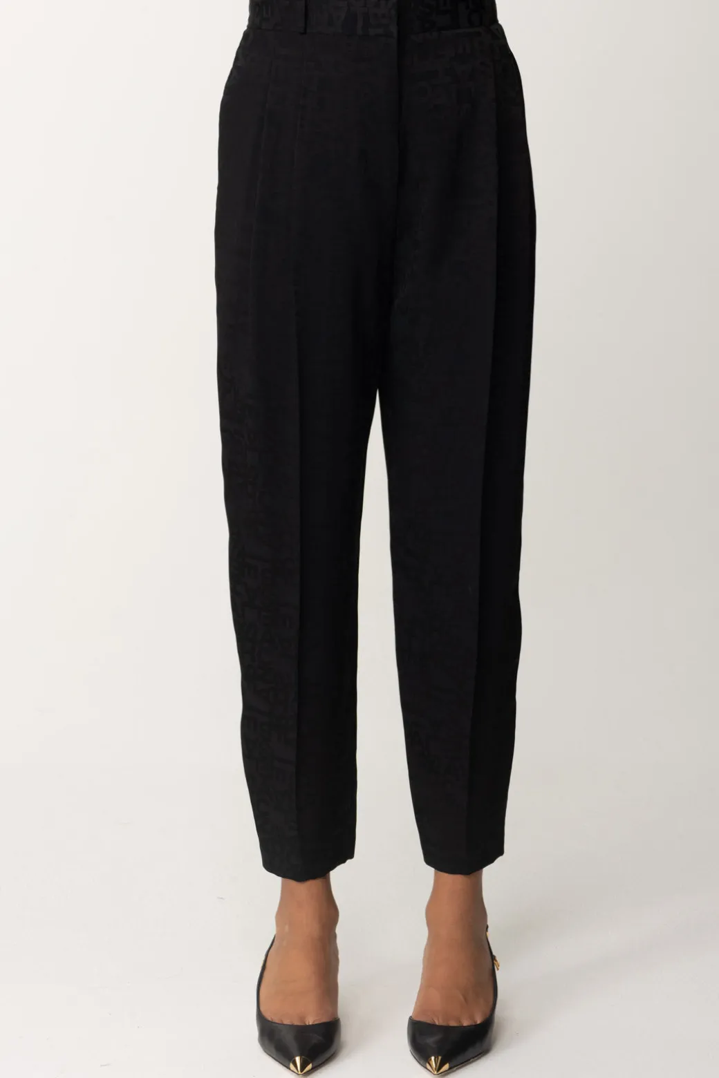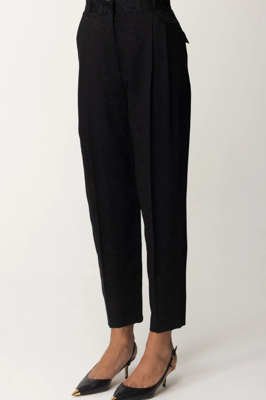 Eleganza urbana caratterizza questi pantaloni Elisabetta Franchi dal taglio dritto e realizzati in crêpe jacquard con una stampa lettering. Il fascione in vita e le doppie pinces anteriori donano una silhouette raffinata.