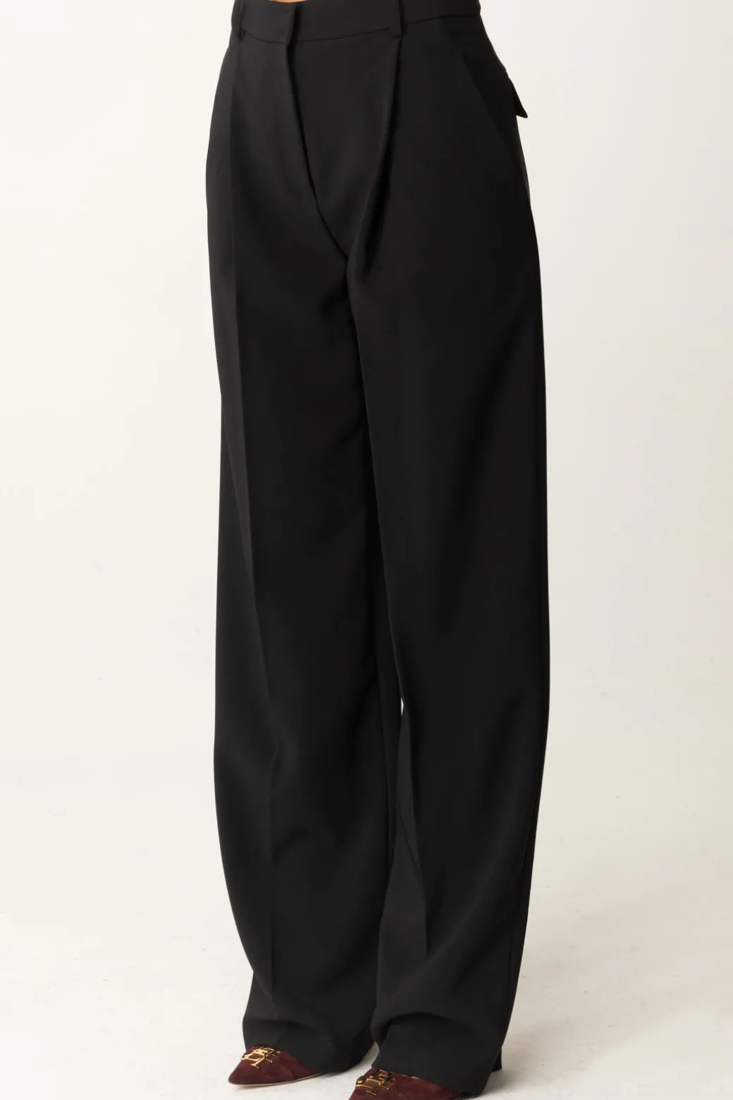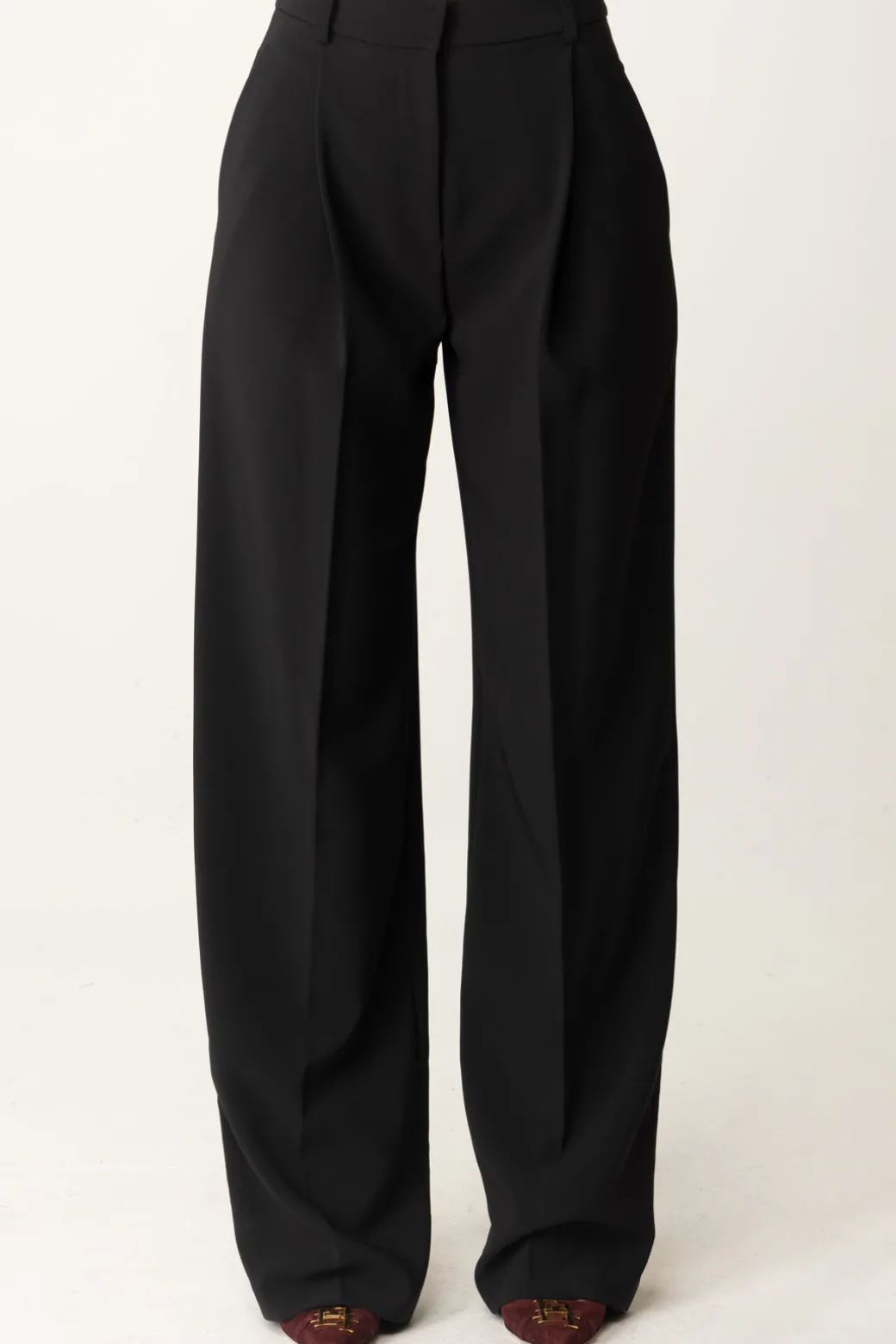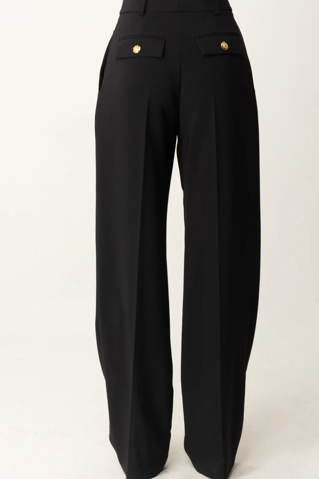 Gamba ampia e comoda con pinces in vita e silhouette impeccabile per questi pantaloni Elisabetta Franchi, perfetti per i tuoi outfit sia business che formal chic. Indossali con una maglia aderente e corta, un body o una camicia, avendo cura di lasciare il punto vita in vista all’occorrenza aggiungendo il tuo tocco di stile personale con una cintura per sottolineare ancora di più la bodyshape. Tasche sul retro con bottoni logati in oro.