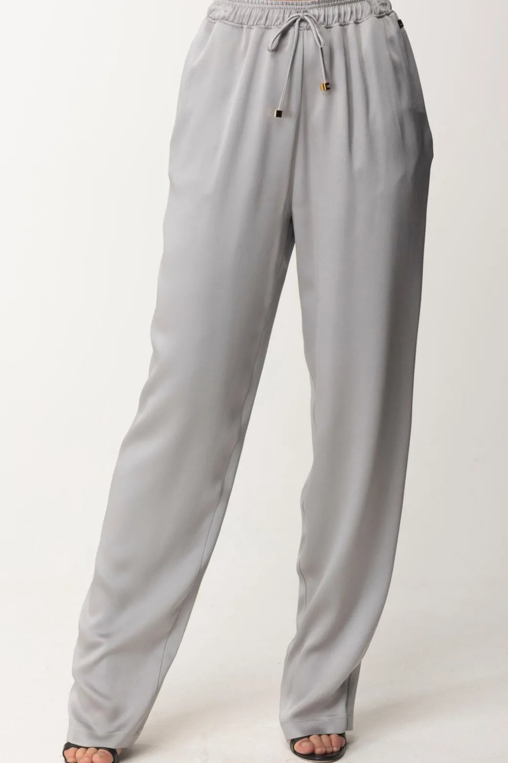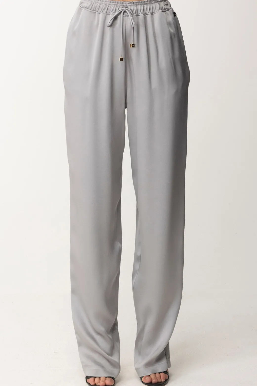 Questi eleganti pantaloni jogger di Elisabetta Franchi sono l’epitome della comodità chic. Realizzati in morbido crêpe, vantano una silhouette rilassata in raso che li rende perfetti sia per un look da ufficio che per un aperitivo serale. Il design pulito è arricchito da dettagli raffinati, come l’elastico in vita che assicura una vestibilità impeccabile e un piccolo charm dorato che aggiunge un tocco di lusso discreto.