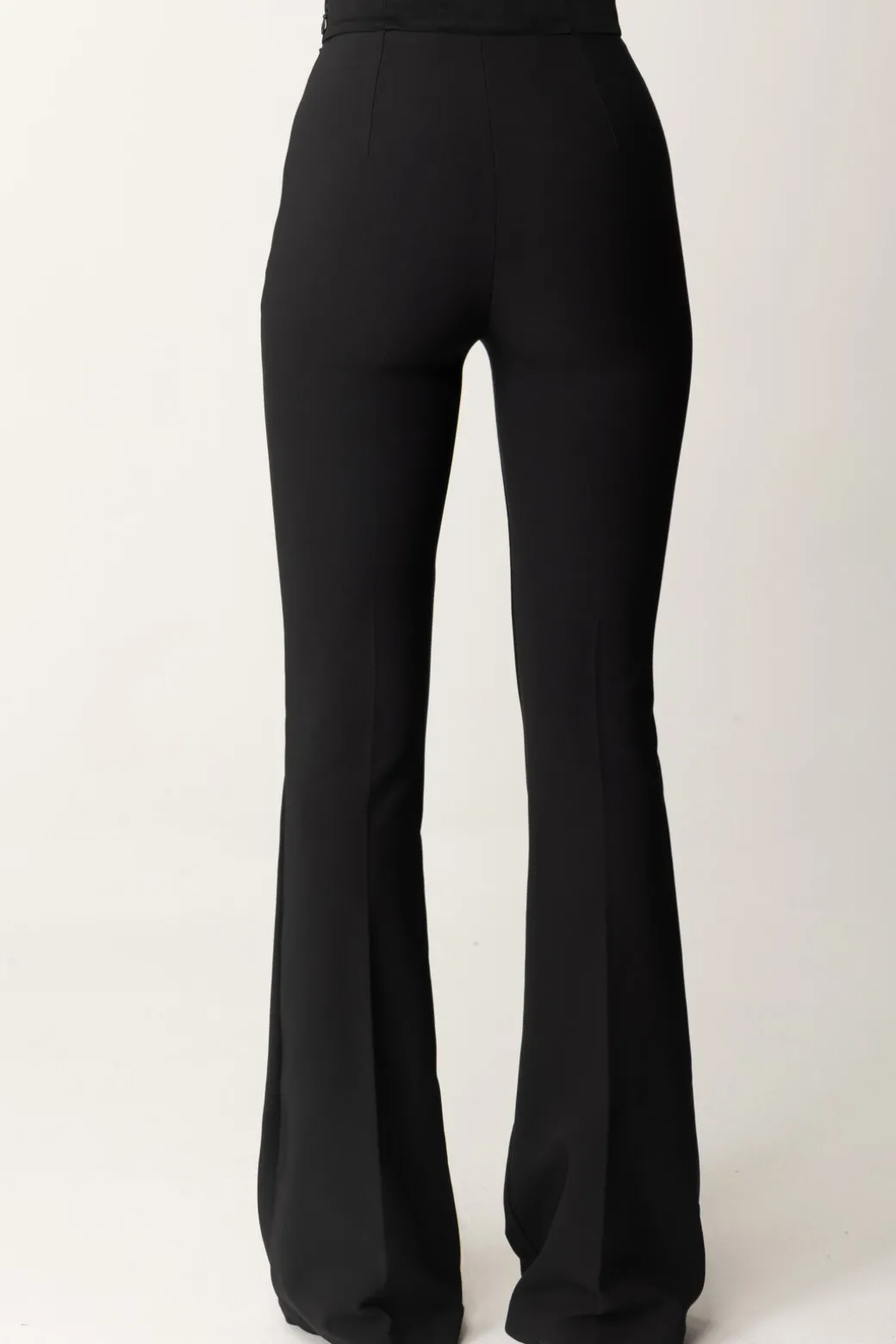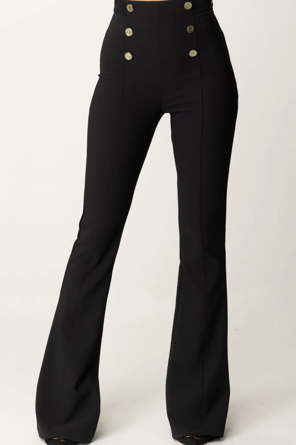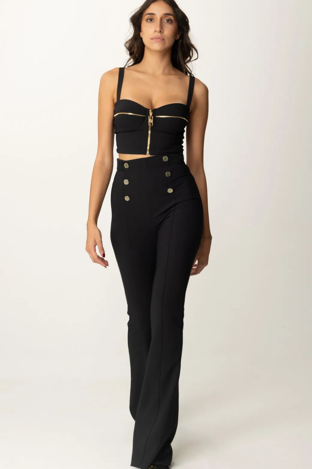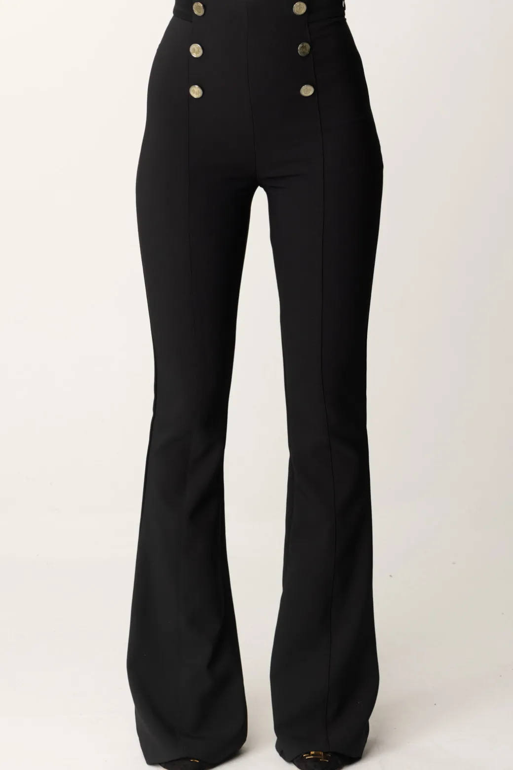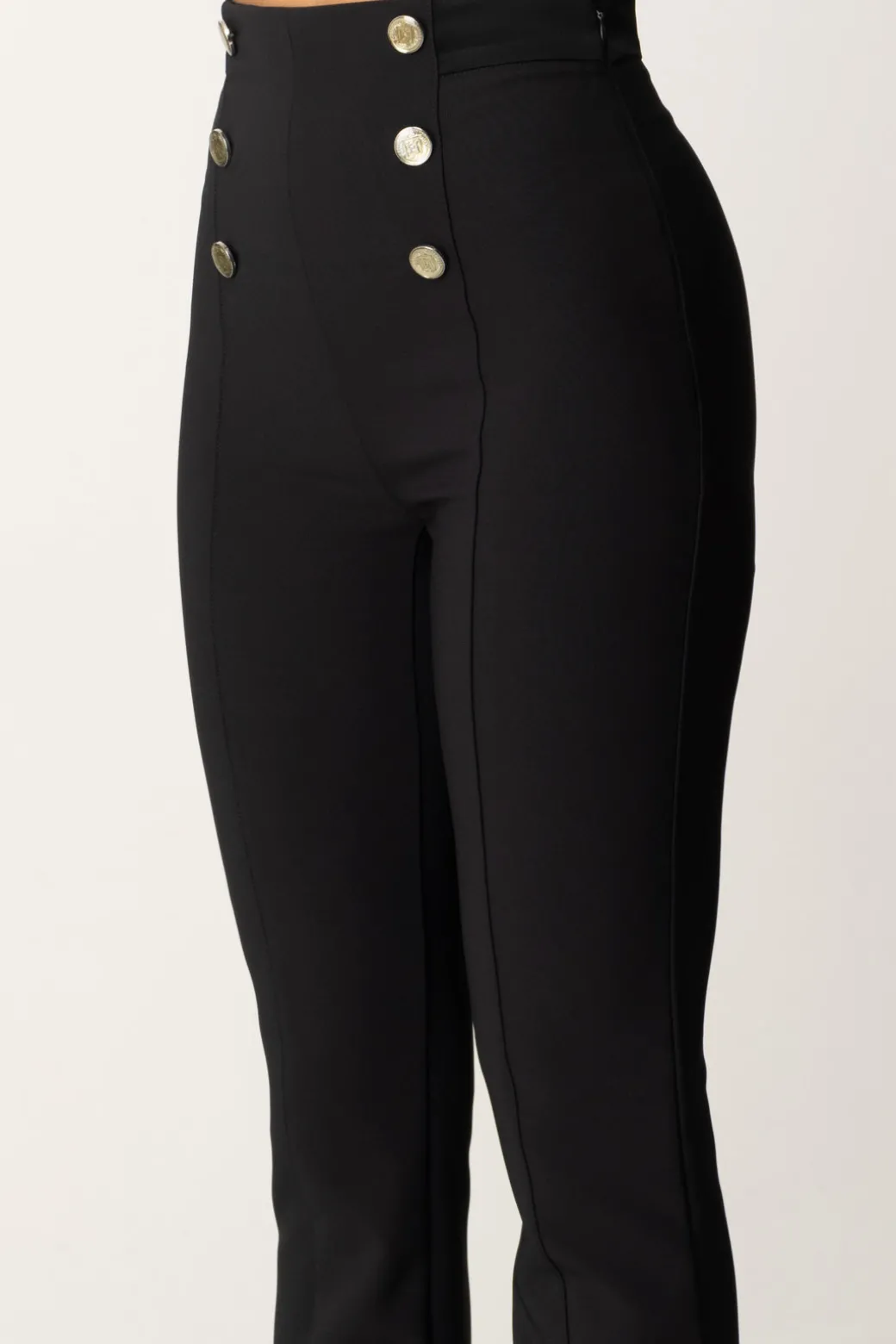 Pantaloni Elisabetta Franchi a vita alta ispirati allo stile nautico, con dettagli di bottoni decorativi sulla fascia in vita. Il taglio aderente e leggermente svasato verso il fondo conferisce una silhouette slanciata e femminile. Sono perfetti per un look da ufficio o un evento formale, ma possono essere facilmente resi più casual con t-shirt minimal e accessori appropriati.