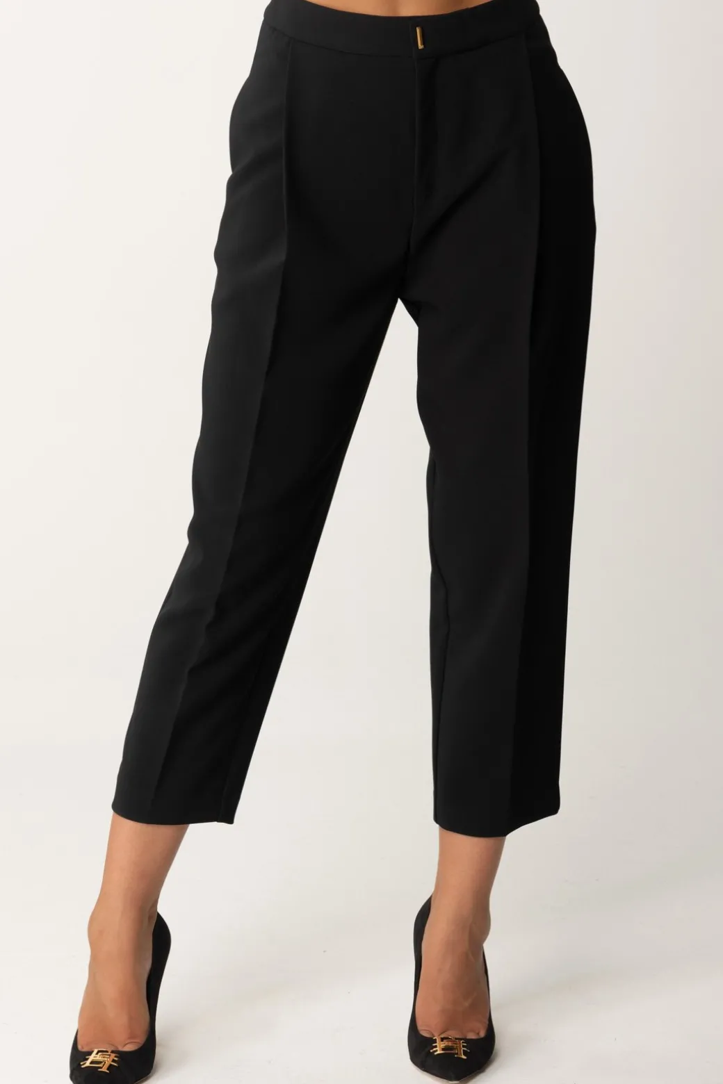 Pantaloni Elisabetta Franchi che rendono super attuale la loro eleganza connaturata, realizzati in crepe stretch con pinces frontali e stiro piega. A renderli attuali è il taglio crop: un espediente che ti farà sbizzarrire nei tuoi abbinamenti: rendili casual con un anficio o un tronchetto, o super chic con tacchi e slingback.