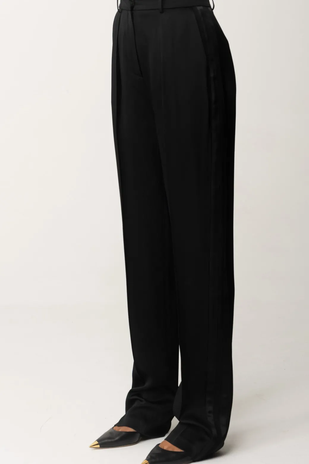 Pantaloni Elisabetta Franchi taglio dritto, realizzati in enver satin lucido e caratterizzati da pinces frontali che ne sottolineano l’eleganza e il design classico, perfetti per i tuoi look più formali e chic. Ma se provassi ad abbinarli ad una t-shirt stampata e delle sneakers? Avrai ottenuto un outfit originale, una commistione di mood da vera fashionista.