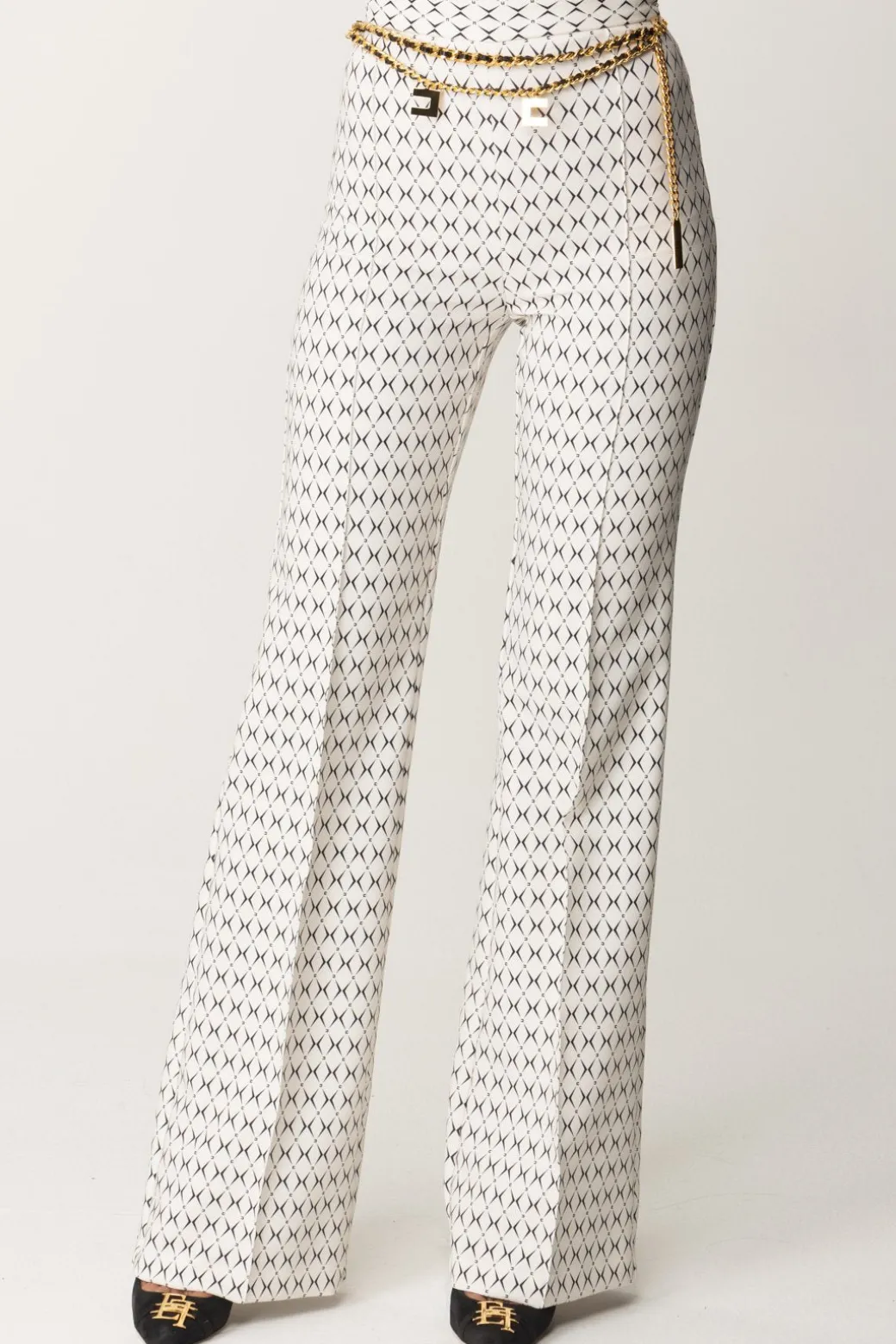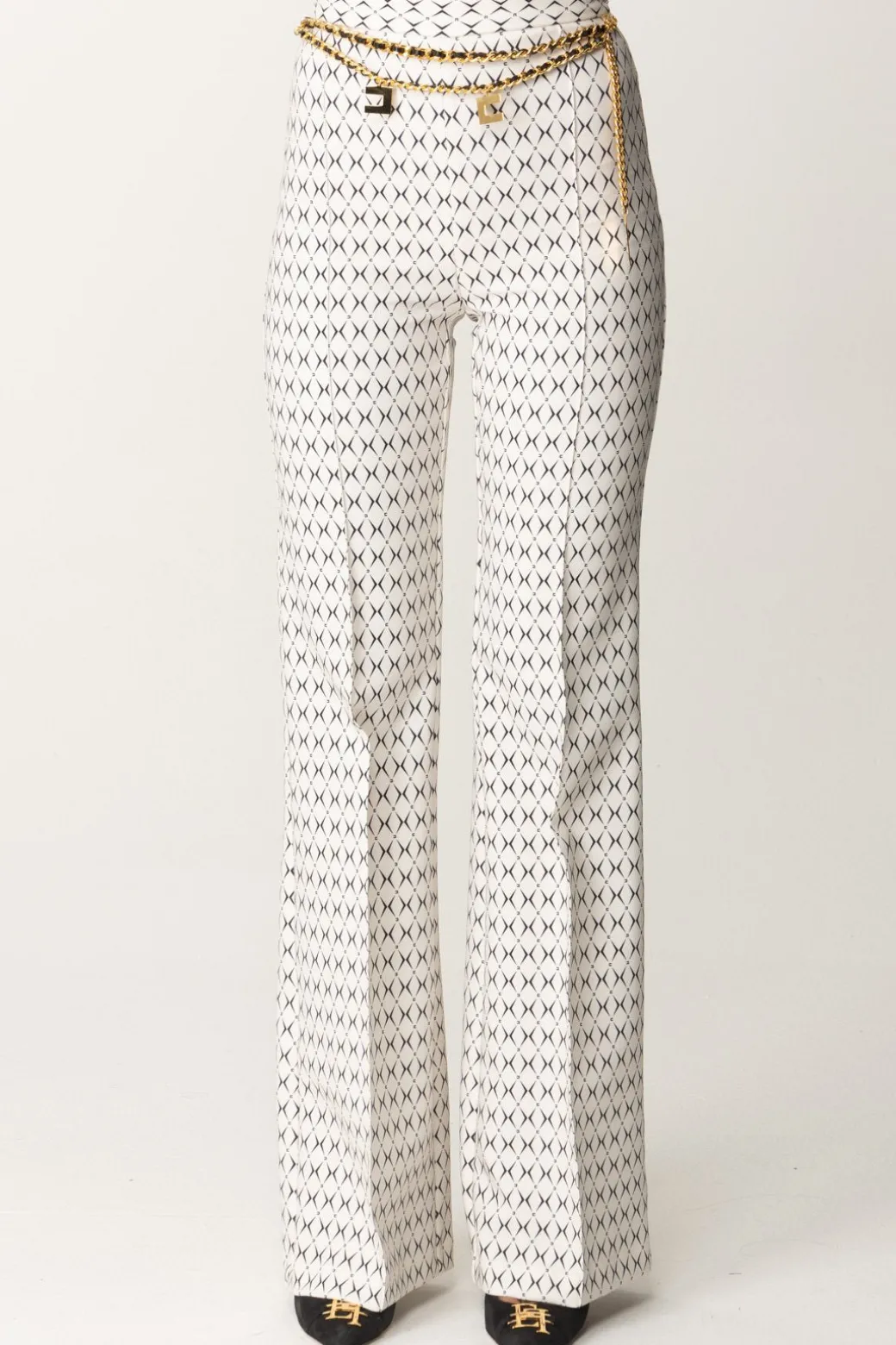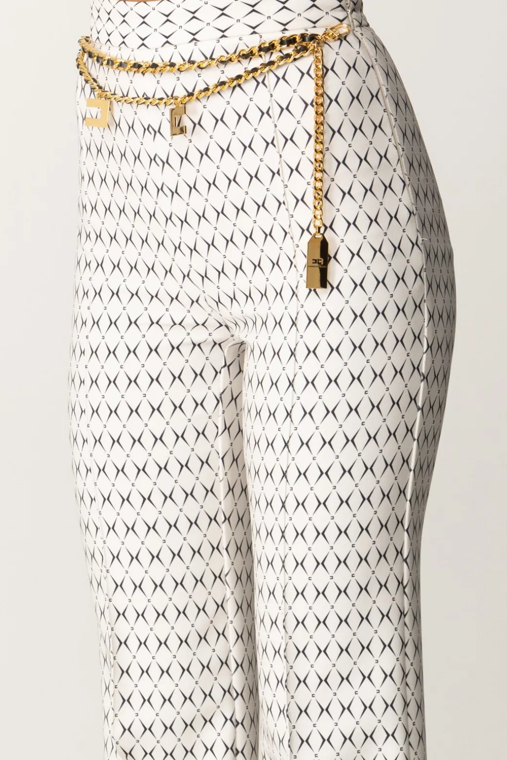 Pantaloni Elisabetta Franchi da taglio a palazzo, con vita alta e gamba ampie e lunga contrassegnata da piping frontale. Classici solo nel taglio, sono caratterizzati da una delle stampe di stagione – la stampa rombo – e impreziositi dalla presenza di un accessorio catena con logo charms e nastro infilato, che puoi rimuovre all’occorrenza per rendere la tua mise più sobria o sfoggiare con tutto il suo potere catchy.