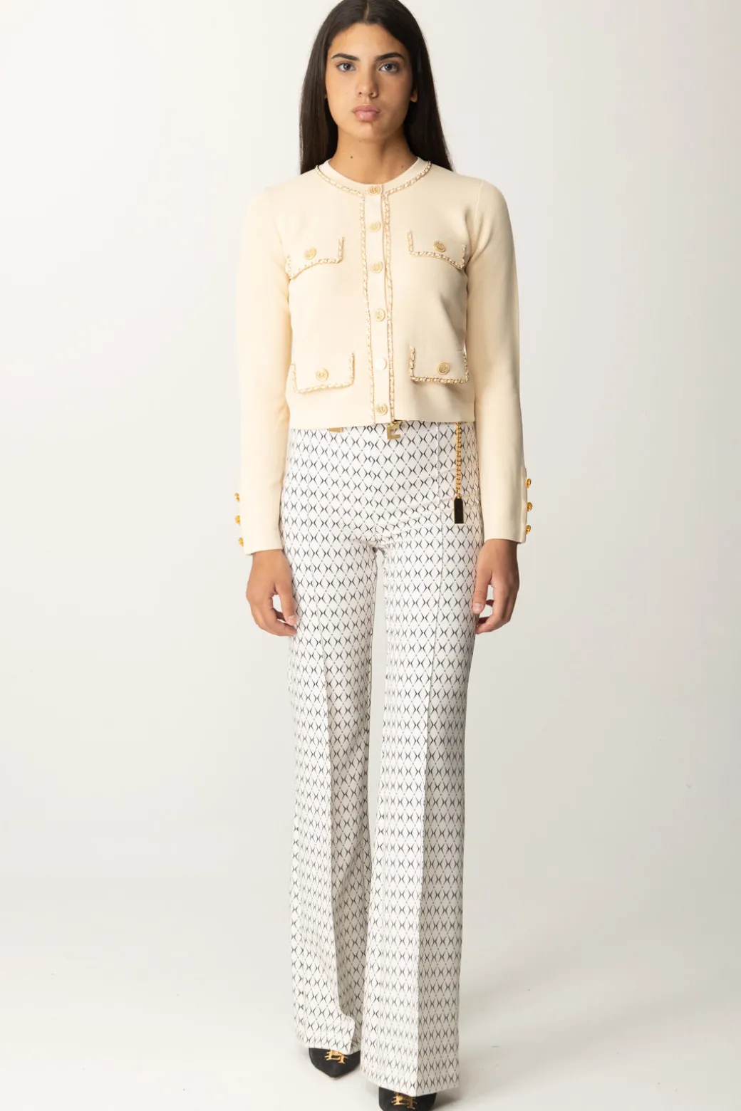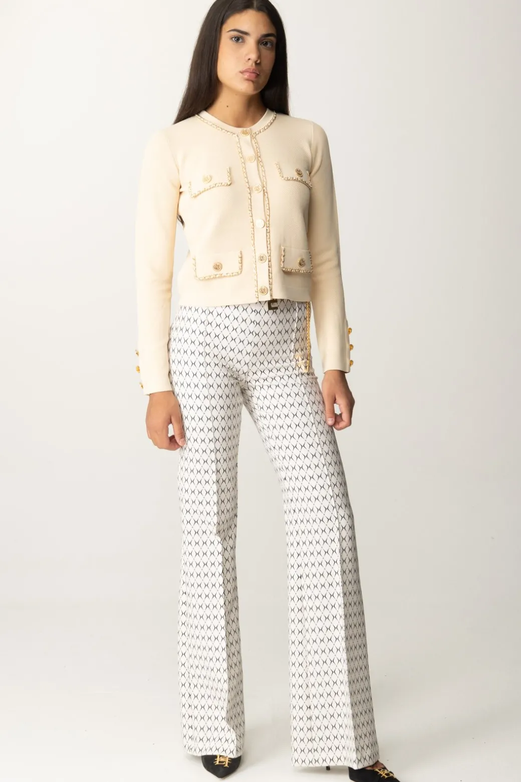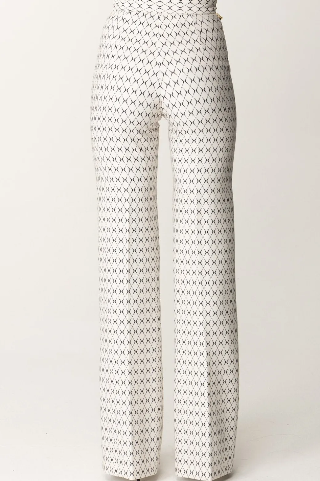 Pantaloni Elisabetta Franchi da taglio a palazzo, con vita alta e gamba ampie e lunga contrassegnata da piping frontale. Classici solo nel taglio, sono caratterizzati da una delle stampe di stagione – la stampa rombo – e impreziositi dalla presenza di un accessorio catena con logo charms e nastro infilato, che puoi rimuovre all’occorrenza per rendere la tua mise più sobria o sfoggiare con tutto il suo potere catchy.