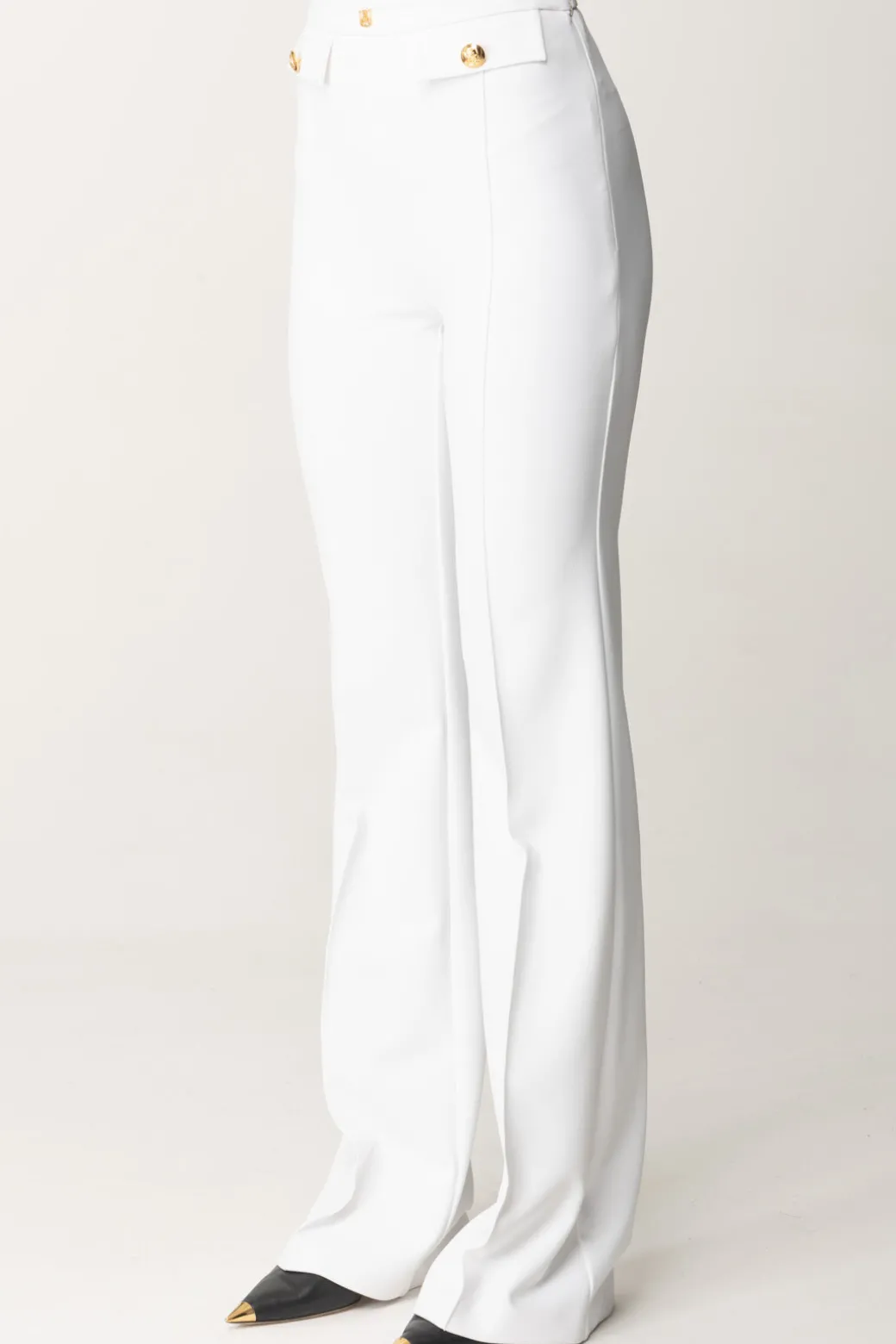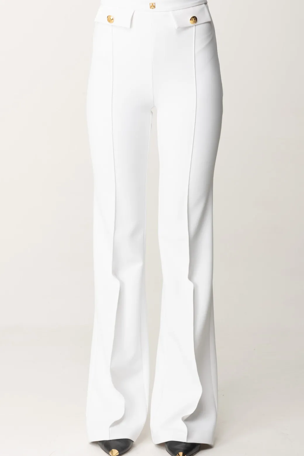Classici, e per questo eleganti in ogni aspetto: questi pantaloni Elisabetta Franchi con taglio a palazzo sono una garanzia per i tuoi look formali, a cui daranno quel tocco di monumentalità e ricercatezza. Patte al punto vita e rivetto con logo, perfetti con body camicia e top crop bustier.