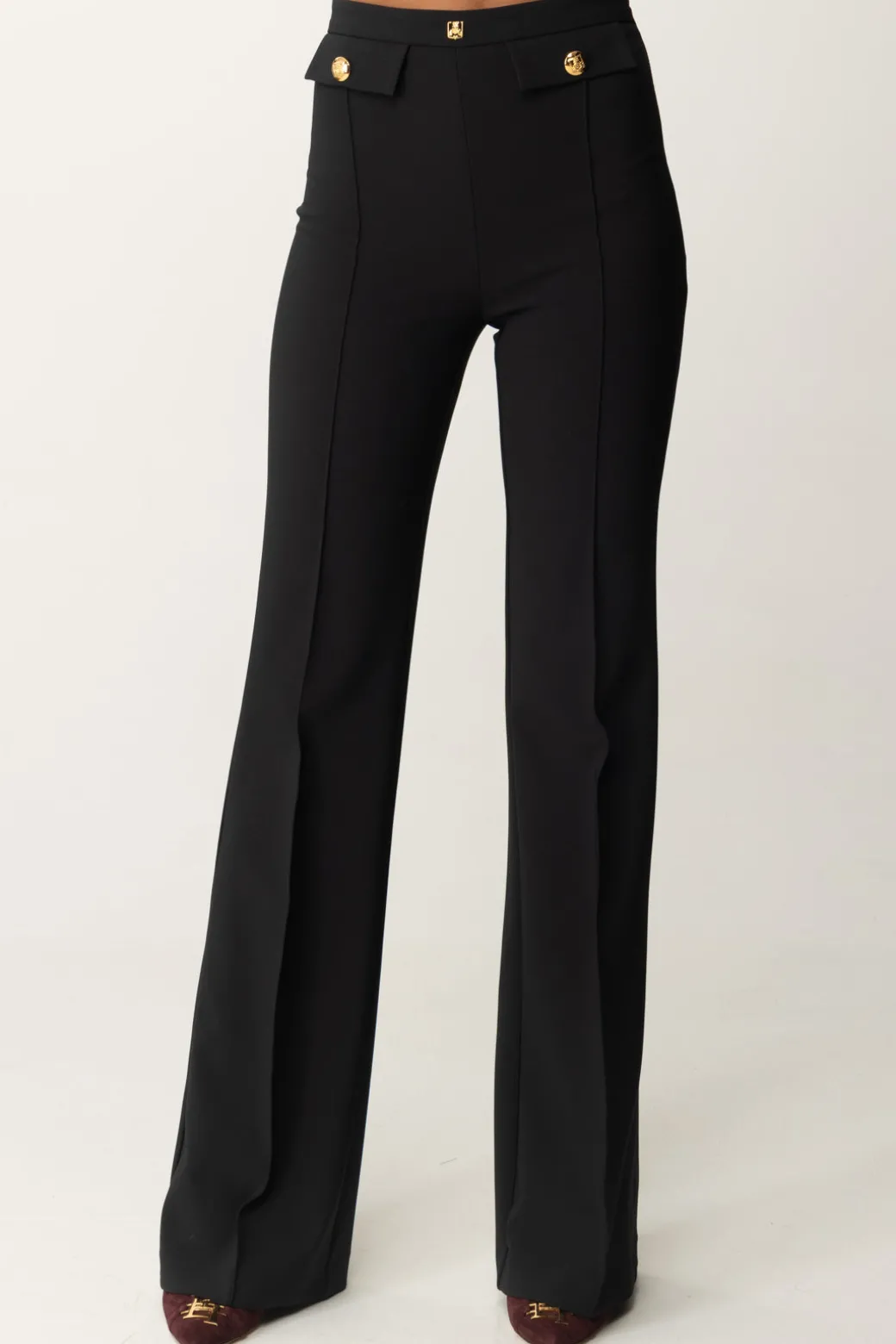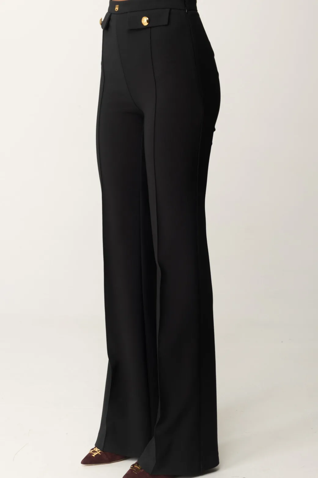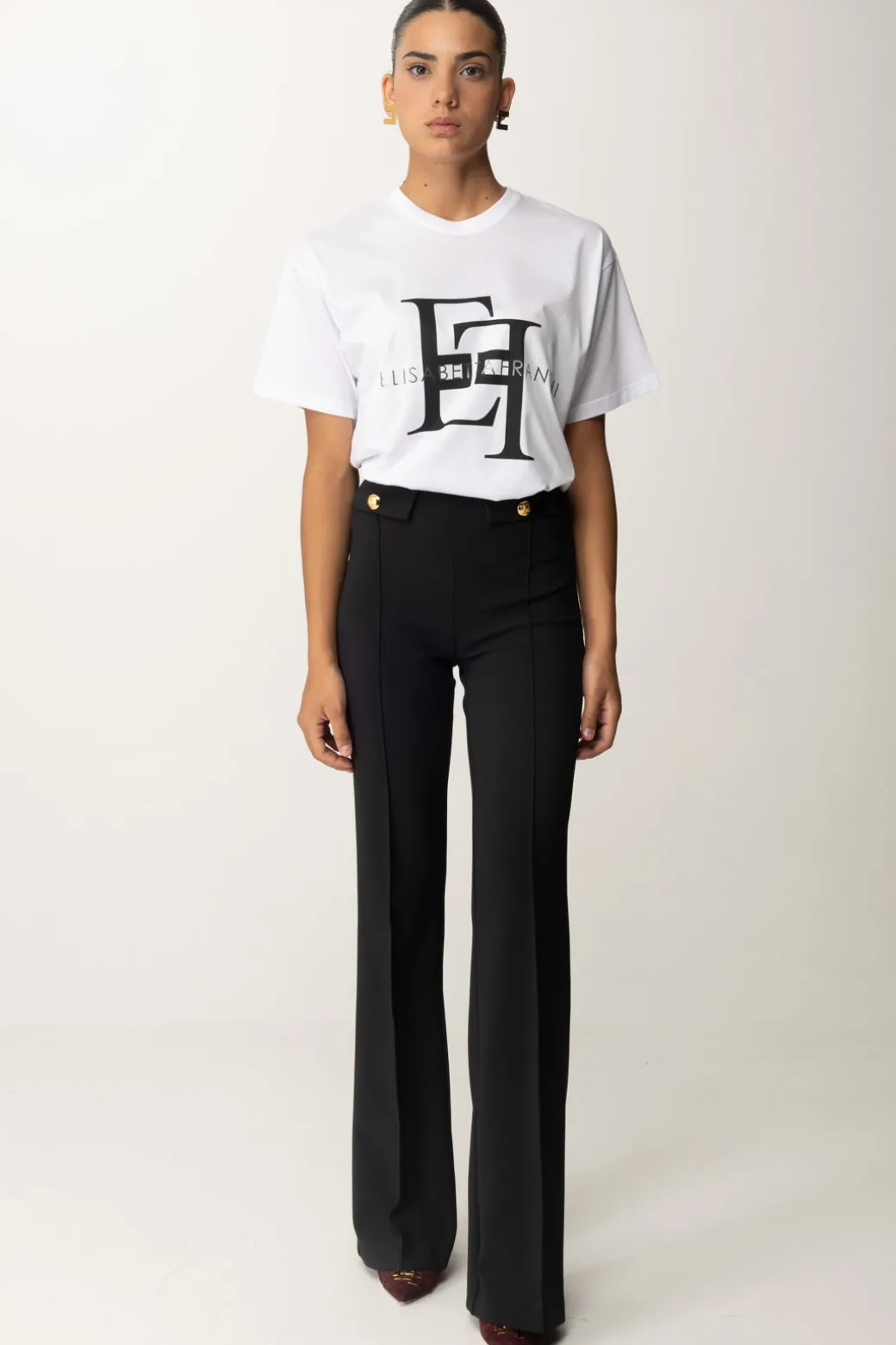 Classici, e per questo eleganti in ogni aspetto: questi pantaloni Elisabetta Franchi con taglio a palazzo sono una garanzia per i tuoi look formali, a cui daranno quel tocco di monumentalità e ricercatezza. Patte al punto vita e rivetto con logo, perfetti con body camicia e top crop bustier.