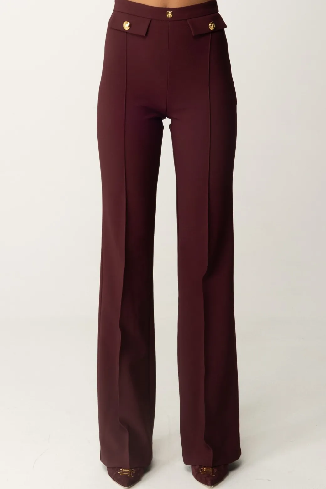 Classici, e per questo eleganti in ogni aspetto: questi pantaloni Elisabetta Franchi con taglio a palazzo sono una garanzia per i tuoi look formali, a cui daranno quel tocco di monumentalità e ricercatezza. Patte al punto vita e rivetto con logo, perfetti con body camicia e top crop bustier.