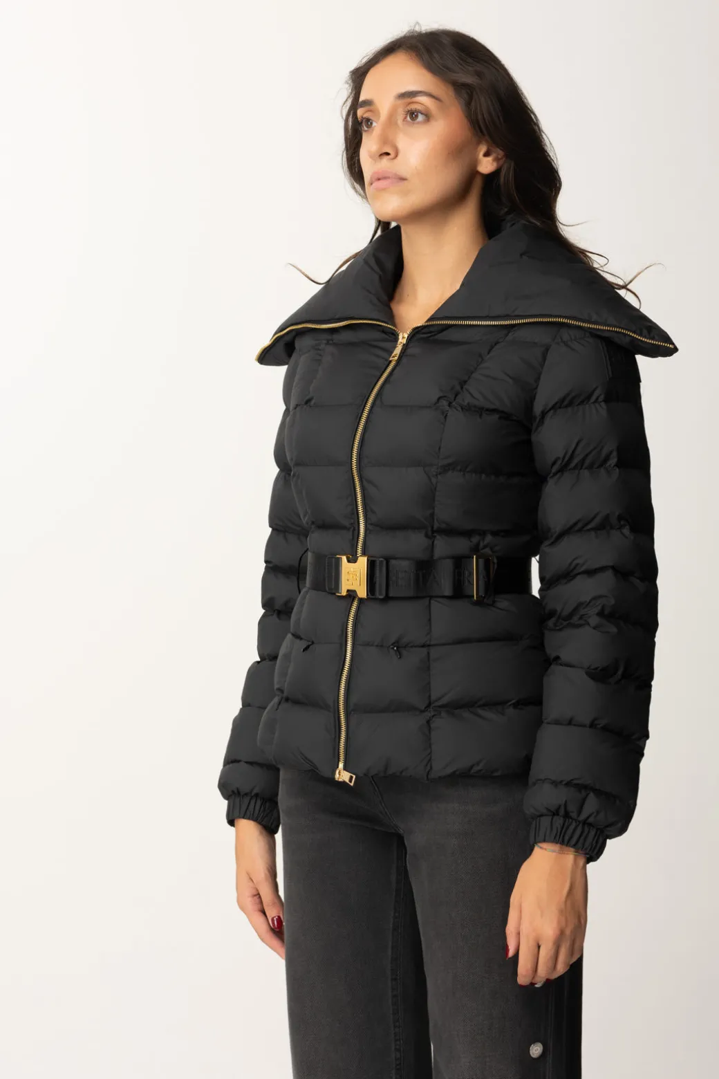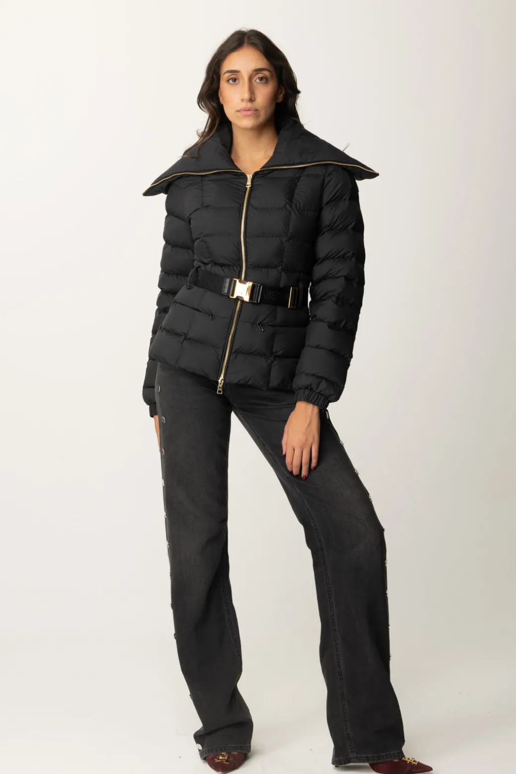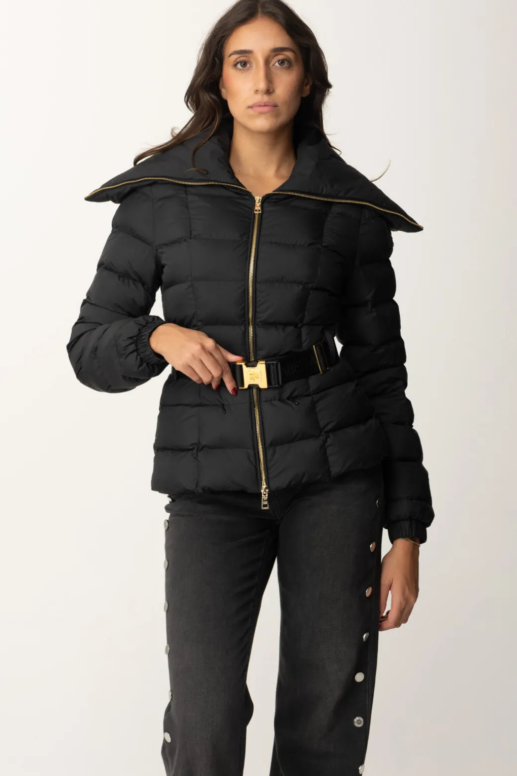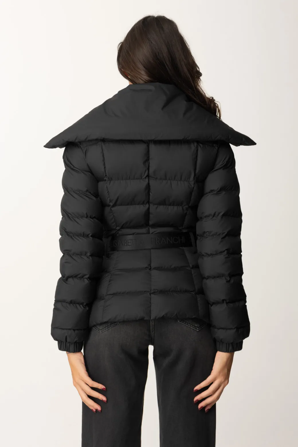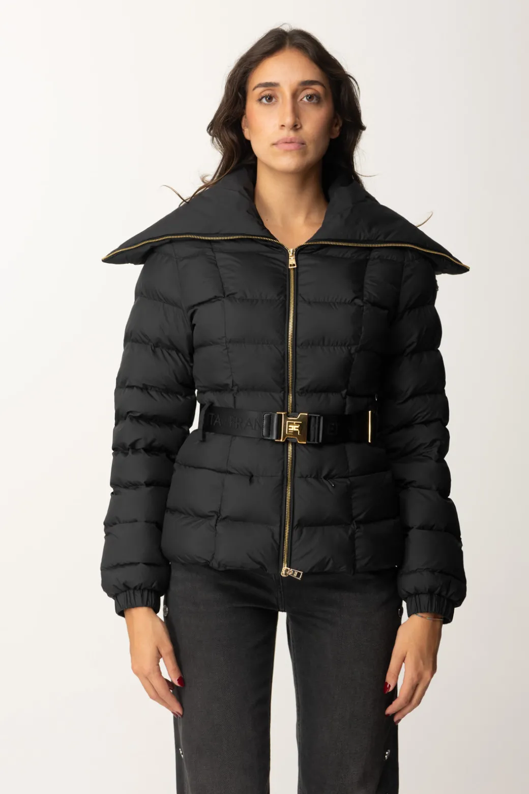 Piumino Elisabetta Franchi molto semplice e classy, caratterizzato da maxi collo, che poggia sulle spalle, e una cintura logata al punto vita perfetta per enfatizzare la silhouette in ogni tuo “strato”. Cosa non può mandare? Il logo della maison, presente sulla spalla come etichetta gommata.