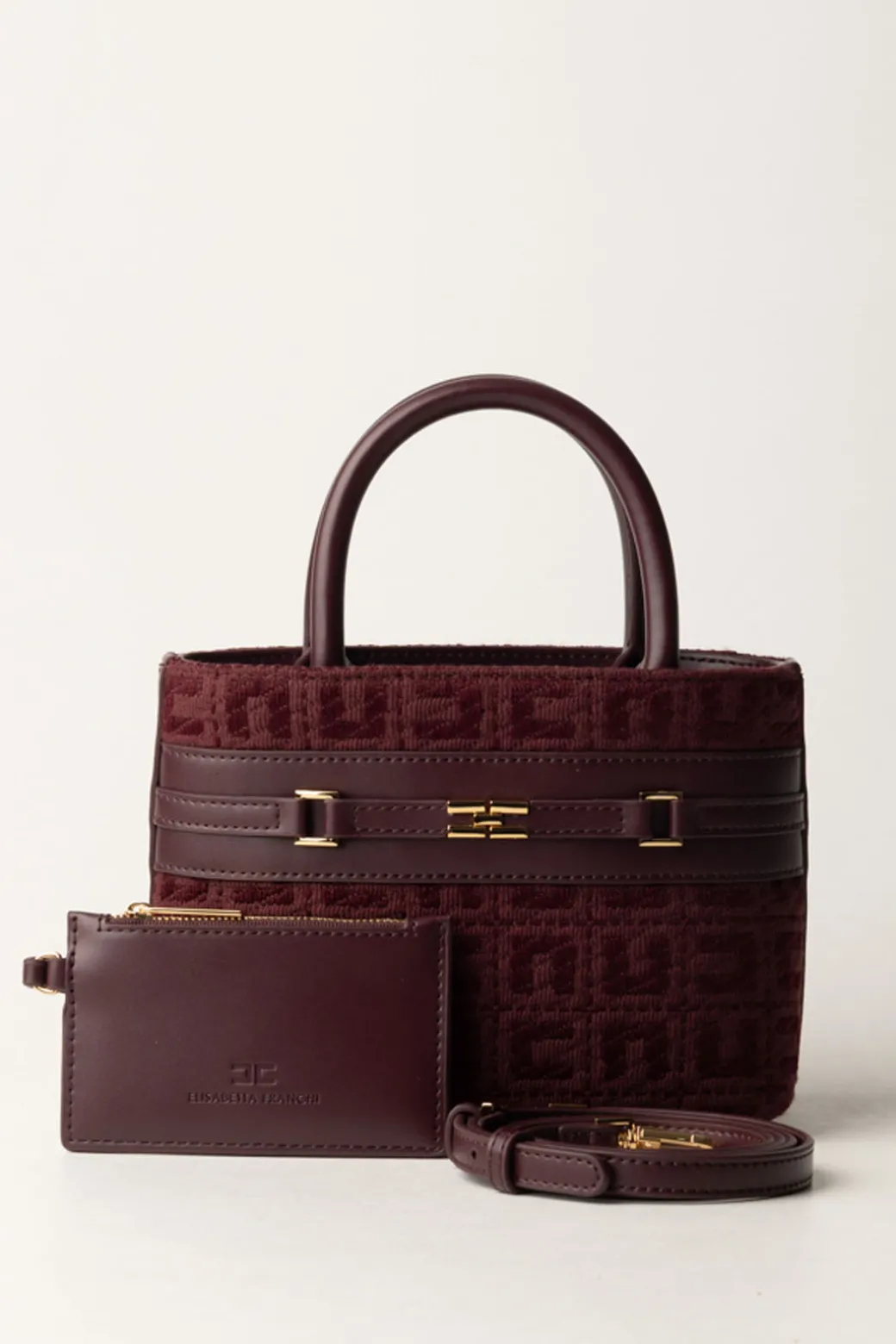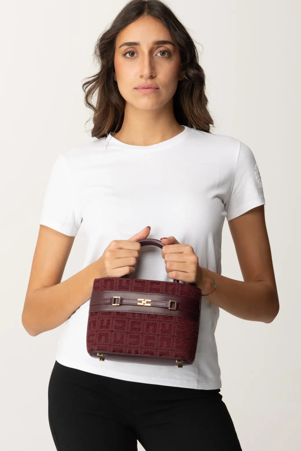Una piccola shopper Elisabetta Franchi pronta a conquistarti! Viene realizzata in tessuto jacquard, arricchita da dettagli in pelle e morsetto logato gold, è l’accessorio perfetto per una donna sofisticata e sempre in movimento, da abbinare a un paio di décolleté nere per un look senza tempo.