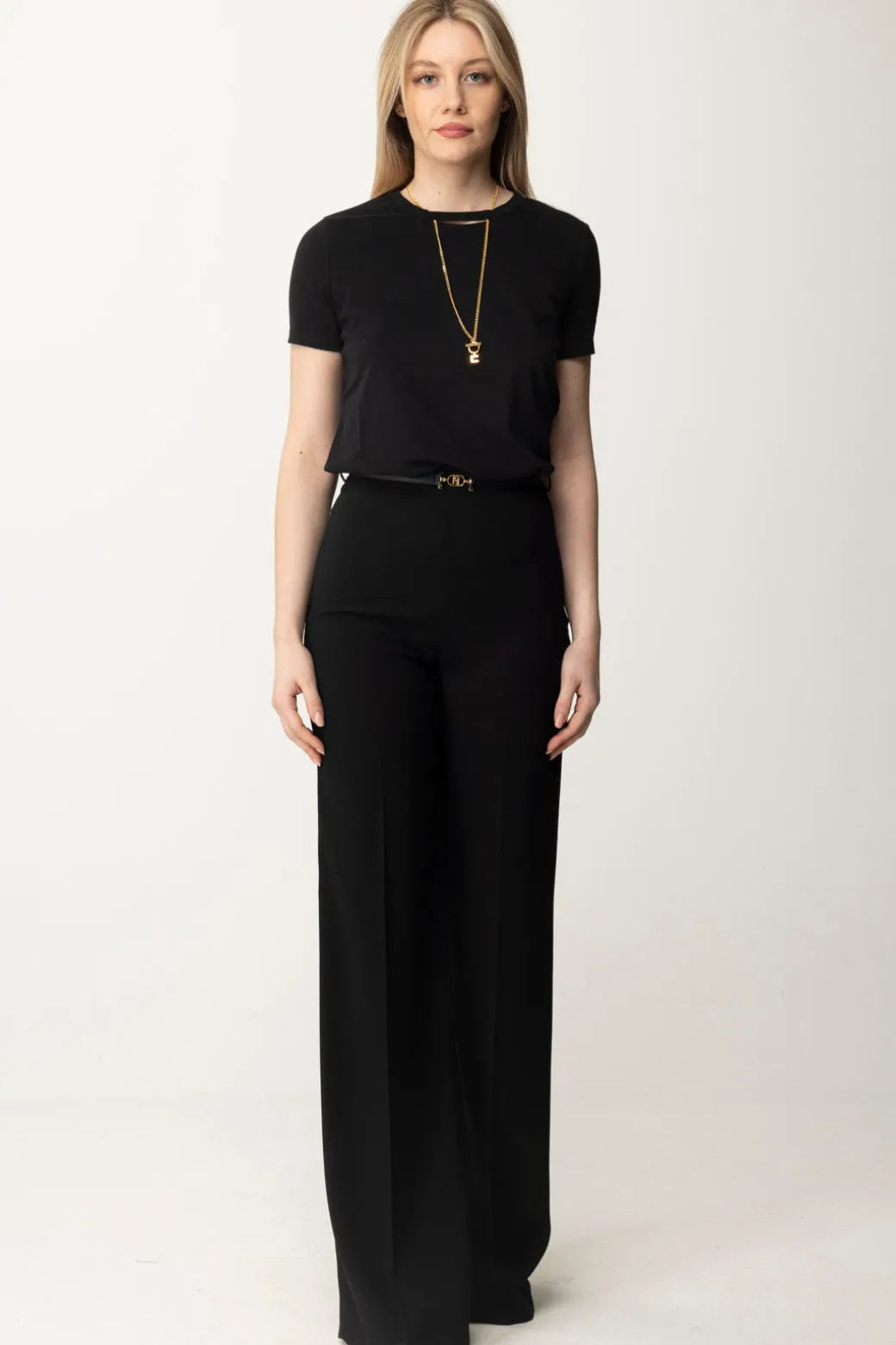 Semplice e al tempo stesso fantasiosa questa t-shirt Elisabetta Franchi, che sfrutta la presenza del cut-out al colletto per inserire una collana logata che impreziosisce con garbo anche il tuo look più casual. Perfetta con tutti i bottom della collezione, oltre che come sottogiacca: scegli solo il colore che più si addice al tuo mood di stagione.