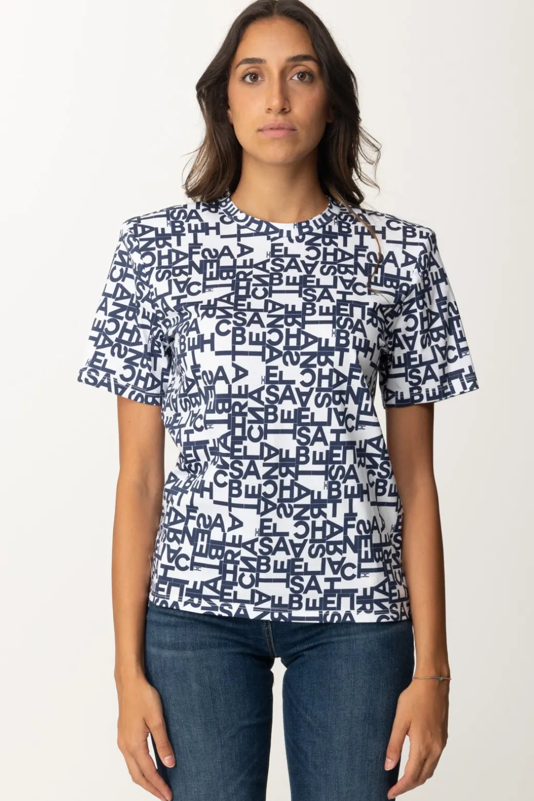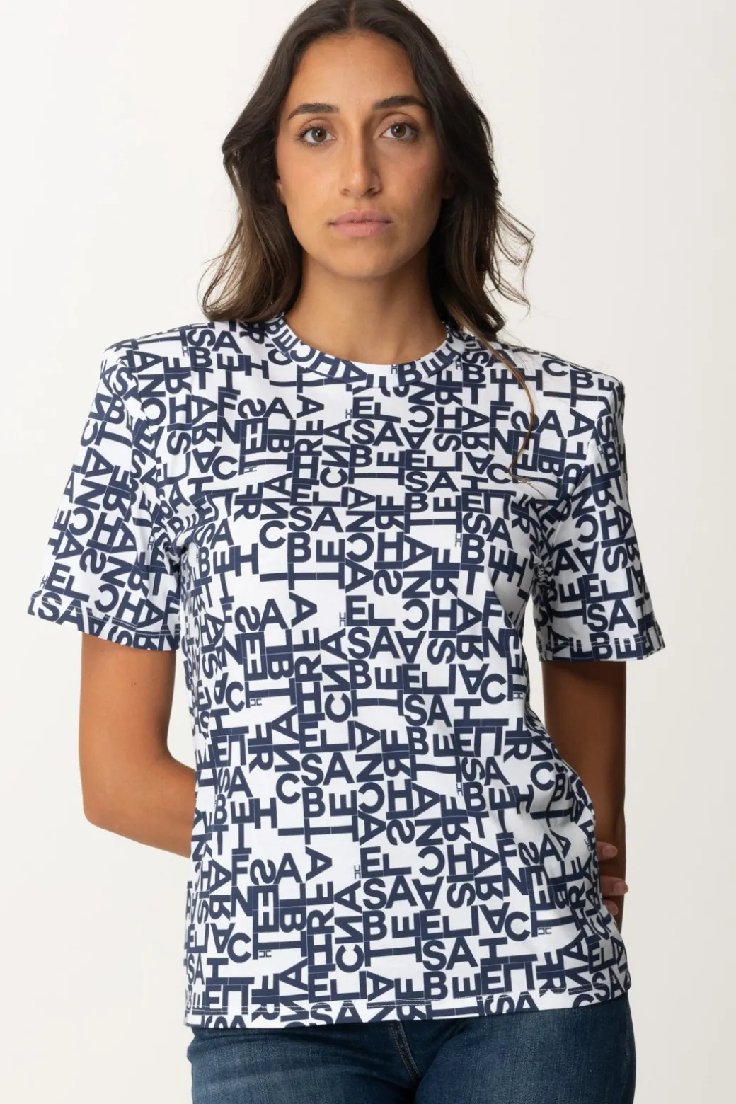 T-shirt Elisabetta Franchi basica, caratterizzata dal logo lettering del brand utilizzato come pattern a contrasto di colore, per un risultato stiloso e ipnotico. Spalline imbottite per un tocco retrò, ma non solo: sarà l’espediente perfetto per creare ancora più equilibrio lungo la silhouette, specialmente se abbini questa t-shirt a bottom a vita alta che diano enfasi ai fianchi.