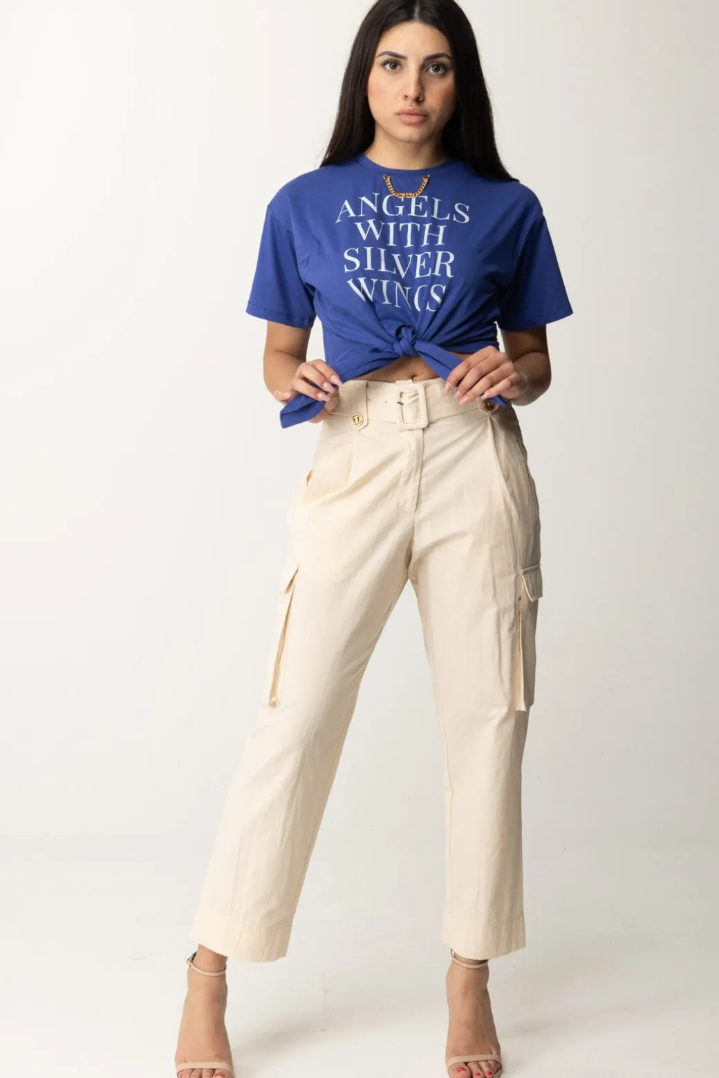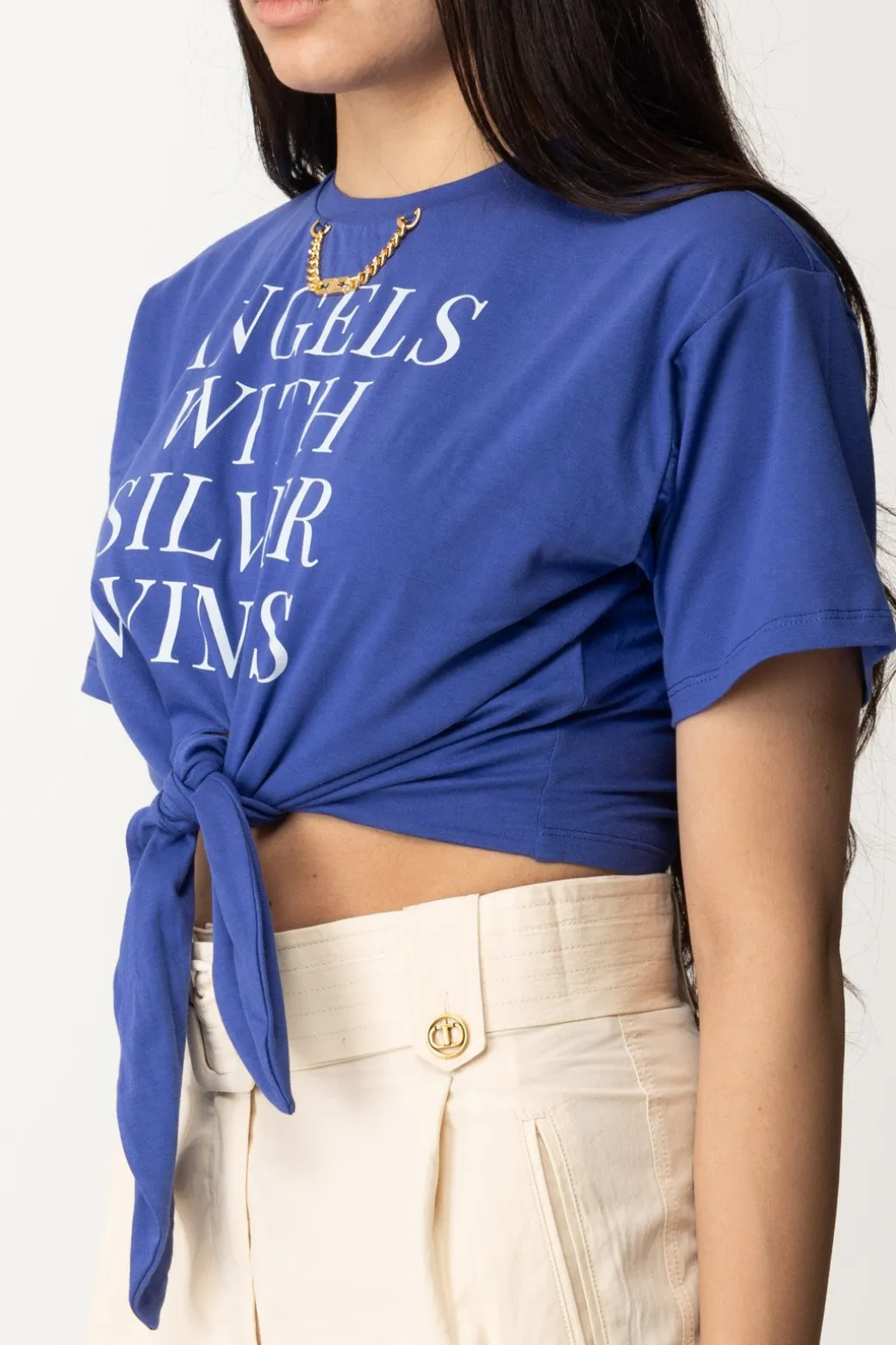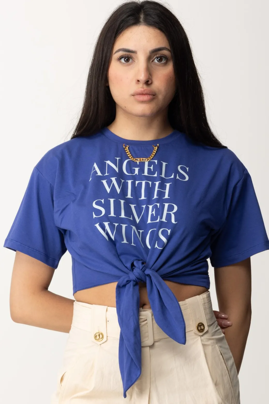 T-shirt Elisabetta Franchi perfetta per i tuoi bottom a vita alta a cui aggiungere un tocco teen grazie al taglio crop evidenziato dal nodo al punto vita. Piccolo dettaglio prezioso: l’accessorio in oro con charms logati al colletto: mai dimenticarti di essere comunque chic!